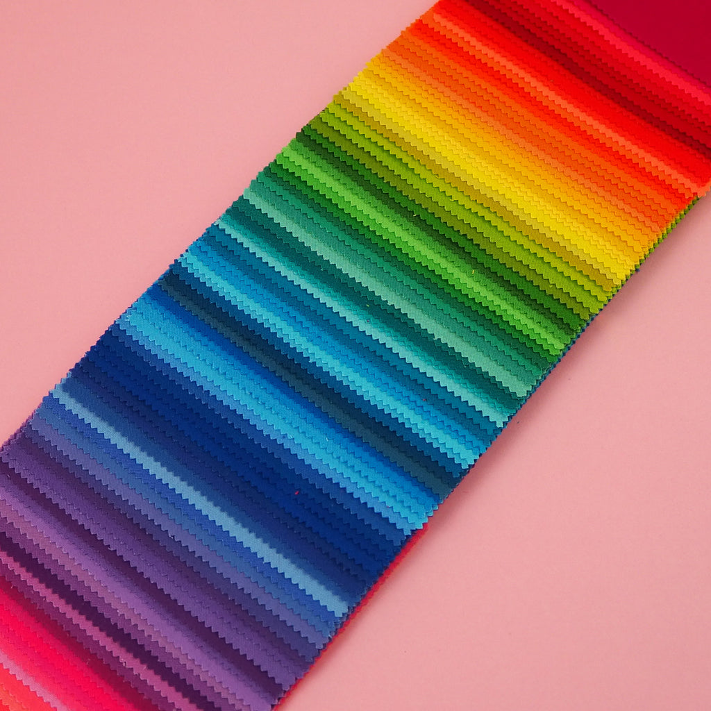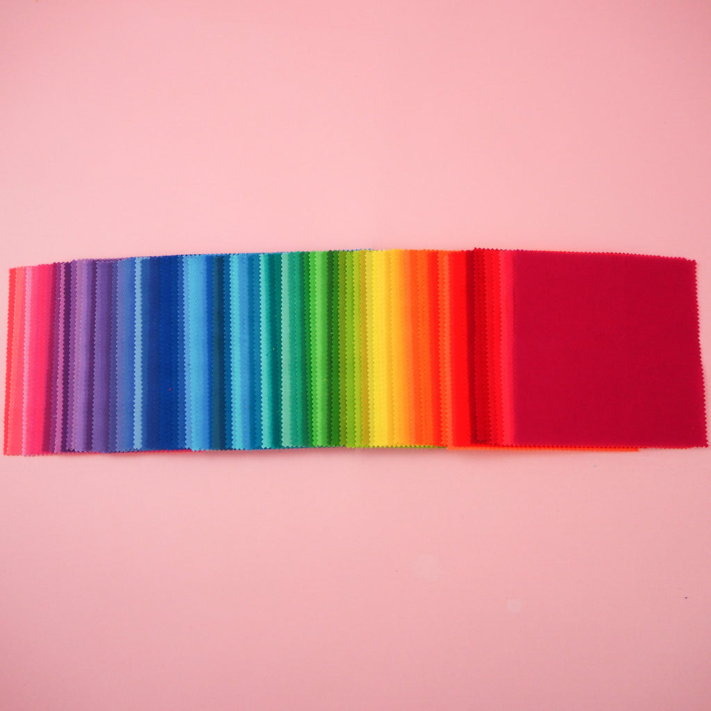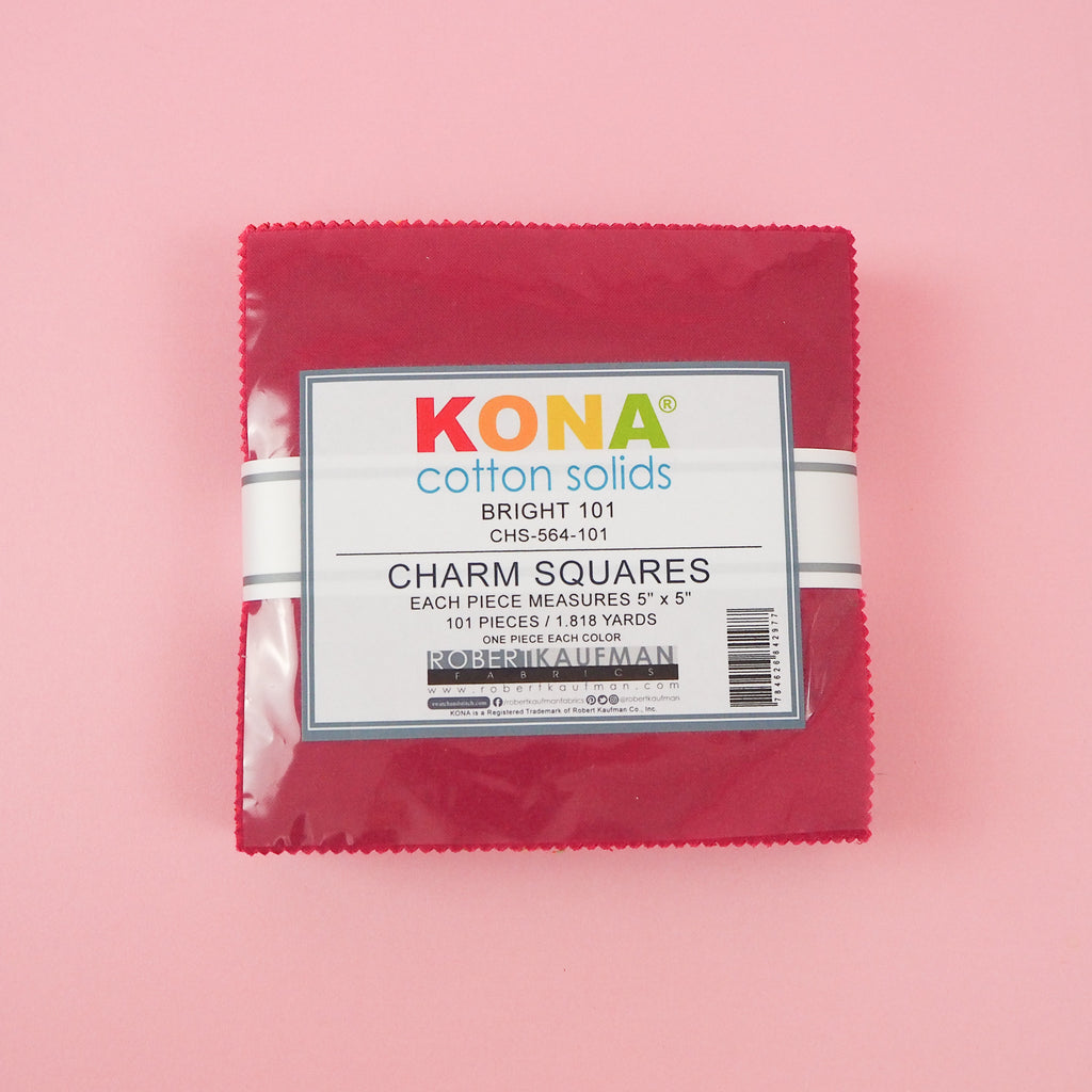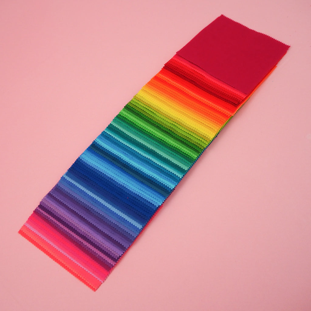 A bright spectrum Kona Charm Pack with 101 fabric squares: every single square is a different colour! Use these for eye-catching rainbow projects.
