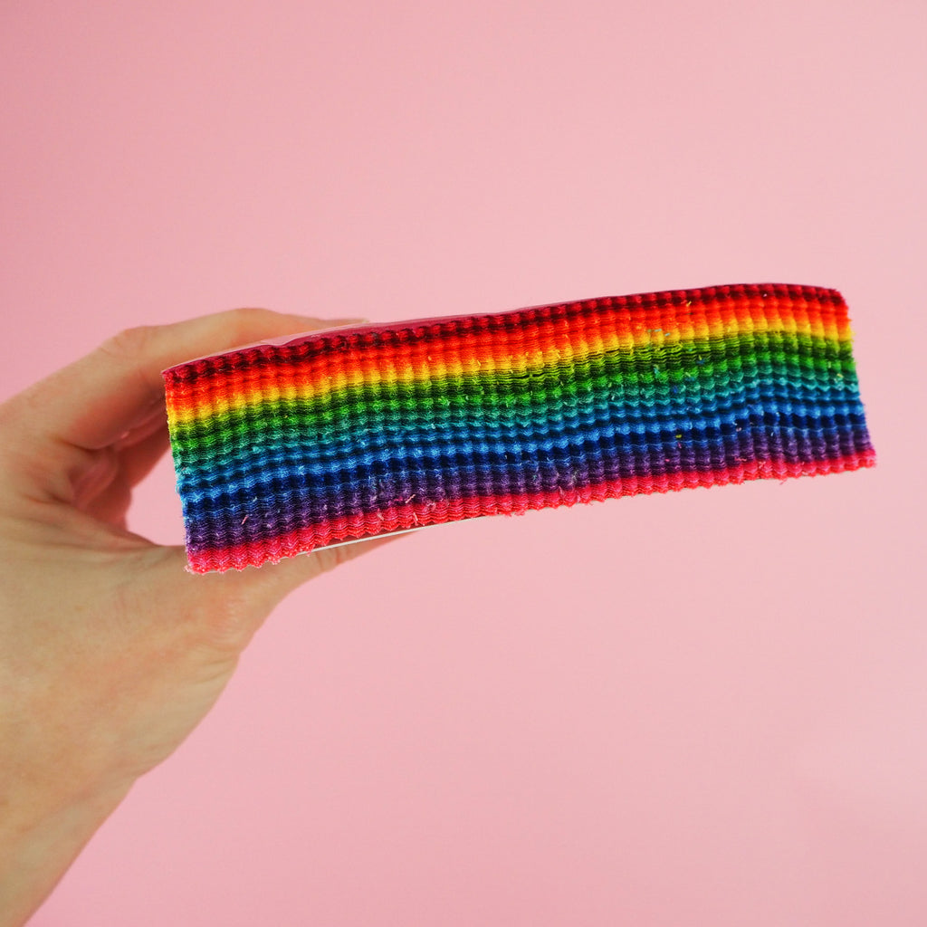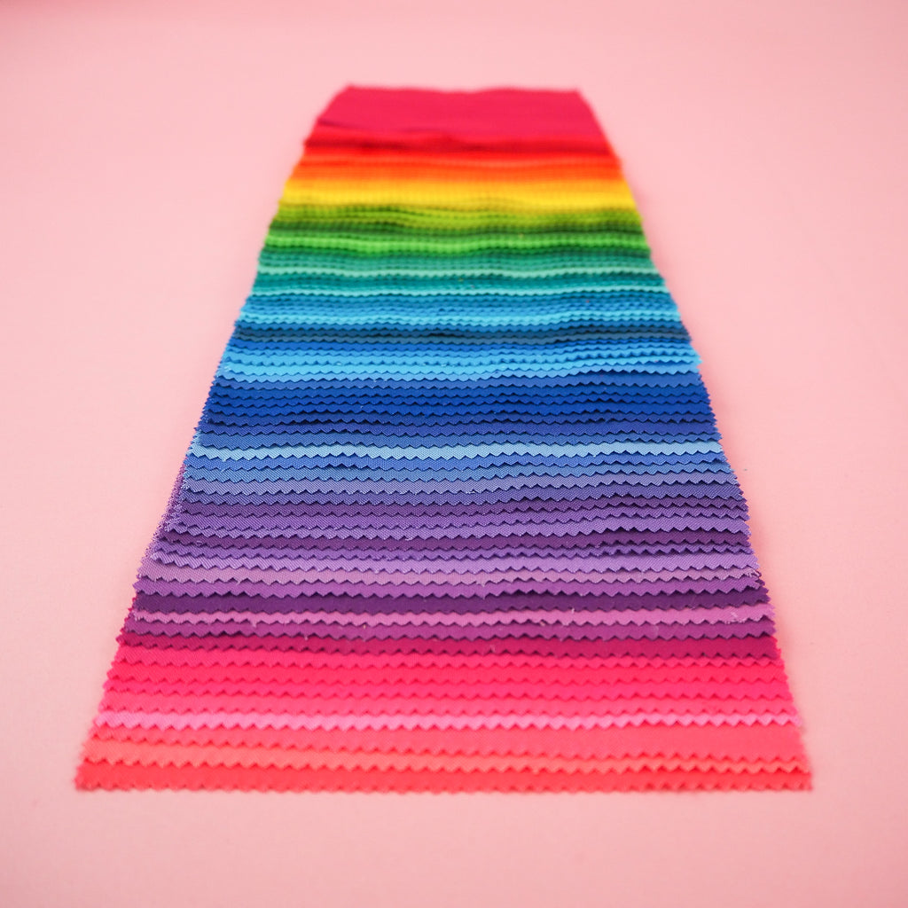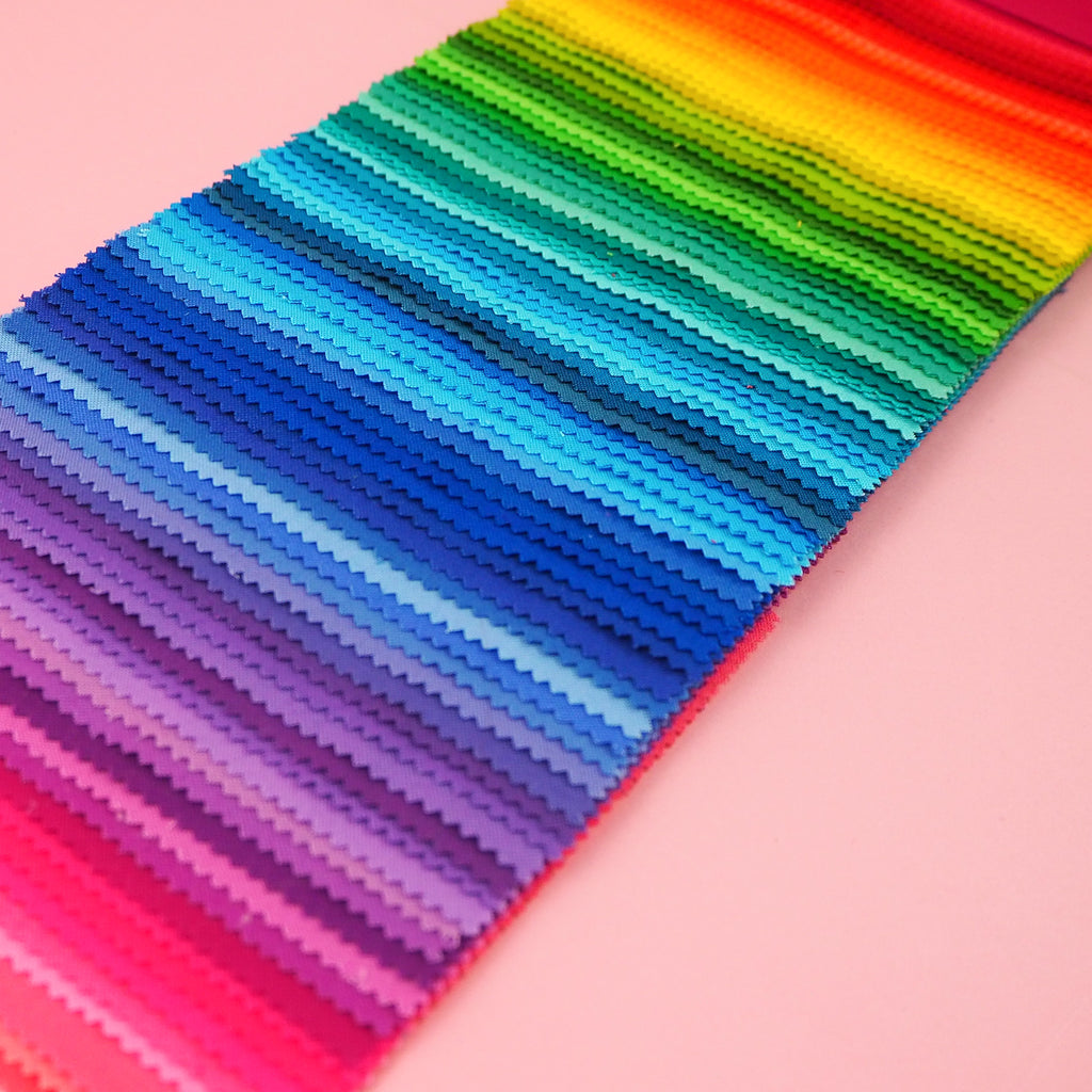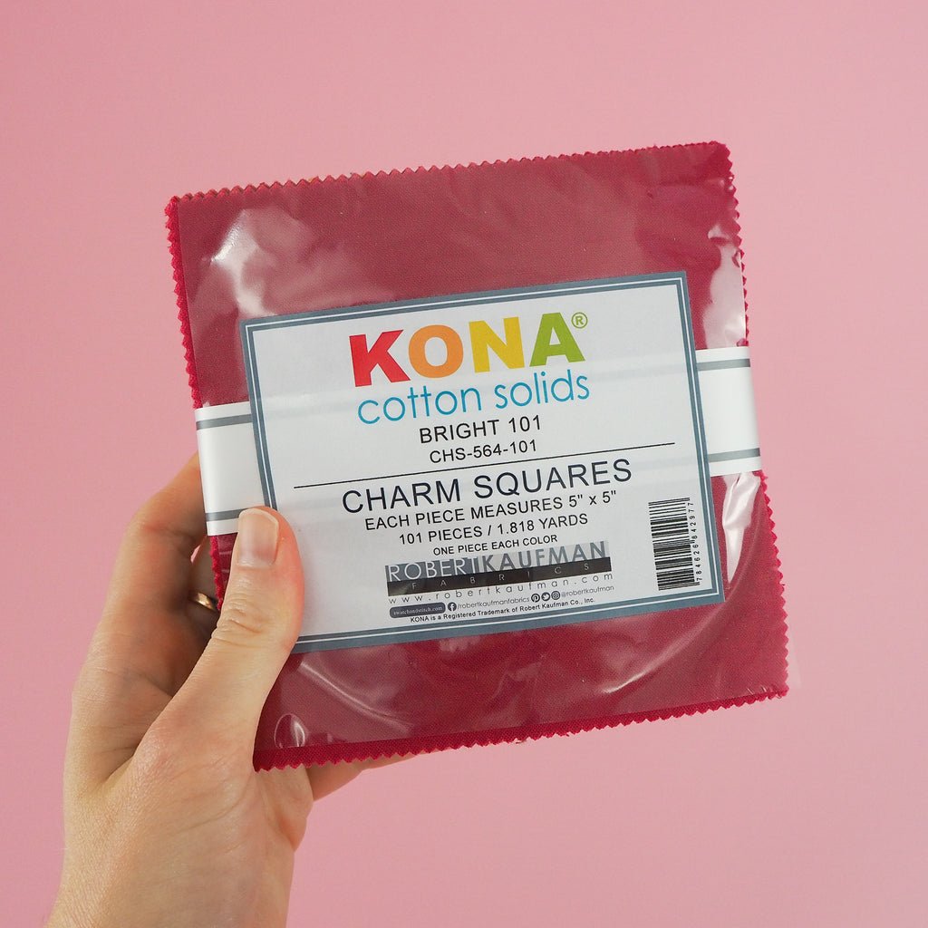 A bright spectrum Kona Charm Pack with 101 fabric squares: every single square is a different colour! Use these for eye-catching rainbow projects.