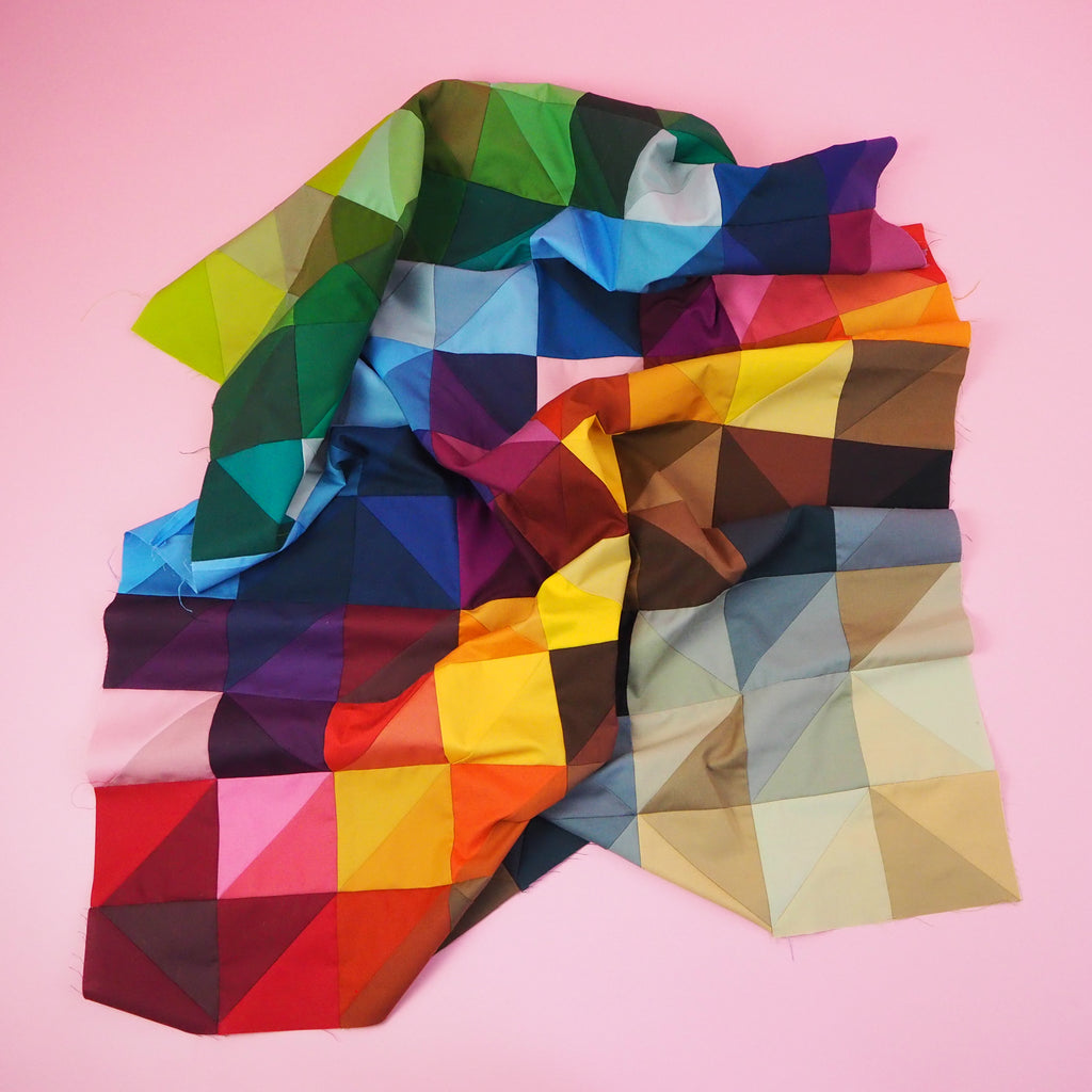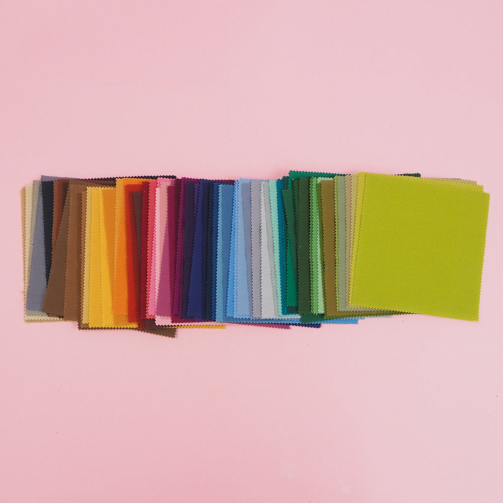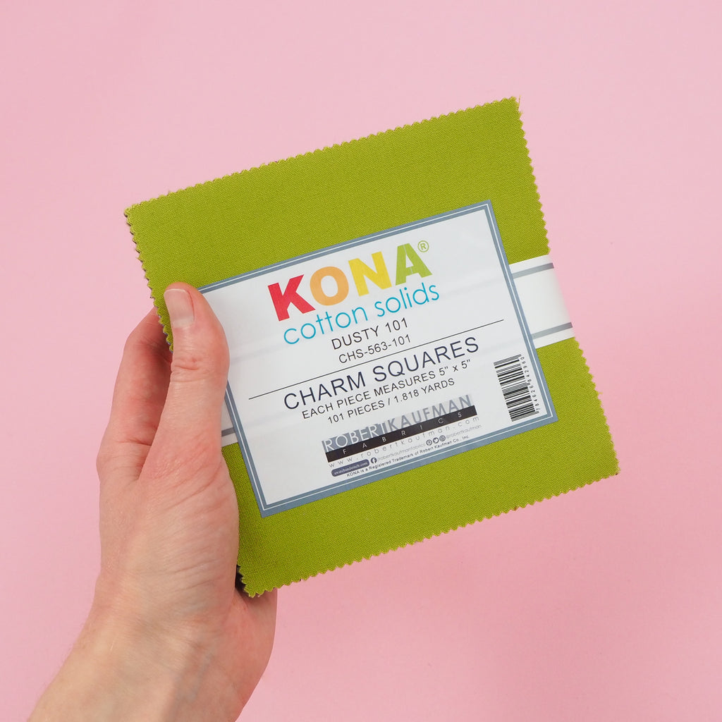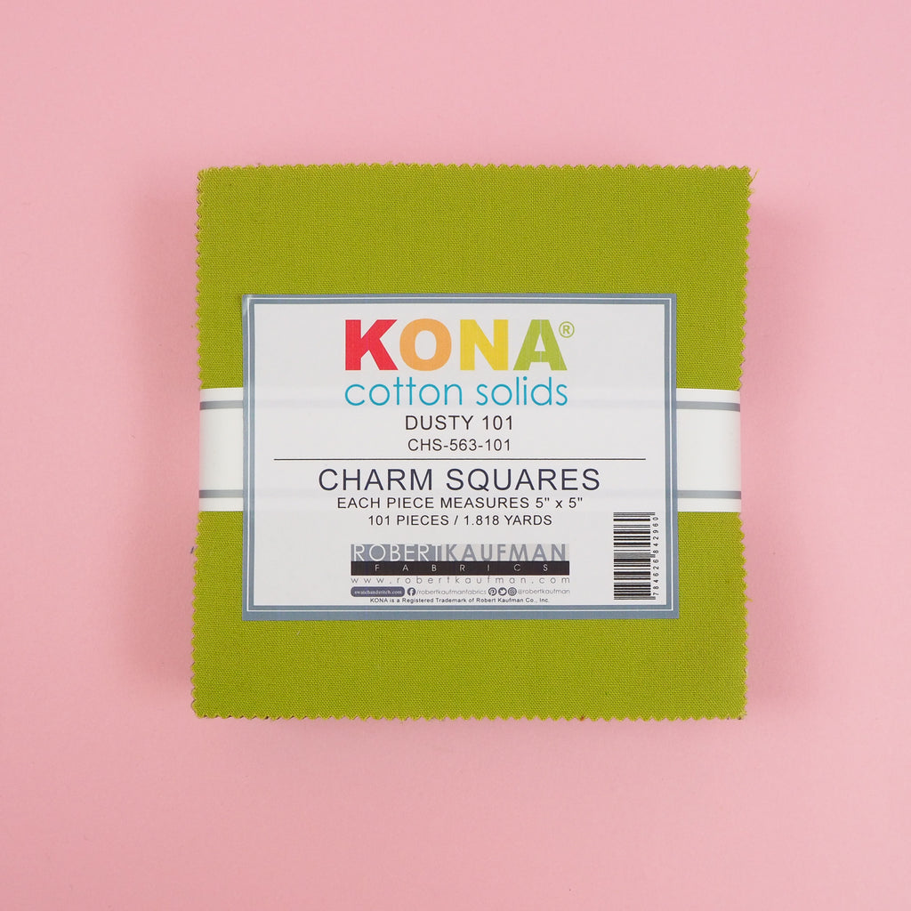 A dusty spectrum Kona Charm Pack with 101 fabric squares: every single square is a different colour! Use these for more muted rainbow projects.