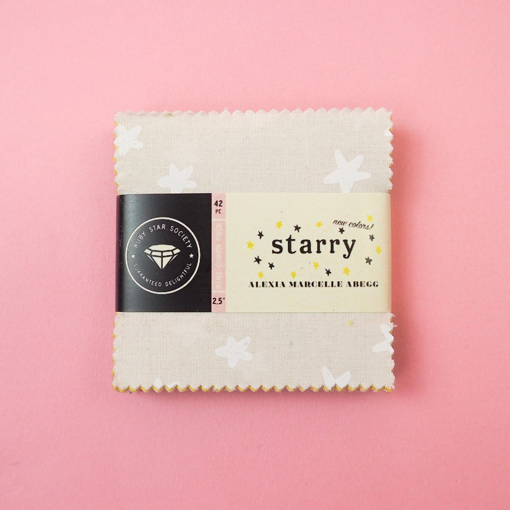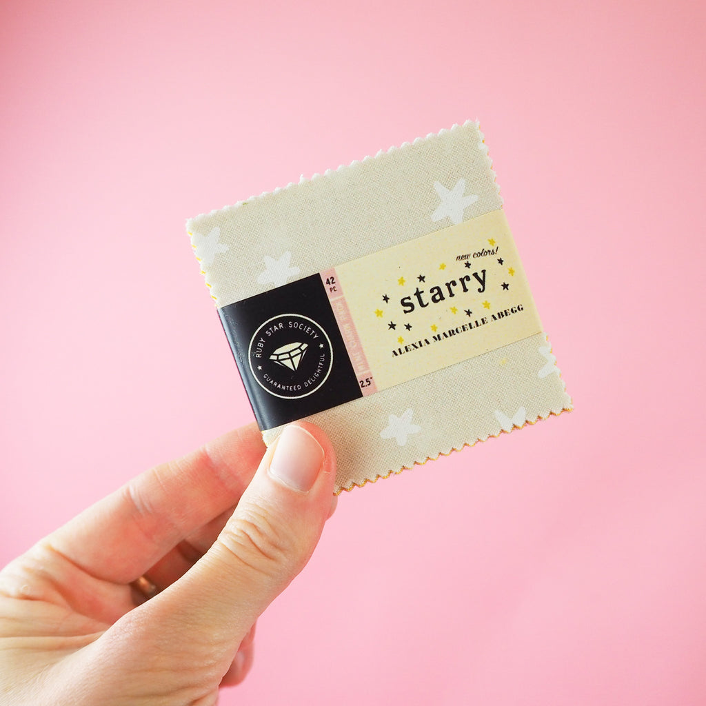 Starry mini charm pack designed by Alexia Marcelle Abegg for Ruby Star Society featuring 42 squares of fabric (some colours will be repeated). Featuring a rainbow collection of colours which covers a spectrum of sweetly muted shades with cute little stars.