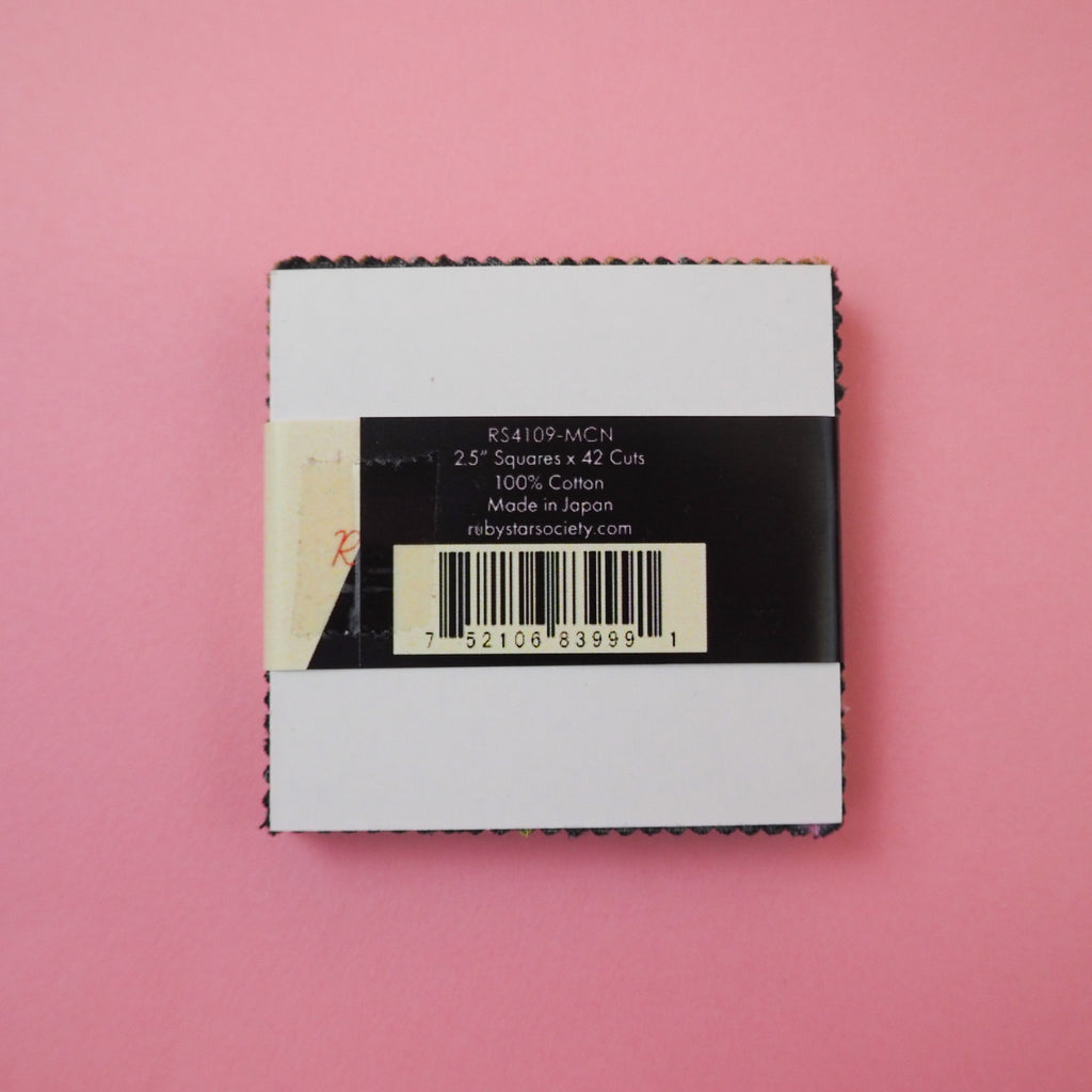 A "Mini Charm Pack" is a collection of various fabrics cut into 2.5 inch squares. They're ideal for easy mini charm quilt making, small projects, or just playing with colour schemes!
