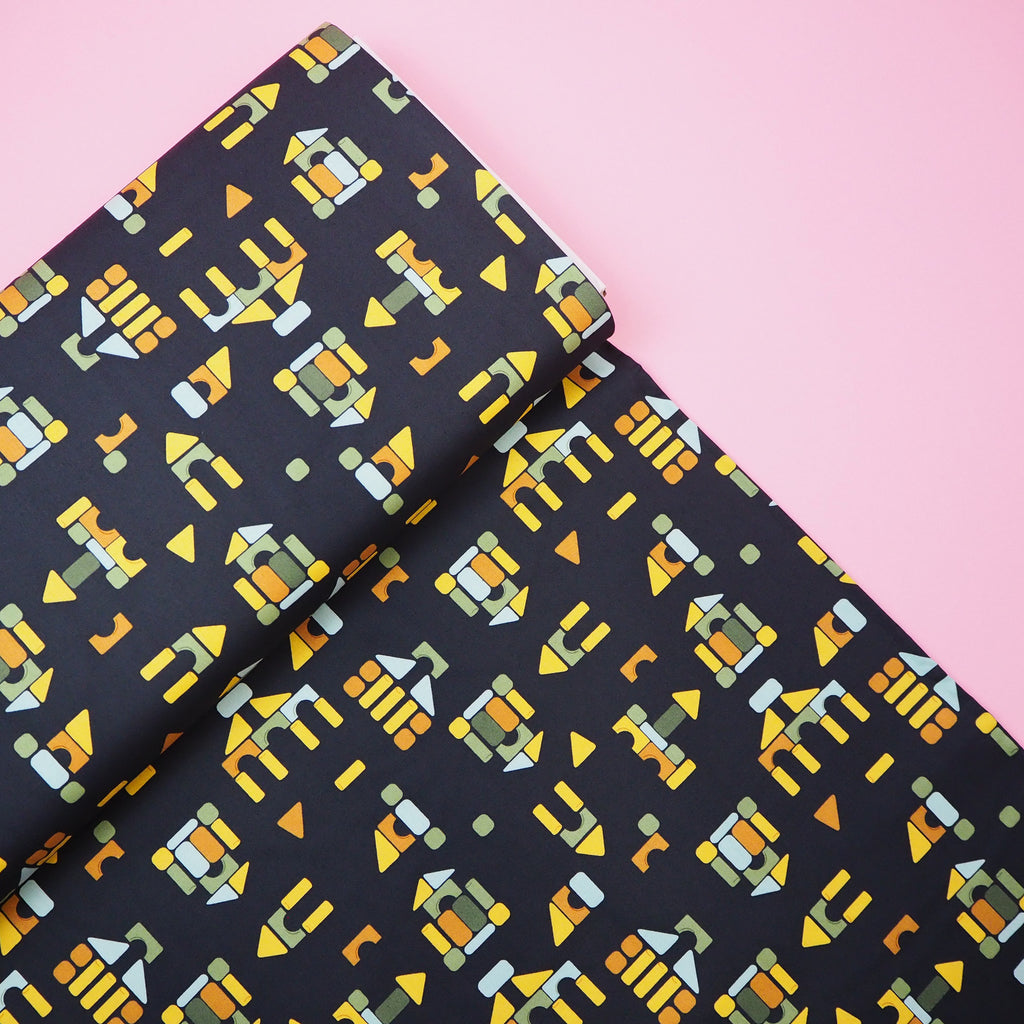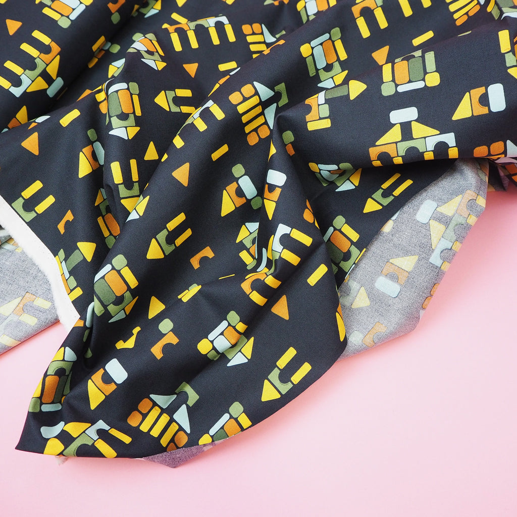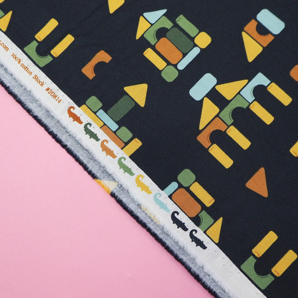 Take a trip back to childhood with this amazing building block print black cotton designed by Stacy Iest Hsu for Moda Fabrics.