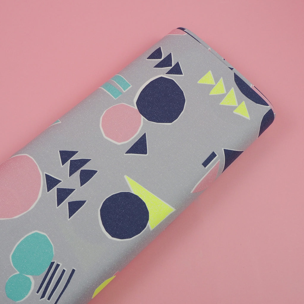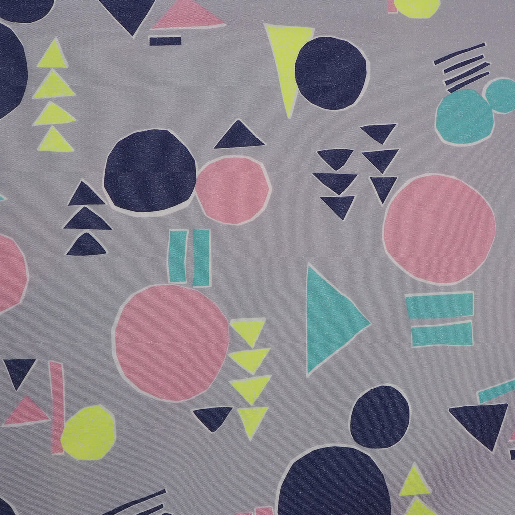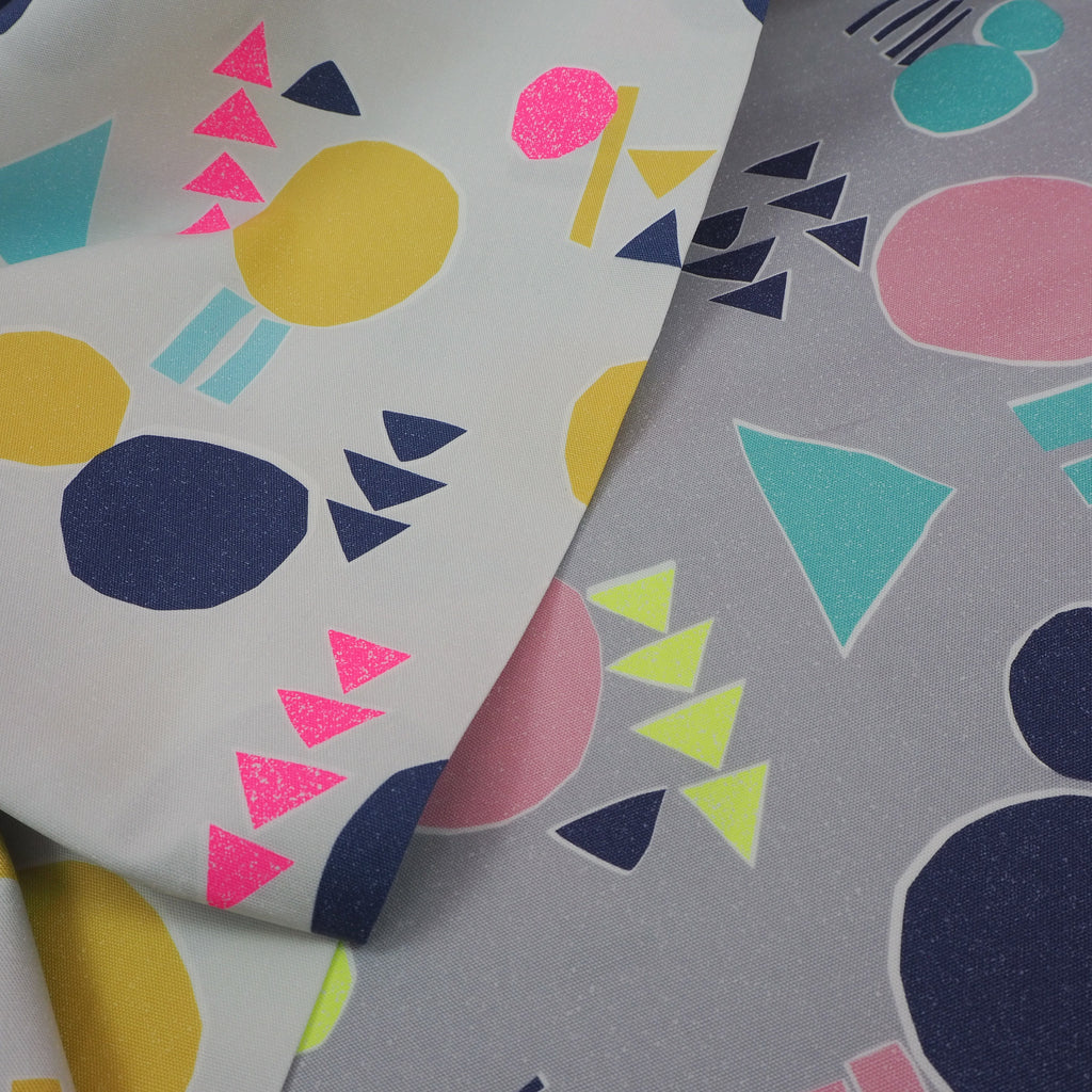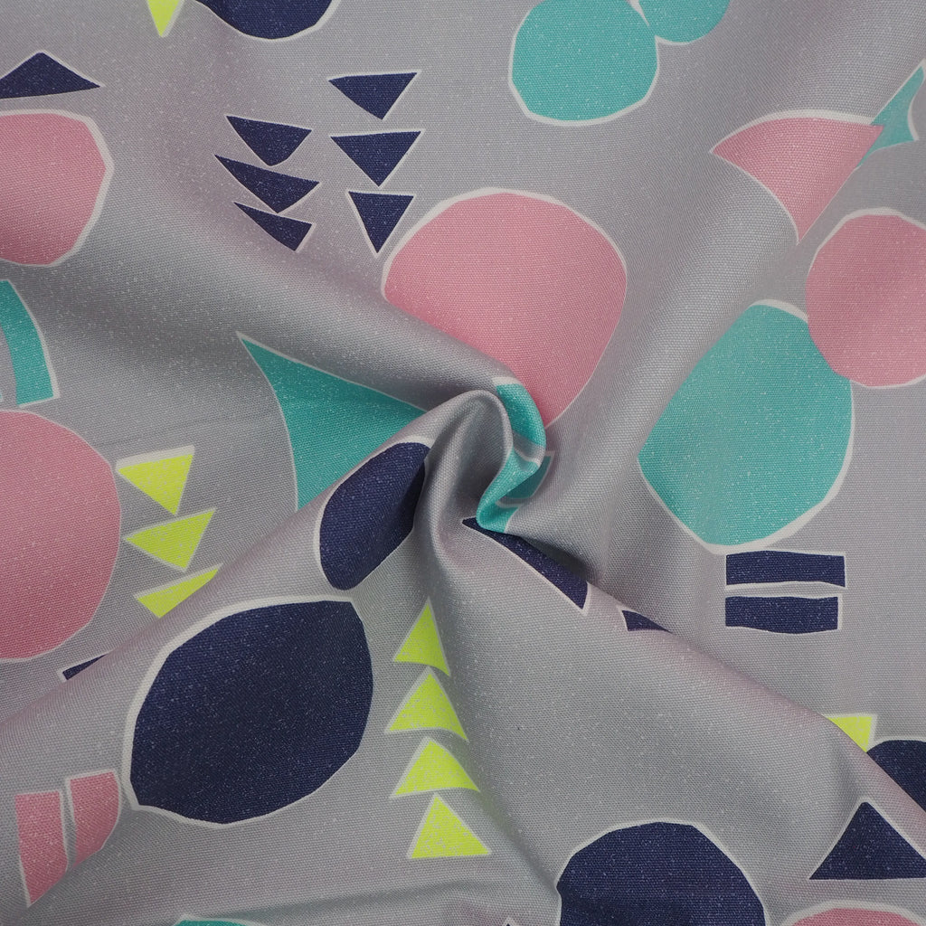 Smokey grey cotton with abstract shapes in blue, navy, pale pink and neon yellow imported from Japan. A bright, unusual pattern on a canvas-style fabric makes this perfect for more structured garments.