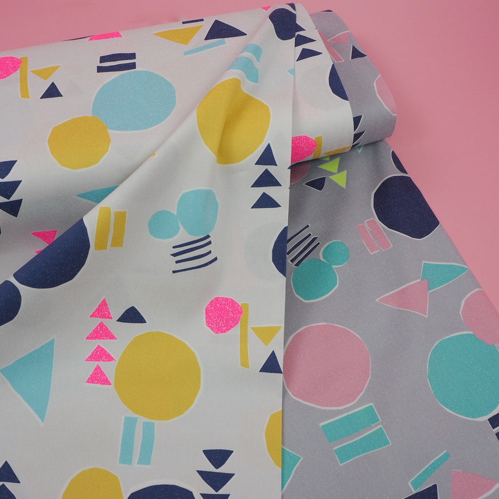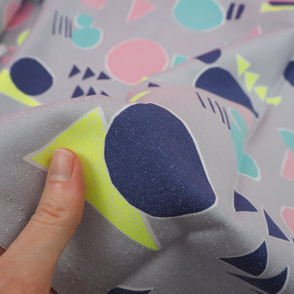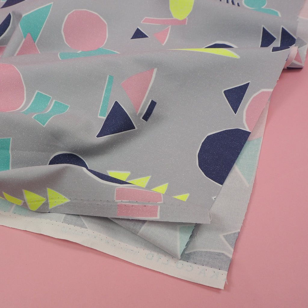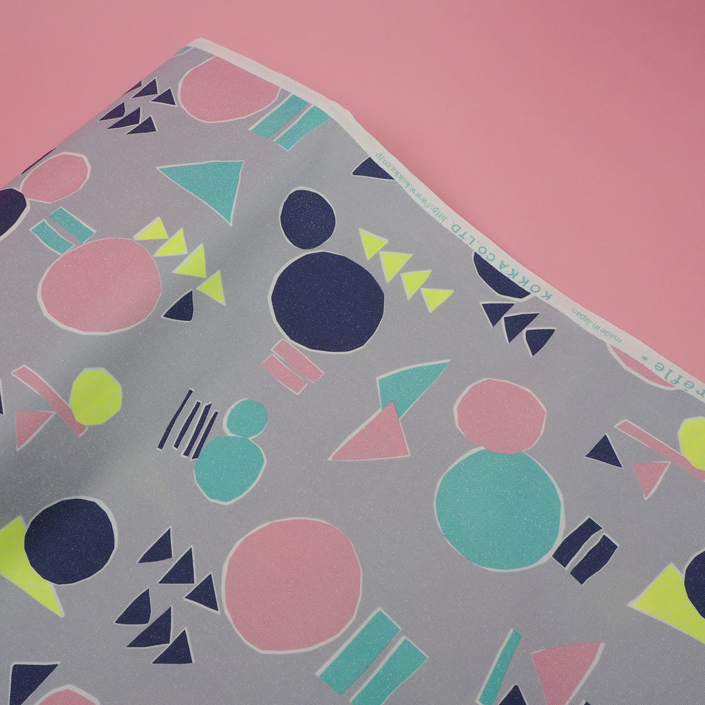 Smokey grey cotton with abstract shapes in blue, navy, pale pink and neon yellow imported from Japan. A bright, unusual pattern on a canvas-style fabric makes this perfect for more structured garments.
