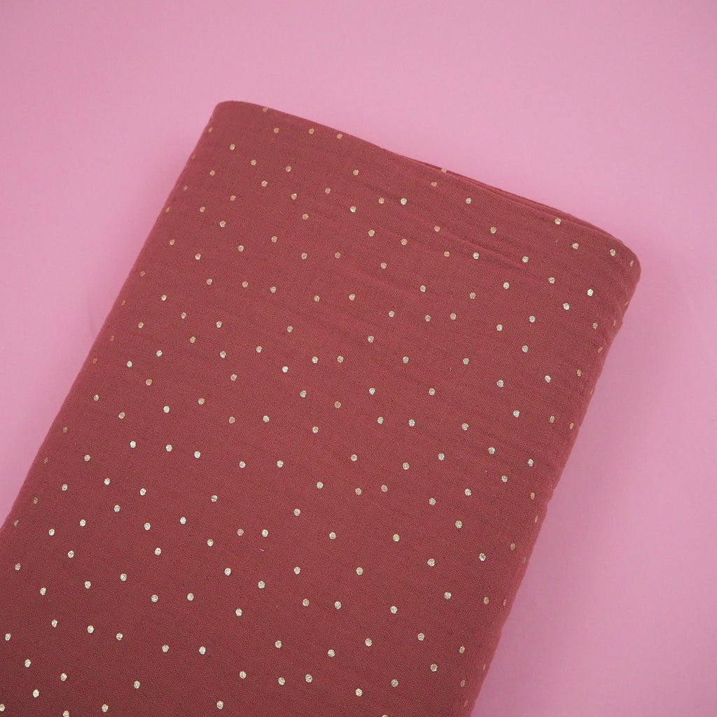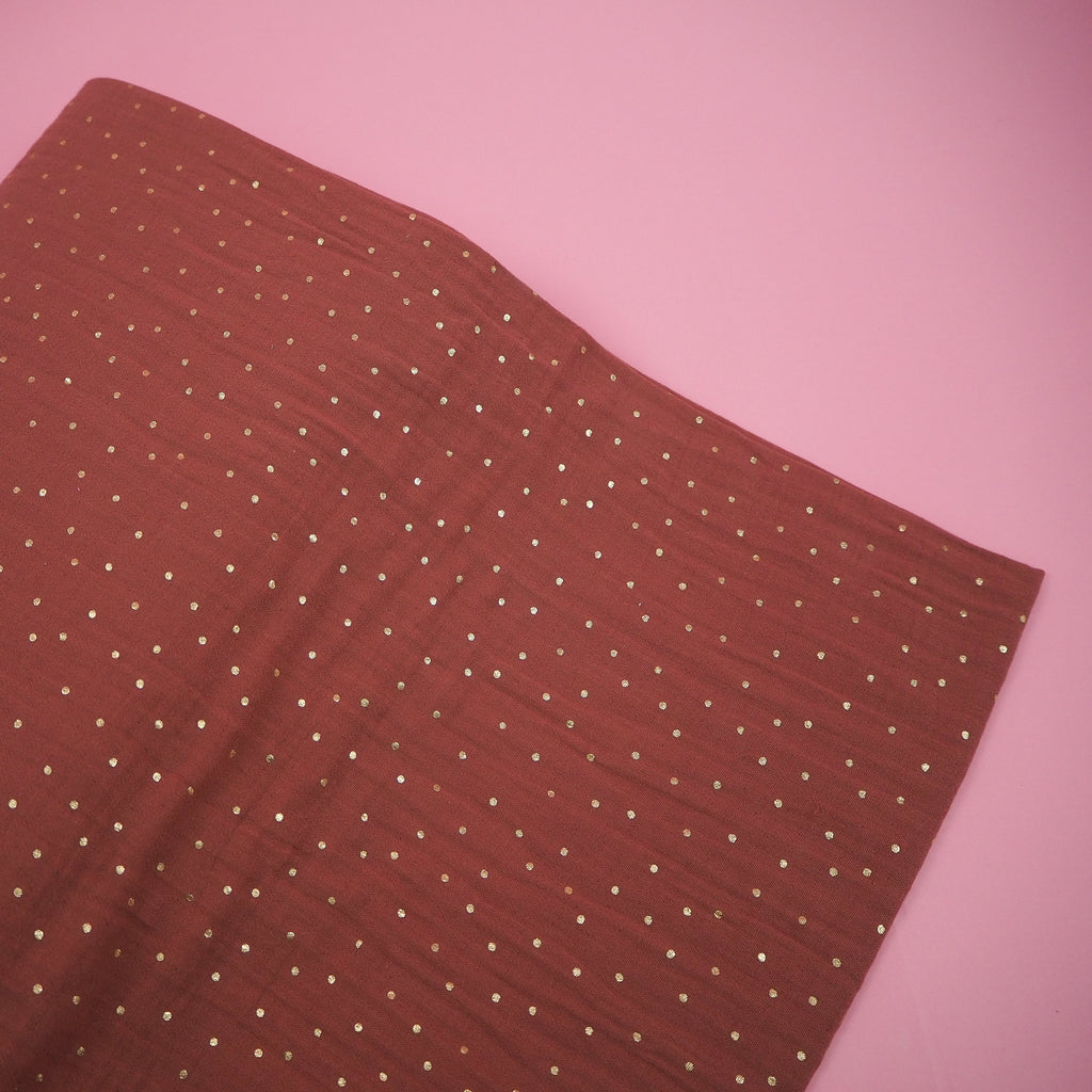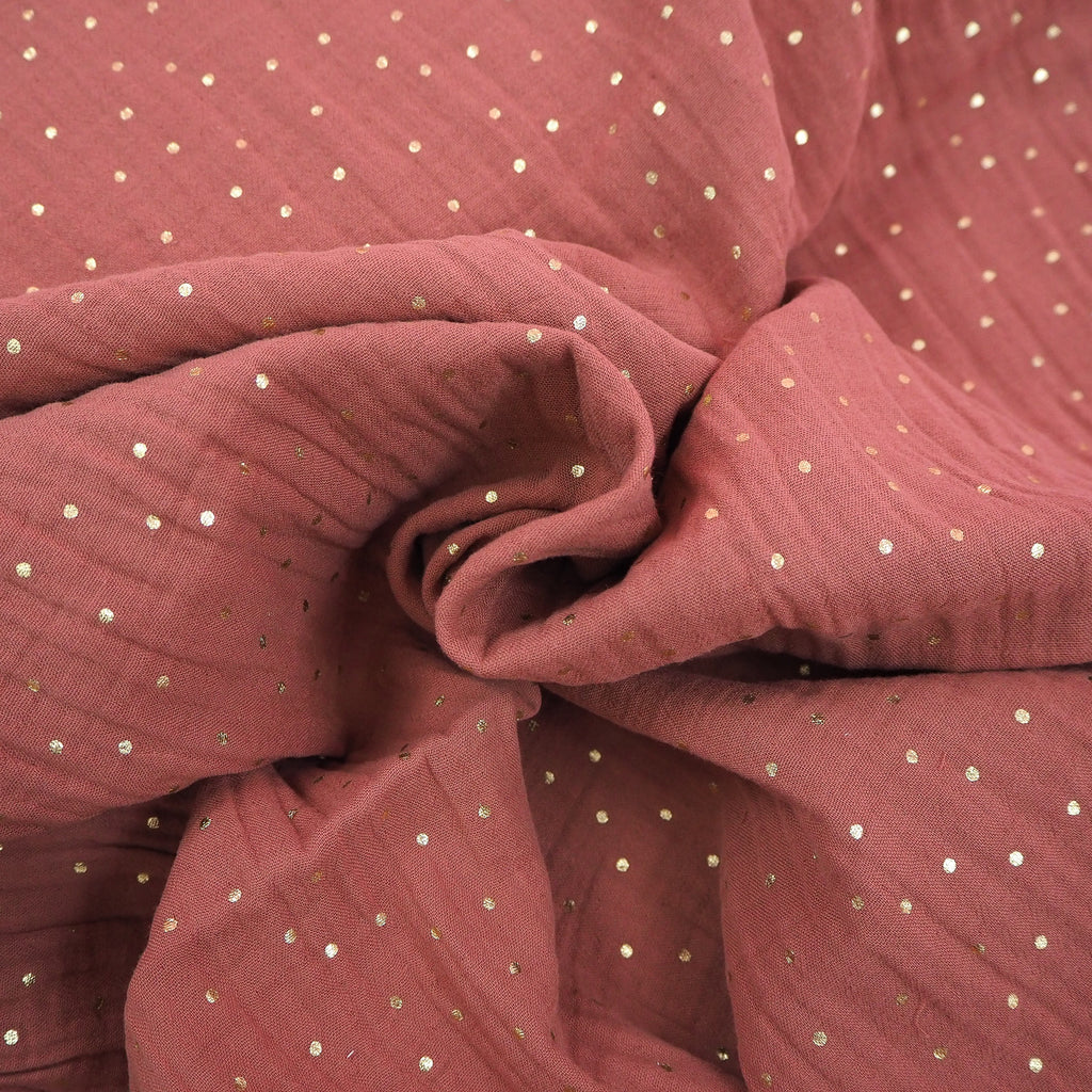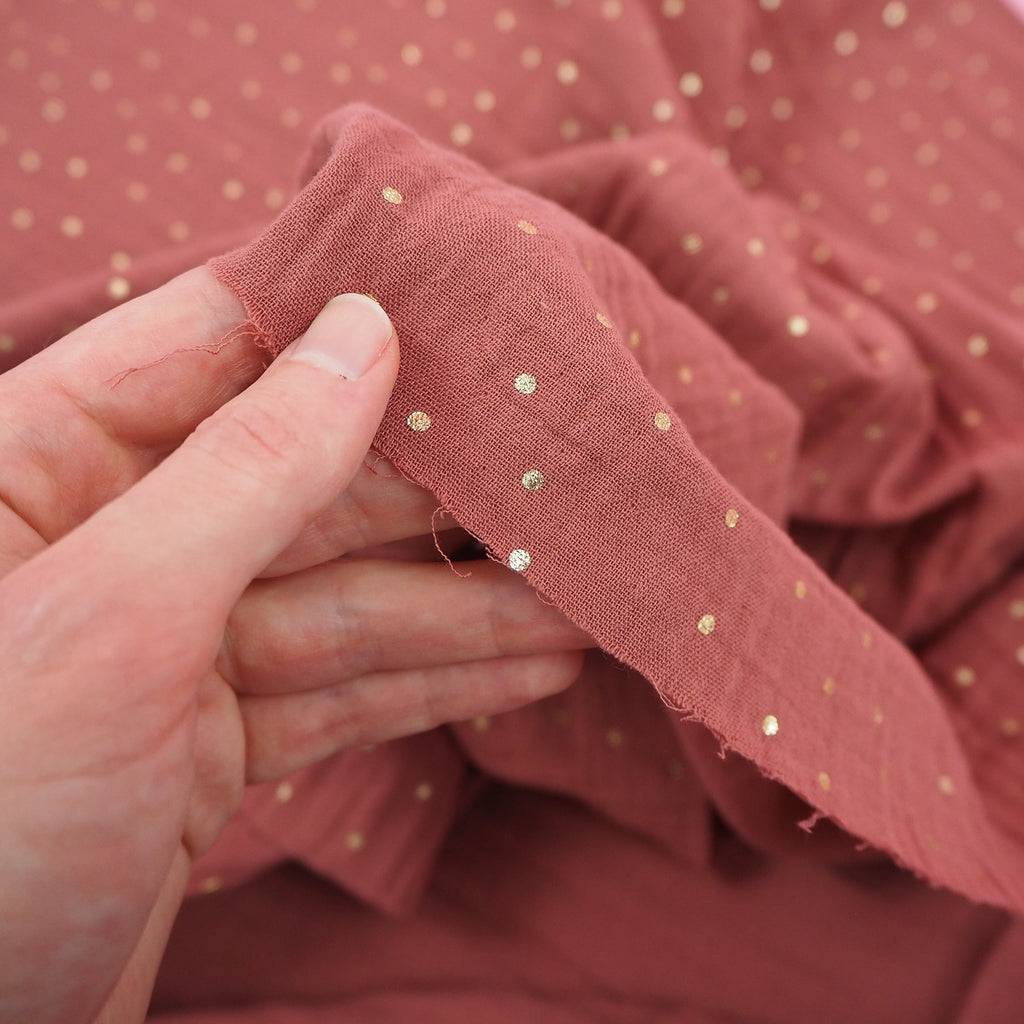 This dusky rose shade of double layered muslin fabric is speckled with pretty gold foil dots. Super soft and cosy, this would make some amazing jammies for stylish lounging.