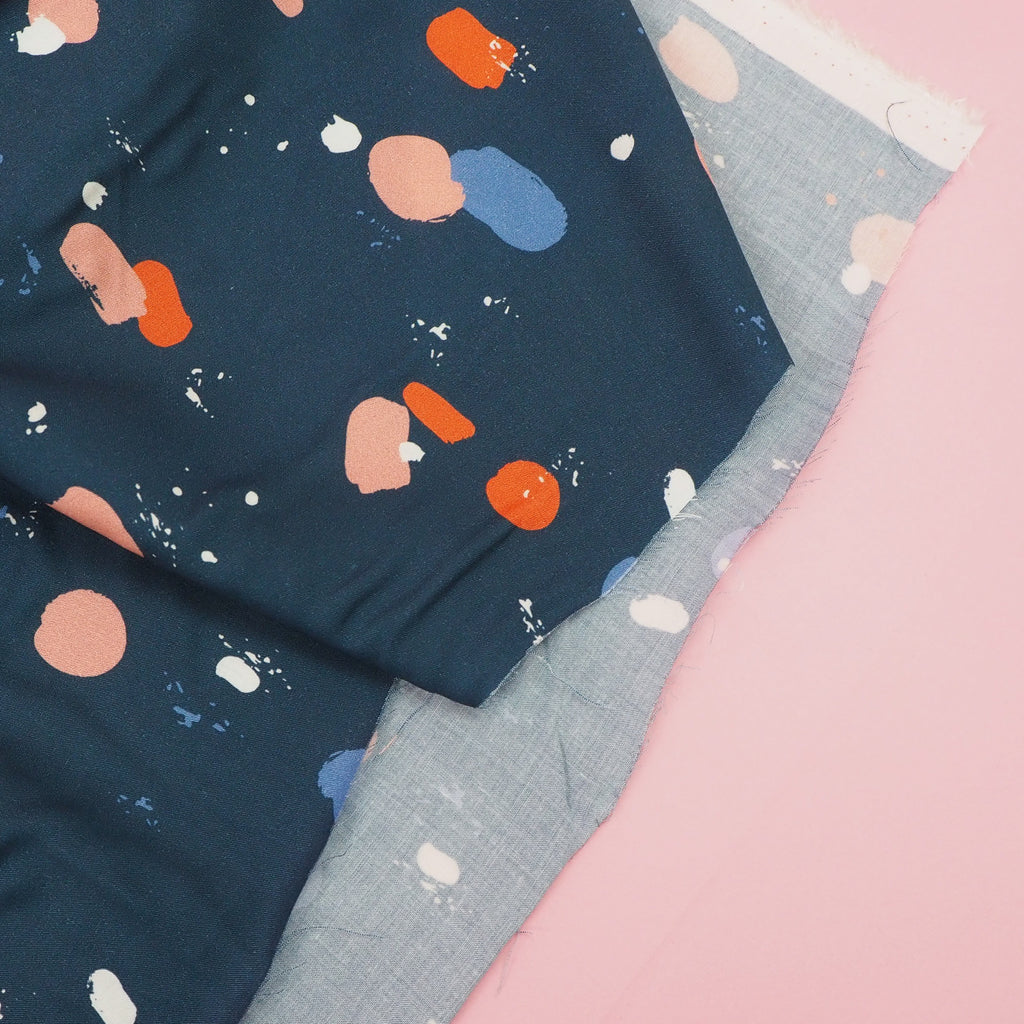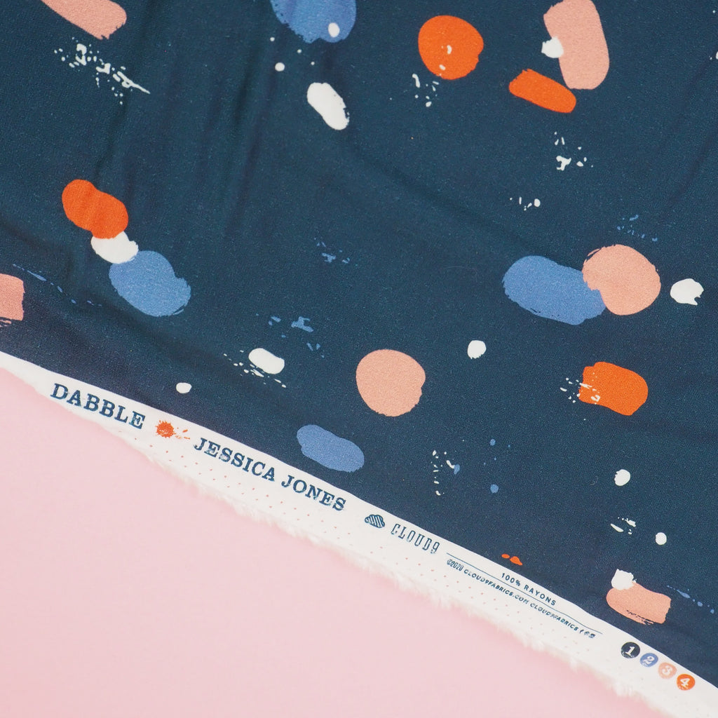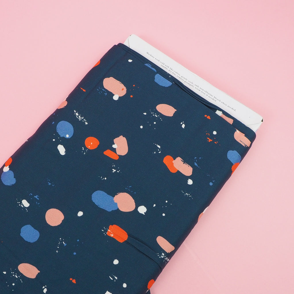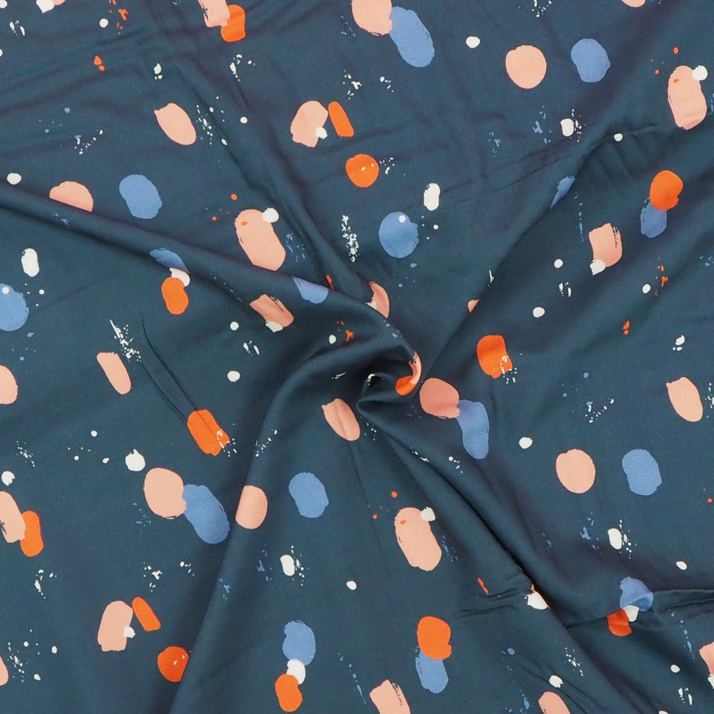 A soft and swishy rayon fabric with a gorgeous abstract pattern in peach, rose and cornflower blue on a deep blue background. Rayon is a nice fabric to sew with, and would make a beautiful day dress, top or skirt.