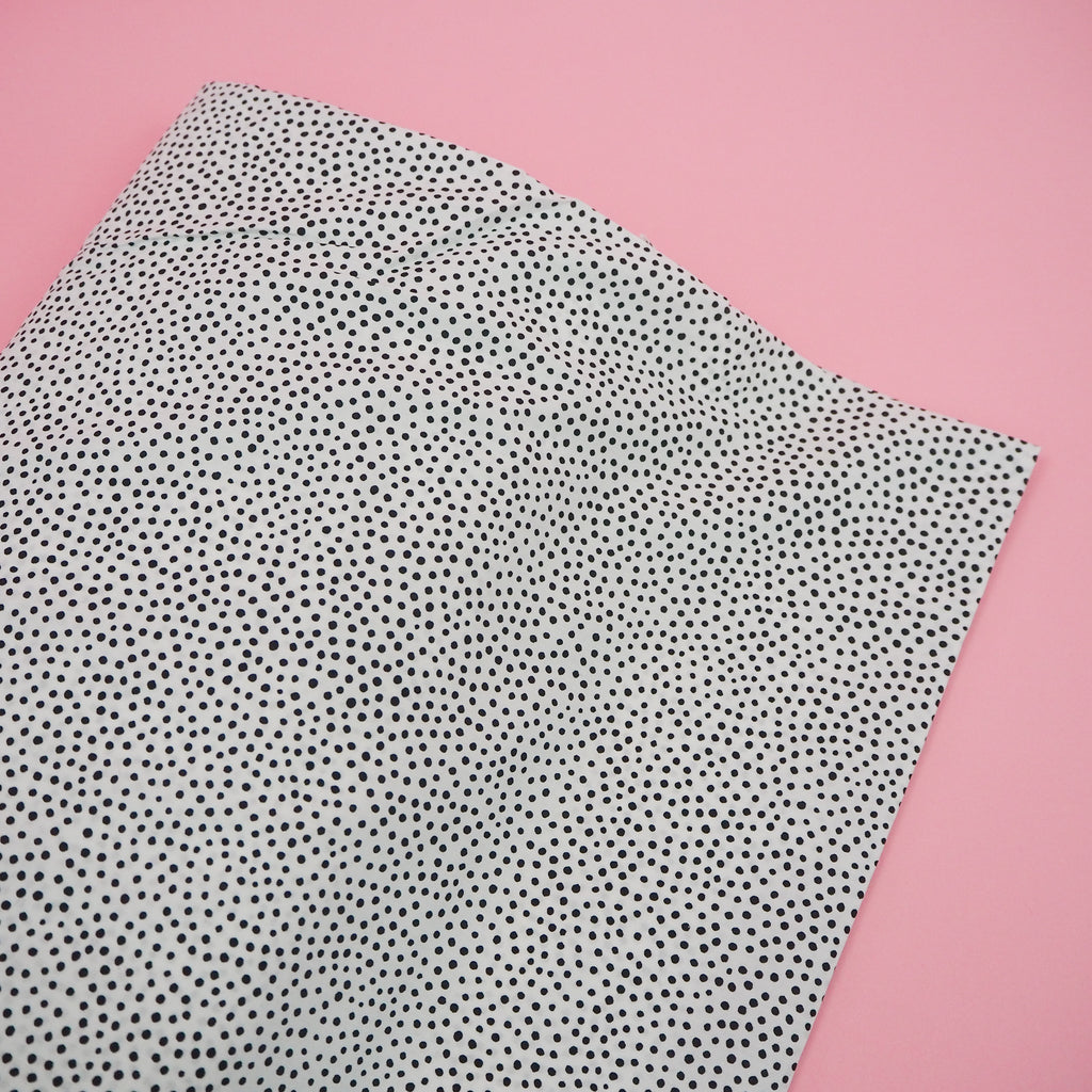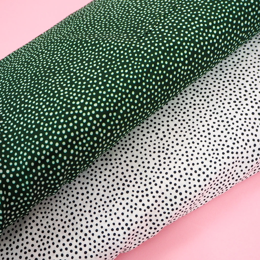 This is a beautiful monochrome classic with a twist – irregular black dots on a white, slightly sheer background. Nice drape, silky to sew, but still holds its shape, this cotton lawn would be perfect for dresses, palazzo pants, blouses, tops and more.