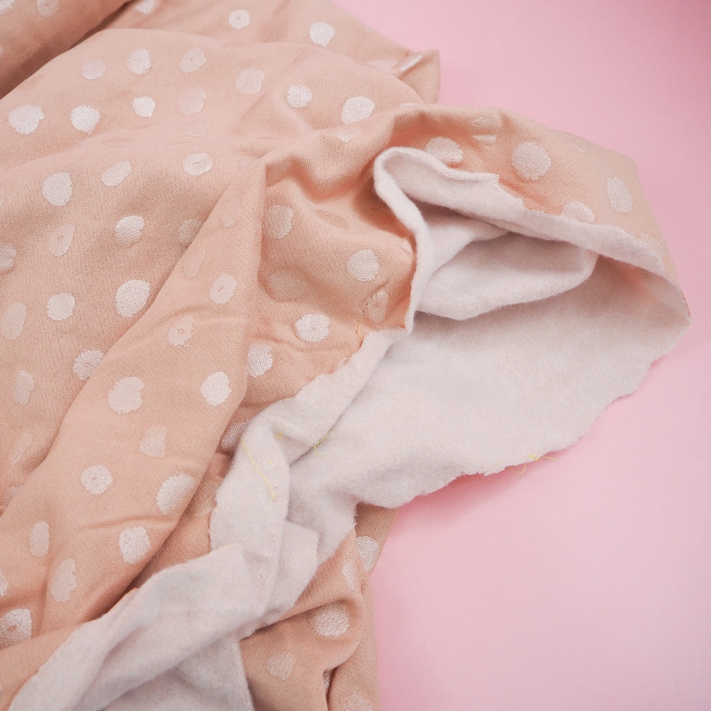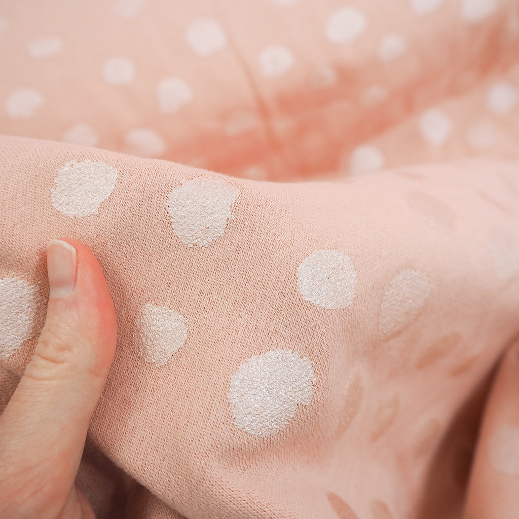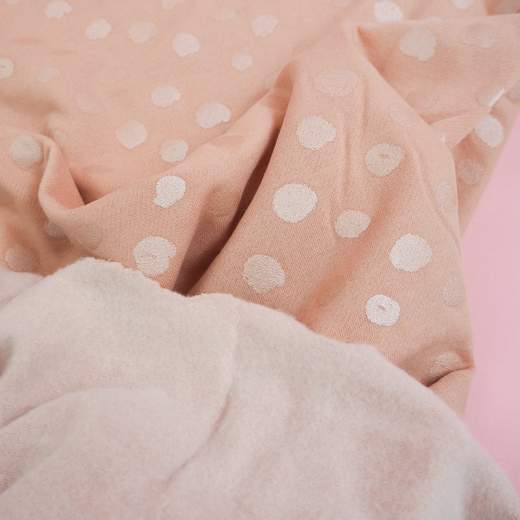 Super soft and snuggly sweatshirt fabric with irregular metallic dots. This would be perfect for loungewear, a cosy after gym cover-up, or a day-to-day sweatshirt.