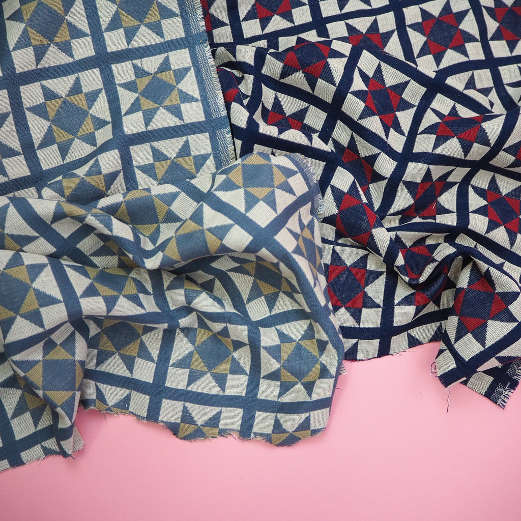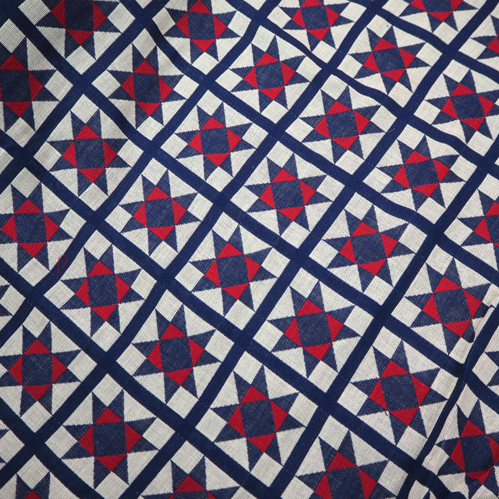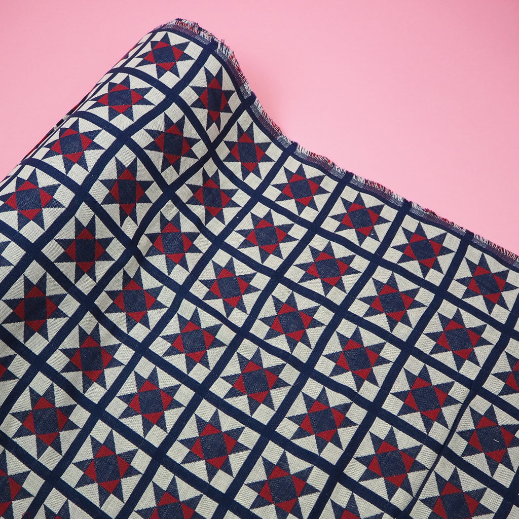 A Japanese double-layered cotton jacquard, each side woven in a different quilt style pattern. Indigo blue, red and off-white.
