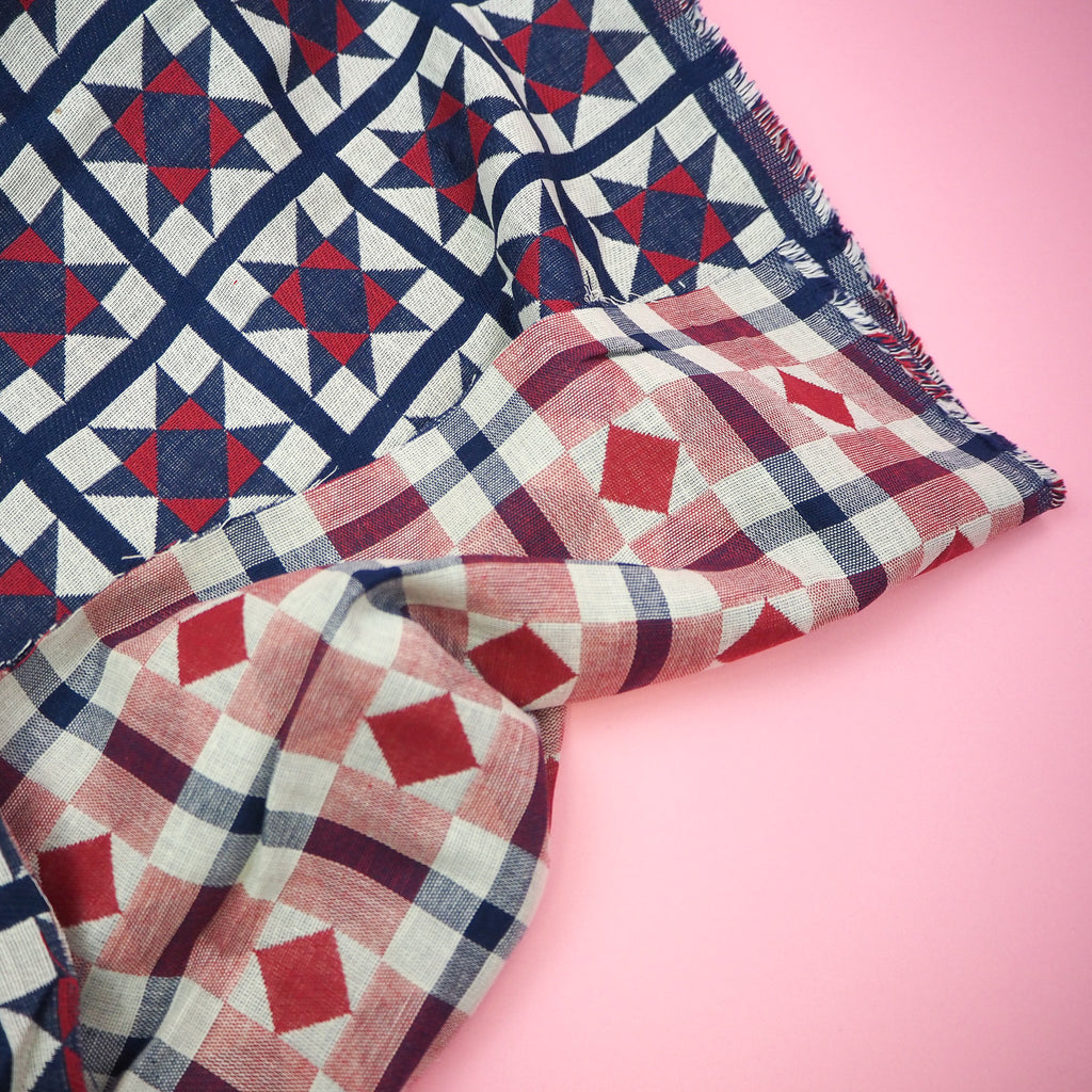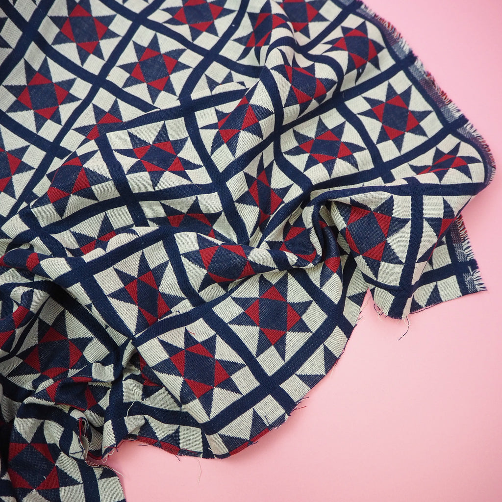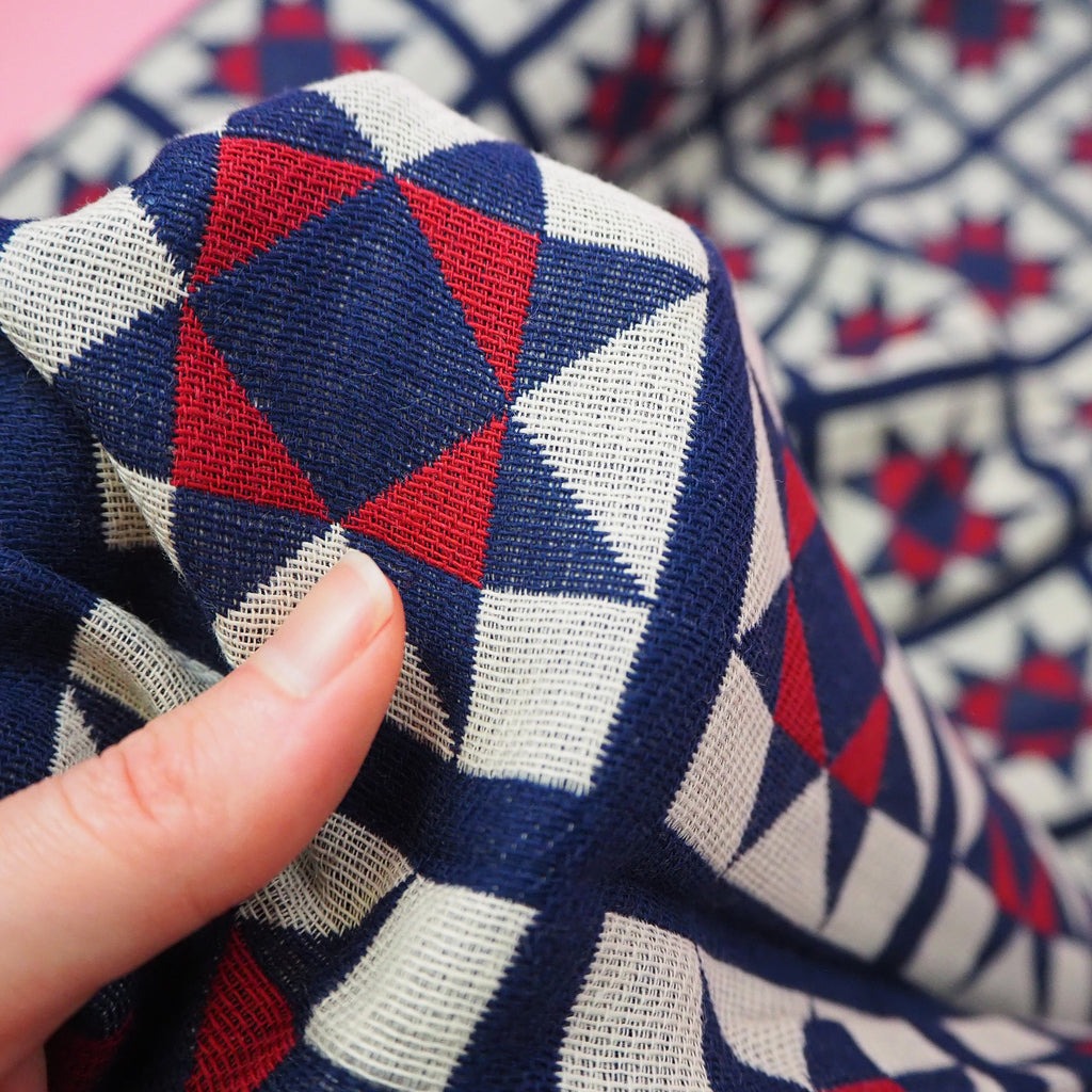 A Japanese double-layered cotton jacquard, each side woven in a different quilt style pattern. Indigo blue, red and off-white.