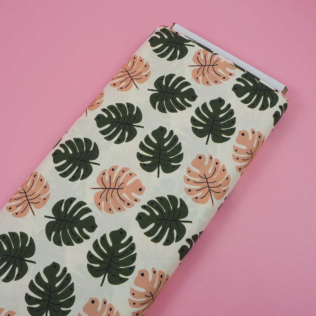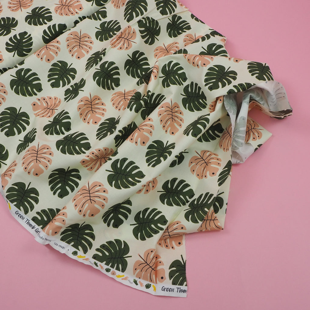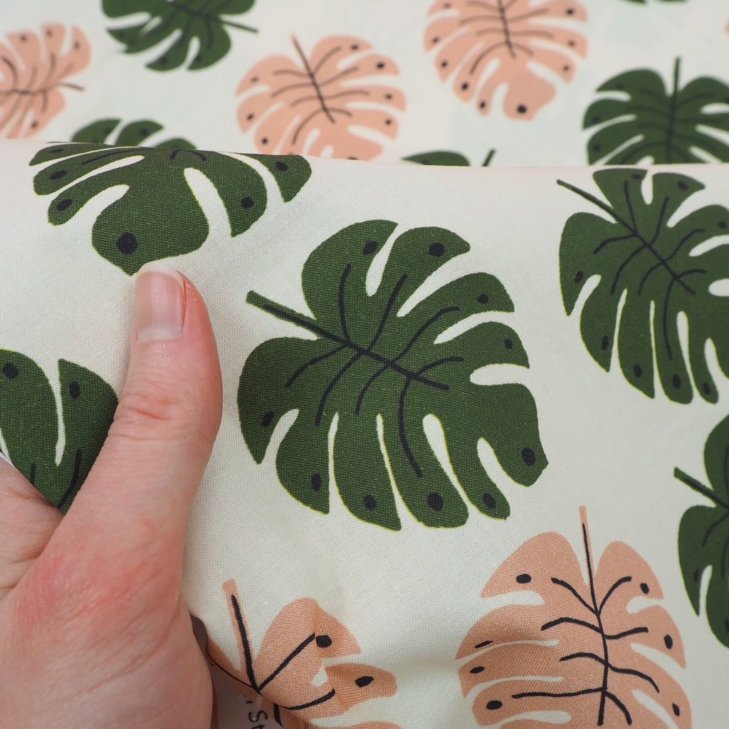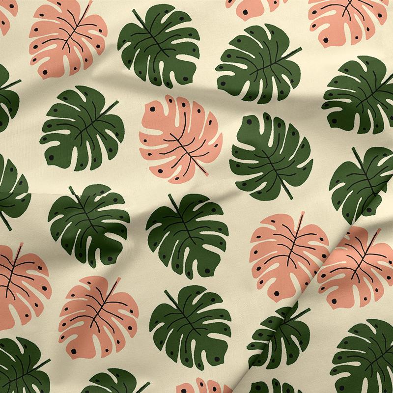 Illustrated monstera leaves in pale pink and deep green on a cream background. Why not make a cute shirt or a gardening apron?