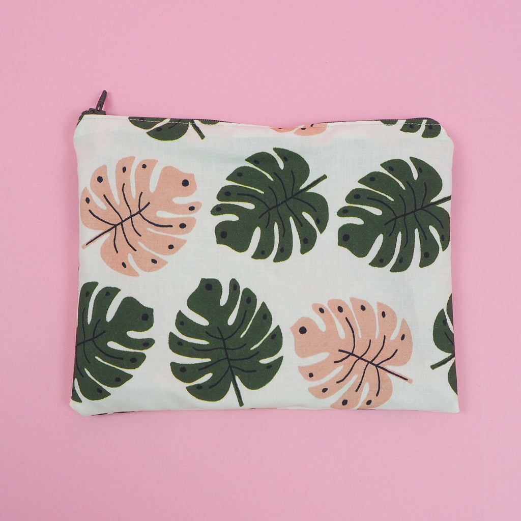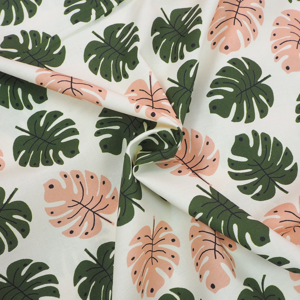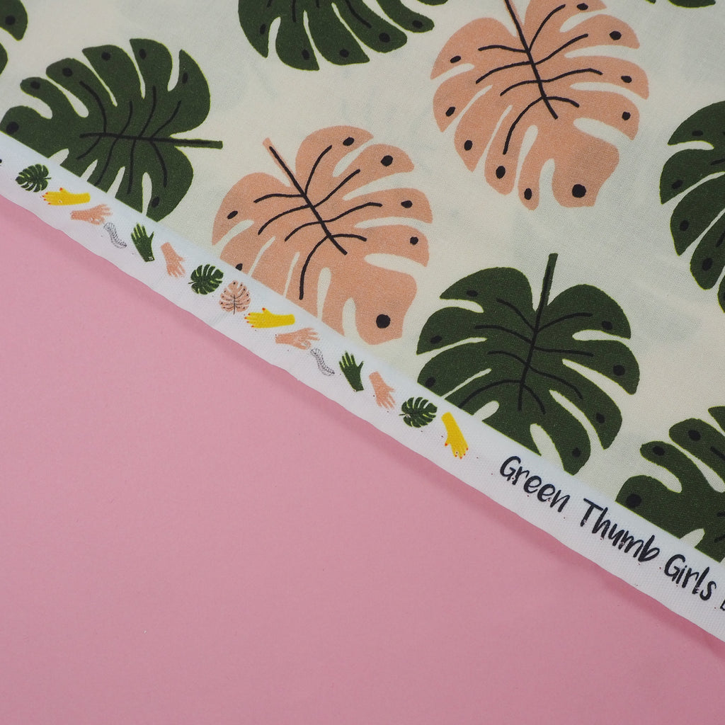 Illustrated monstera leaves in pale pink and deep green on a cream background. Why not make a cute shirt or a gardening apron?