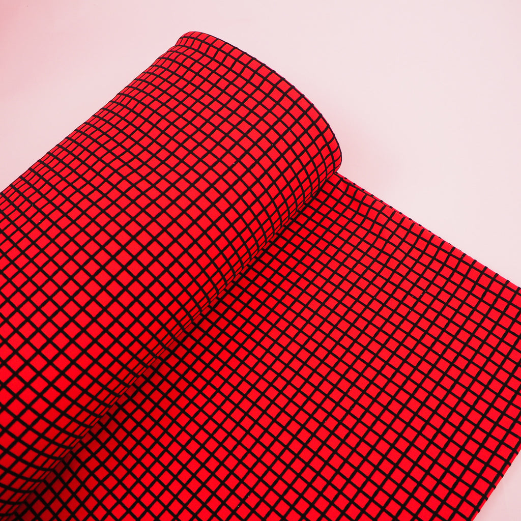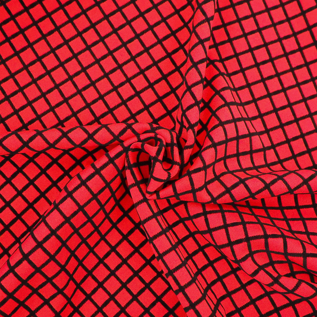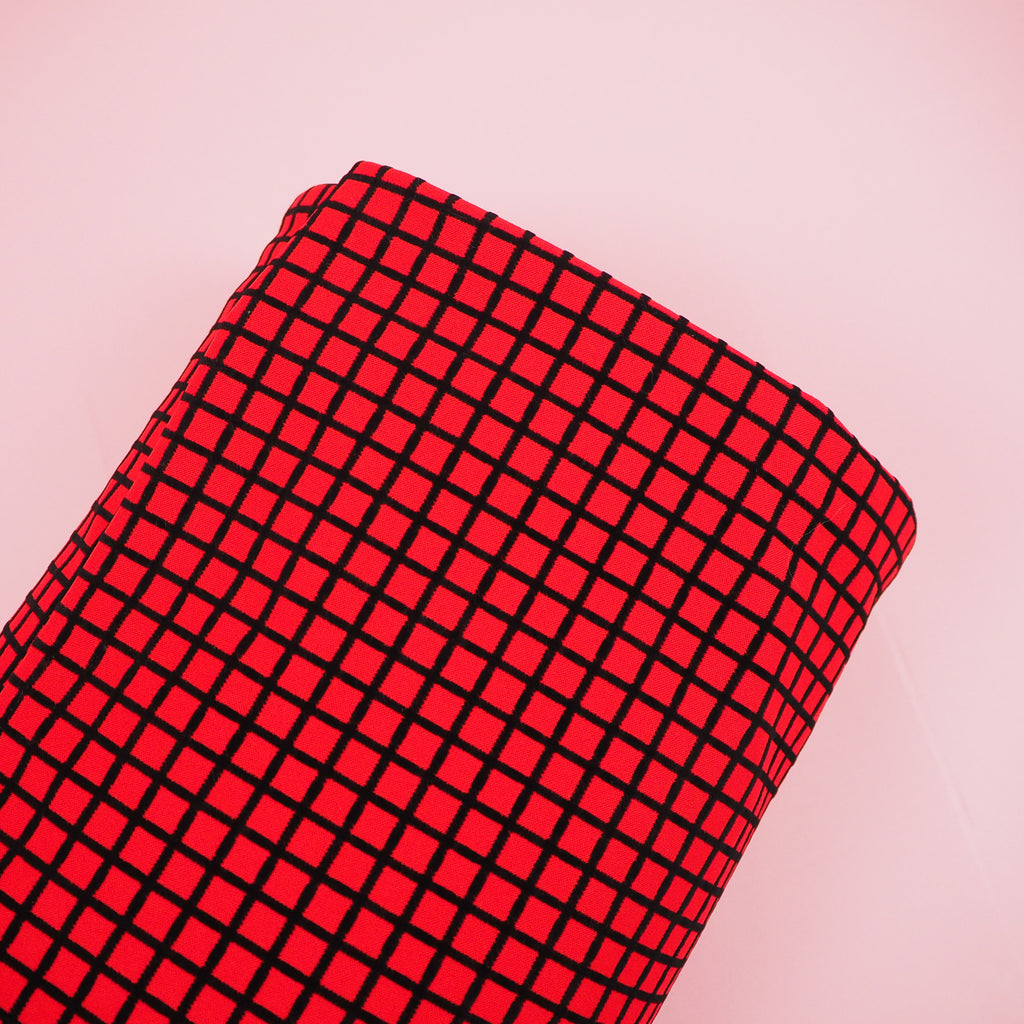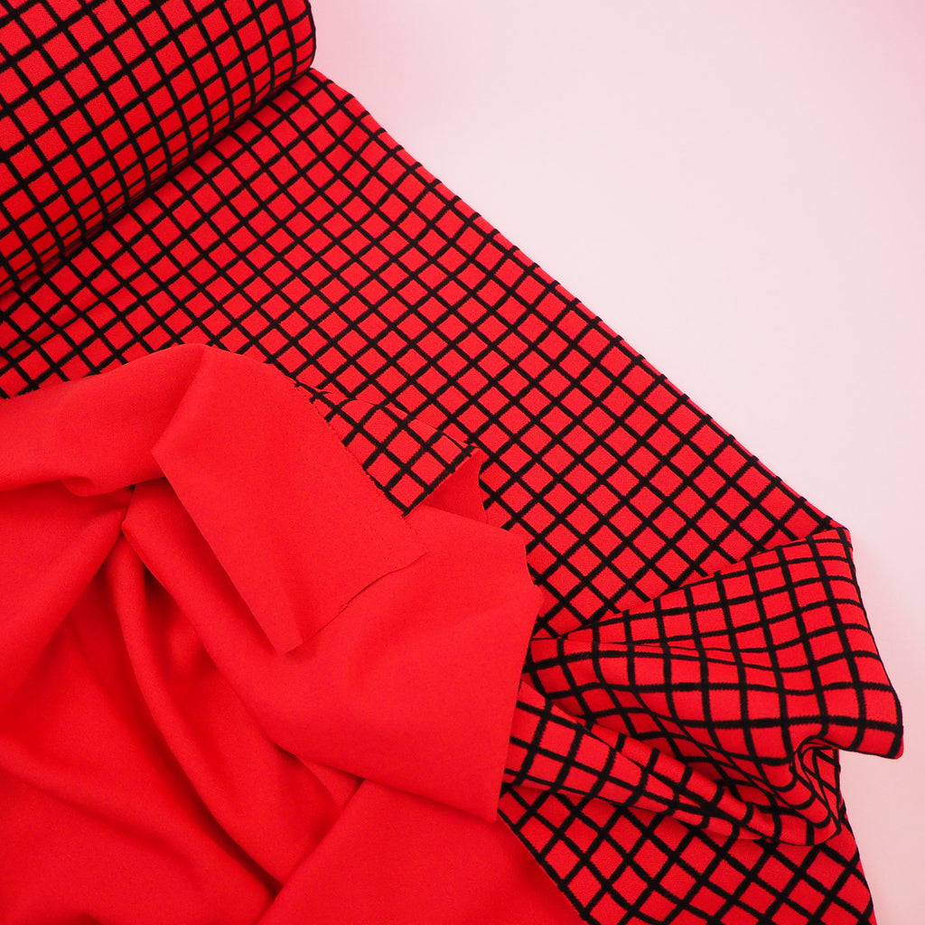Firm structural red jersey with raised flocked grid pattern in black. A bold graphic pattern with some stretch and a cool 1960s vibe. This fabric could be used for dresses, jackets or even trousers for some retro kitsch.