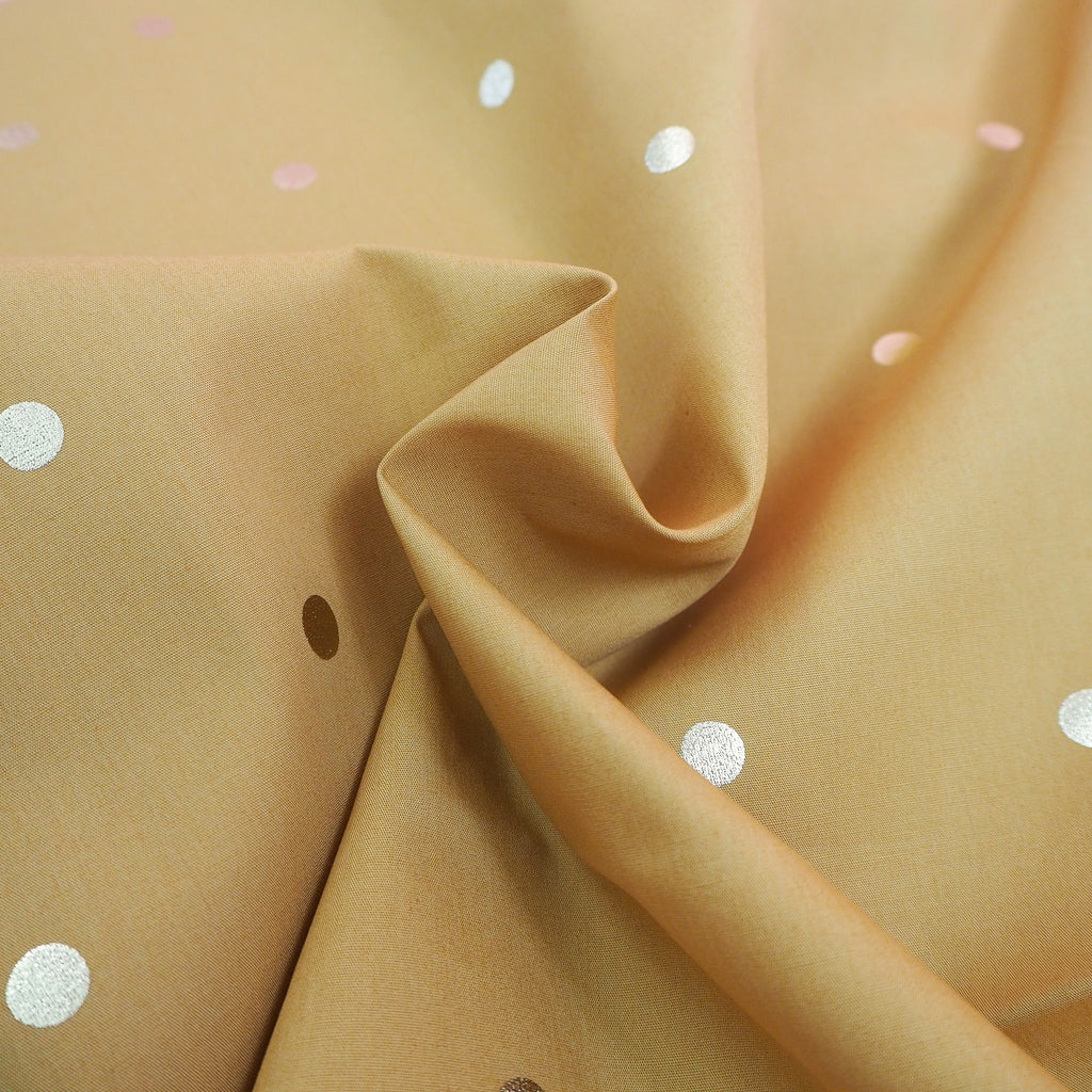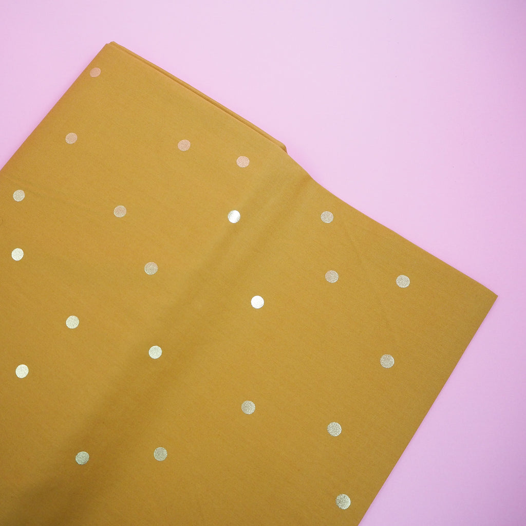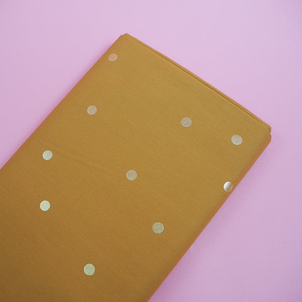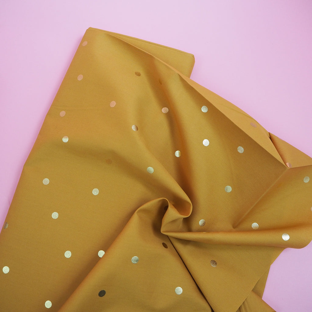 Smooth, fine woven cotton, with a very slight sheen, almost like a thick lawn. The dots are a bright brilliant shiny gold, and you could use it for almost anything that calls for a fun statement cotton: garments or crafting!