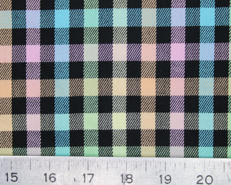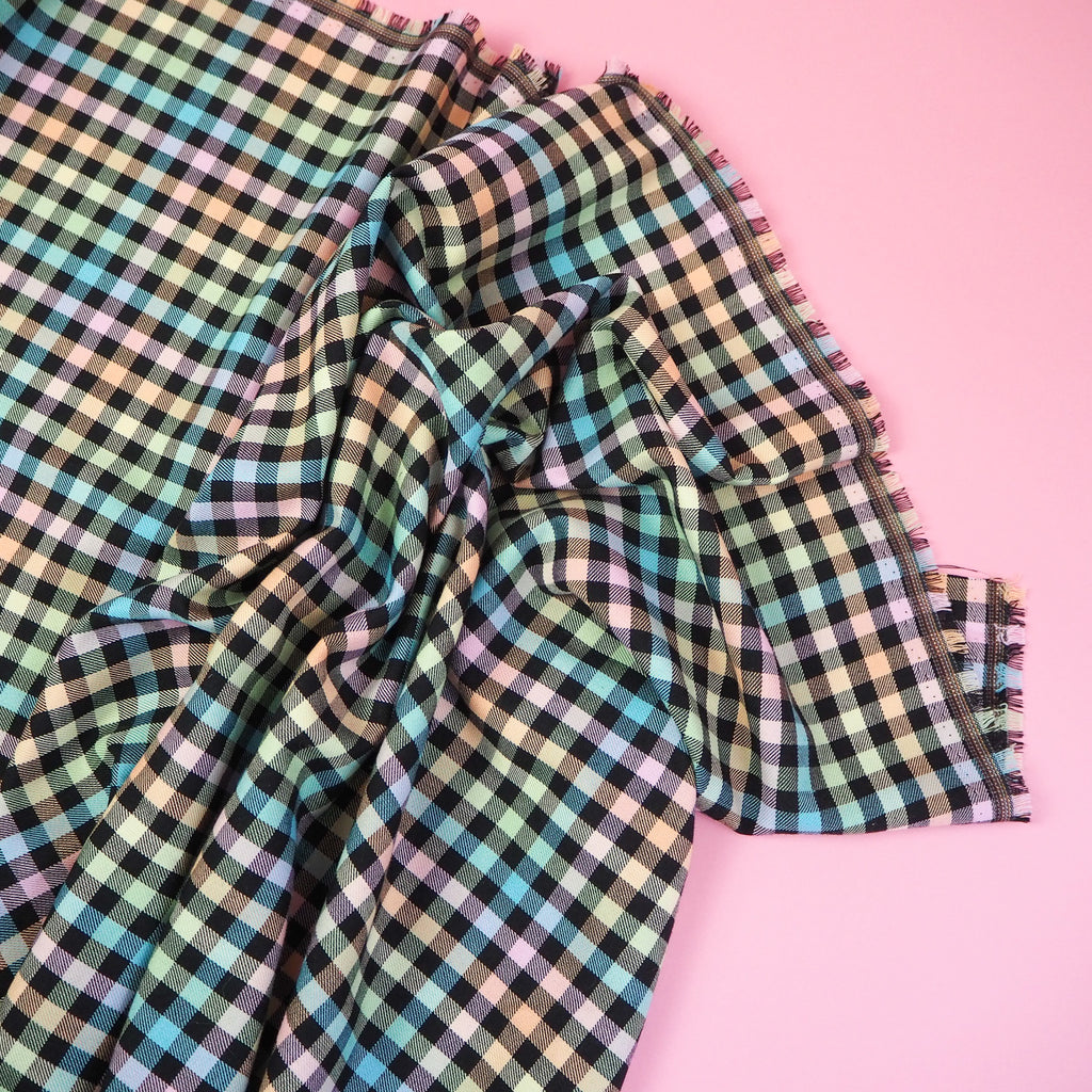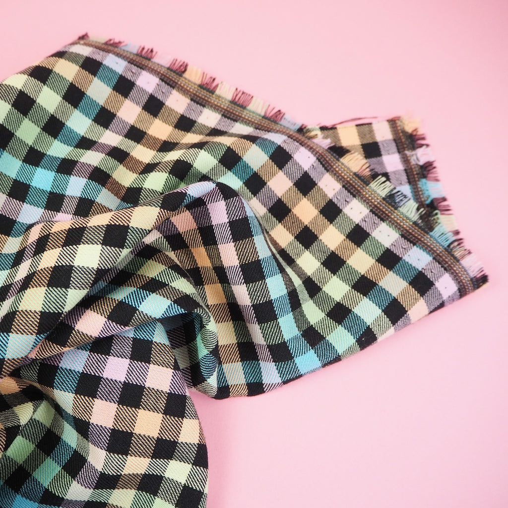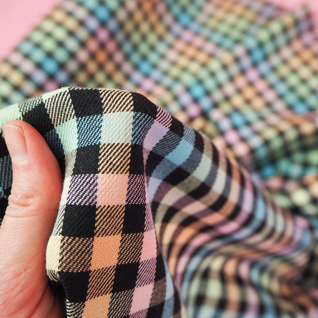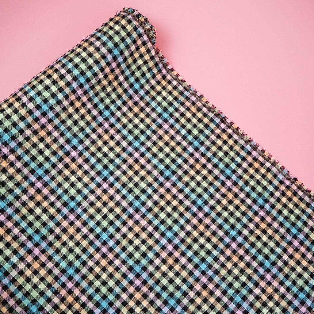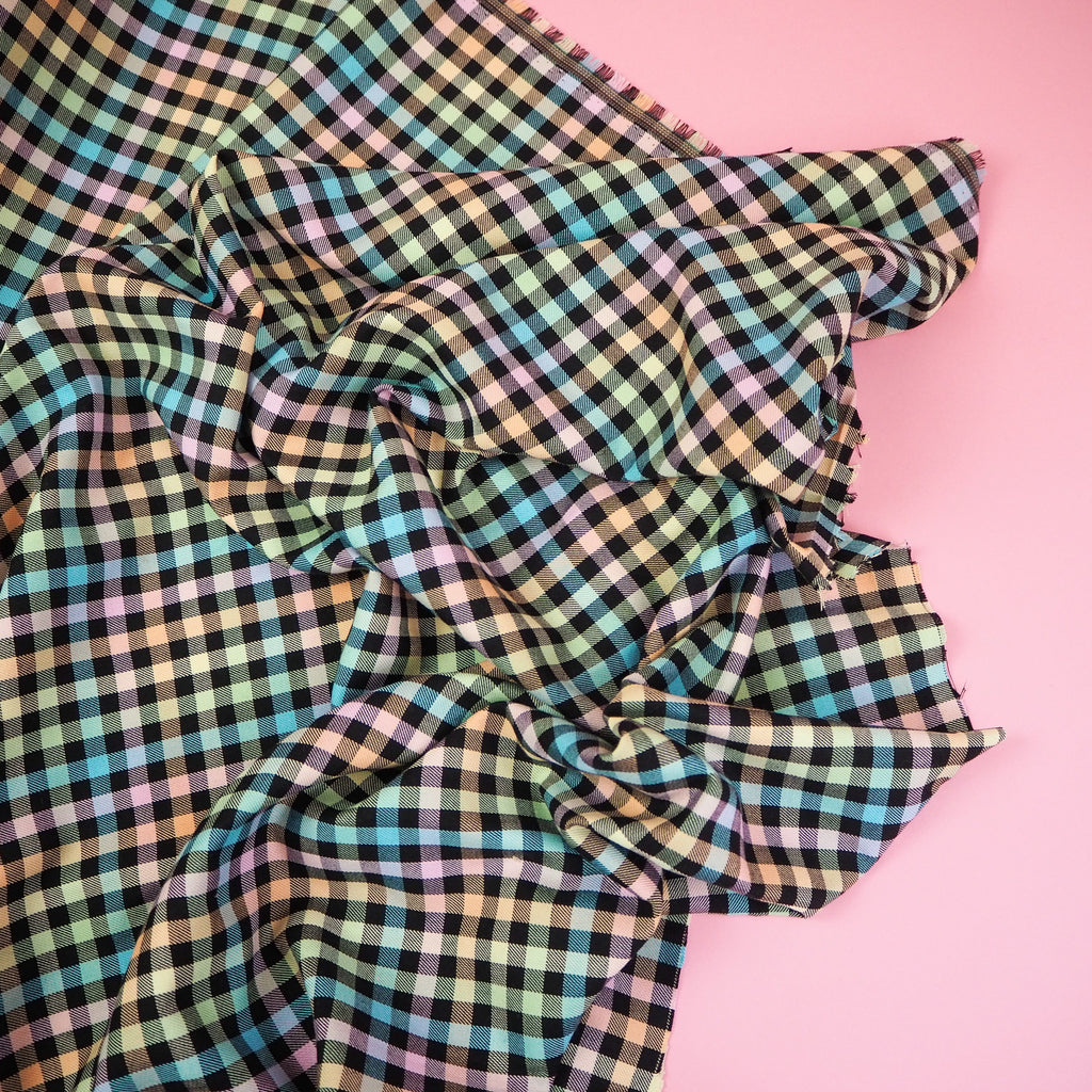 Pastel rainbow and black tartan in polyester and viscose blend fabric. Polyviscose is durable and drapey with a smooth feel and is ideal for dresses and swishy skirts.