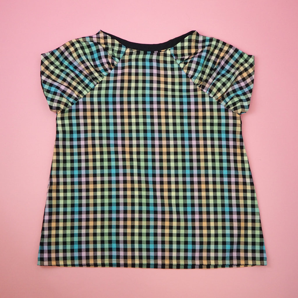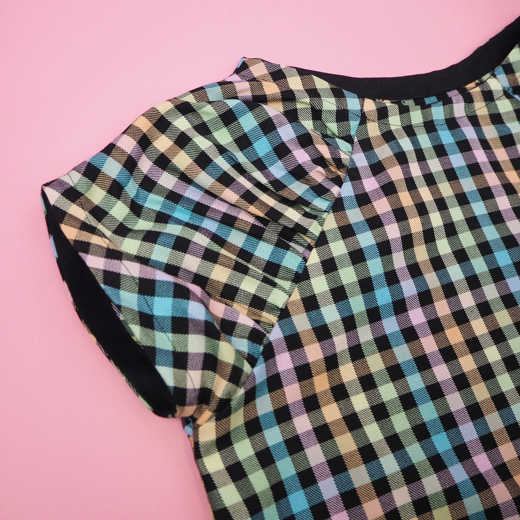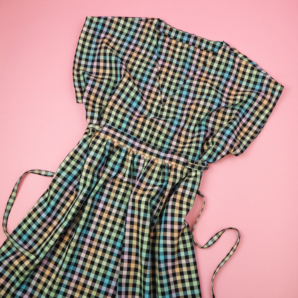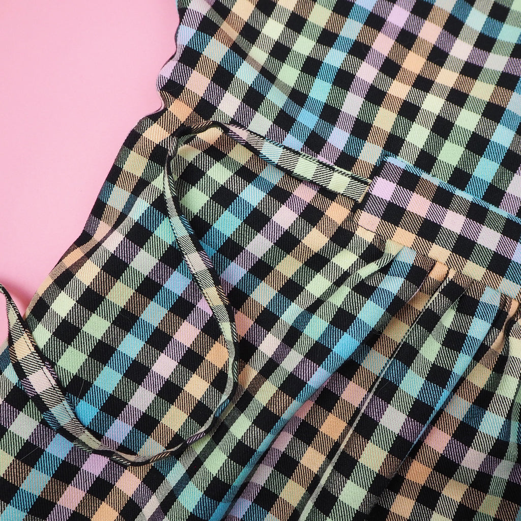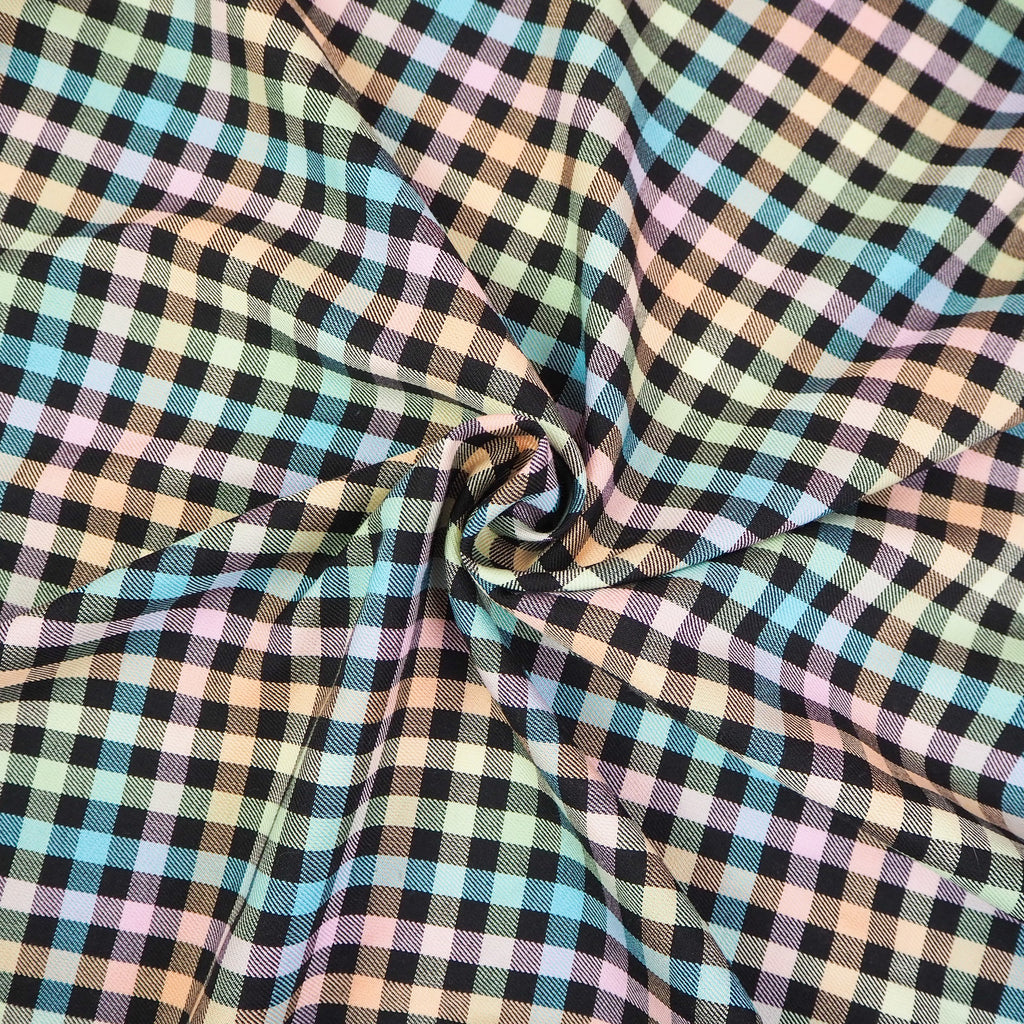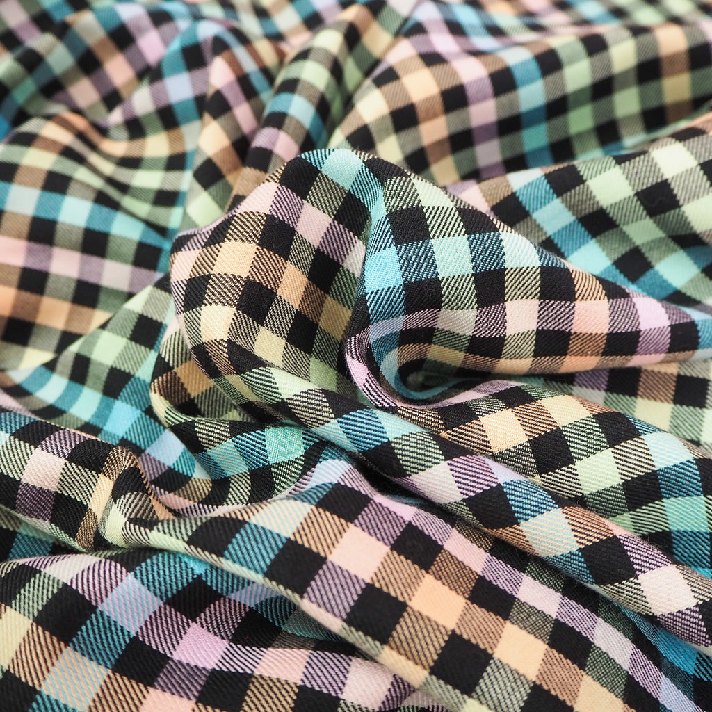 Pastel rainbow and black tartan in polyester and viscose blend fabric. Polyviscose is durable and drapey with a smooth feel and is ideal for dresses and swishy skirts.