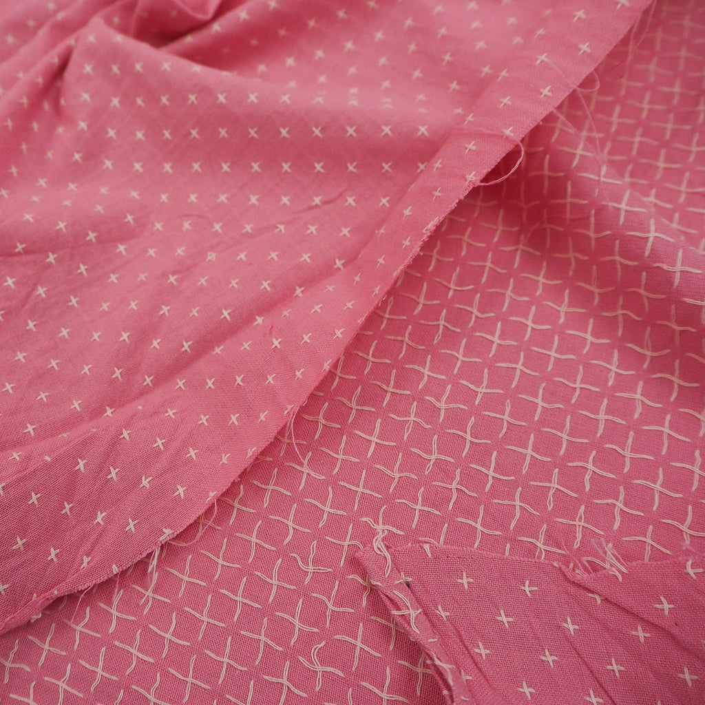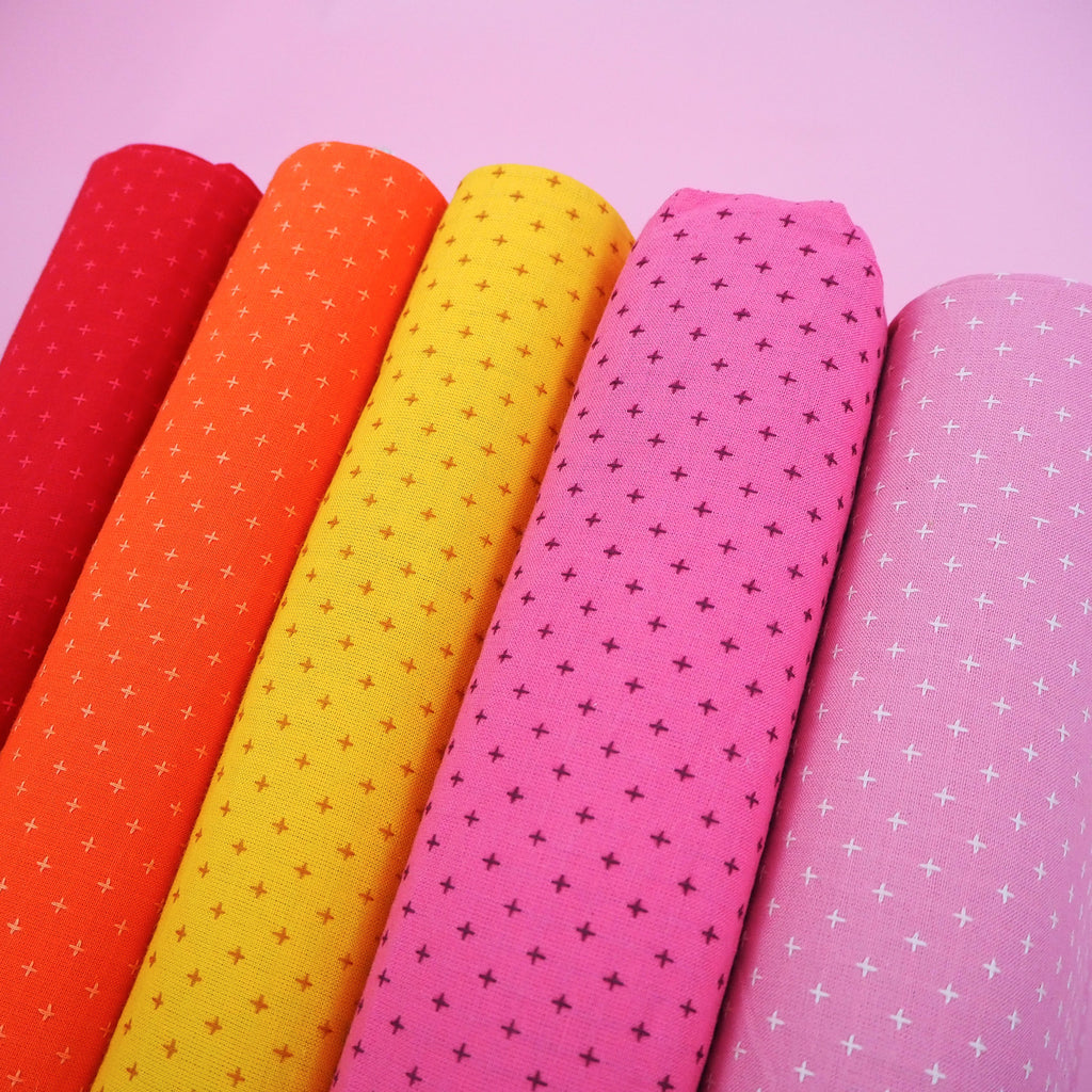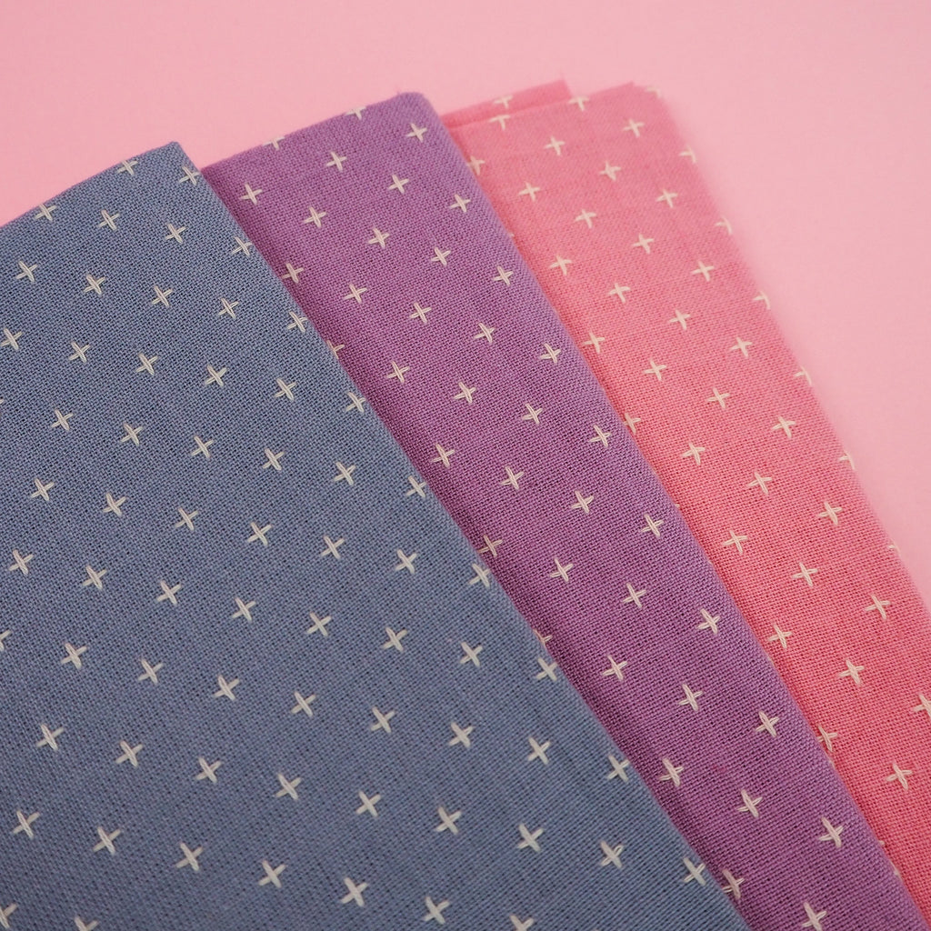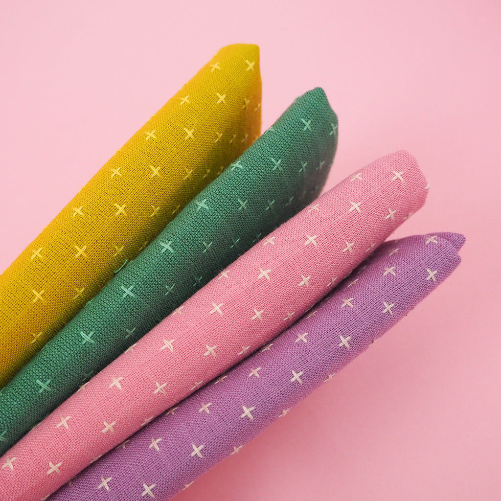 All of our Pluses and Crosses fabrics are loose weave cotton, featuring an embroidered cross pattern in matching or contrasting colours. They are fairly traded an made using a special weaving process to create the look of hand stitching. They're beautifully textured and suitable for quilting, garment making, bag making, and some home furnishings.