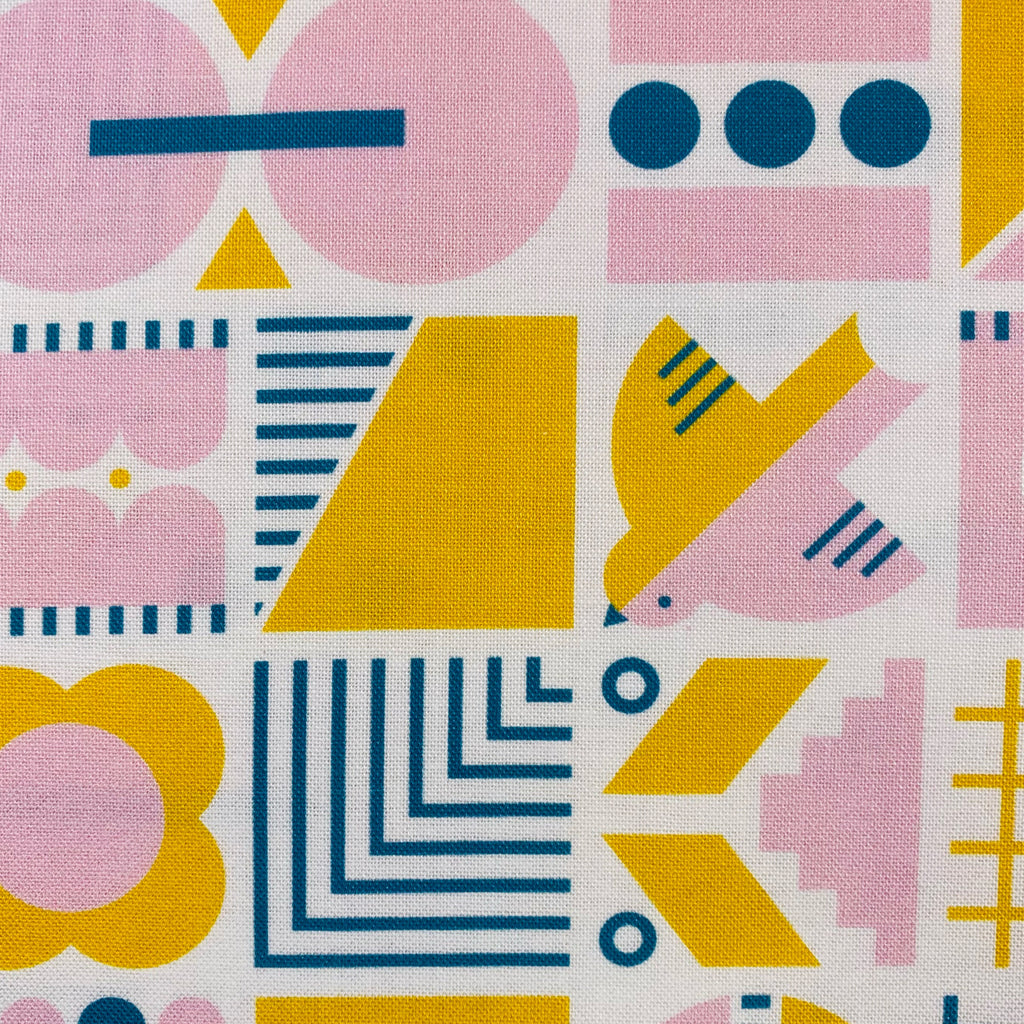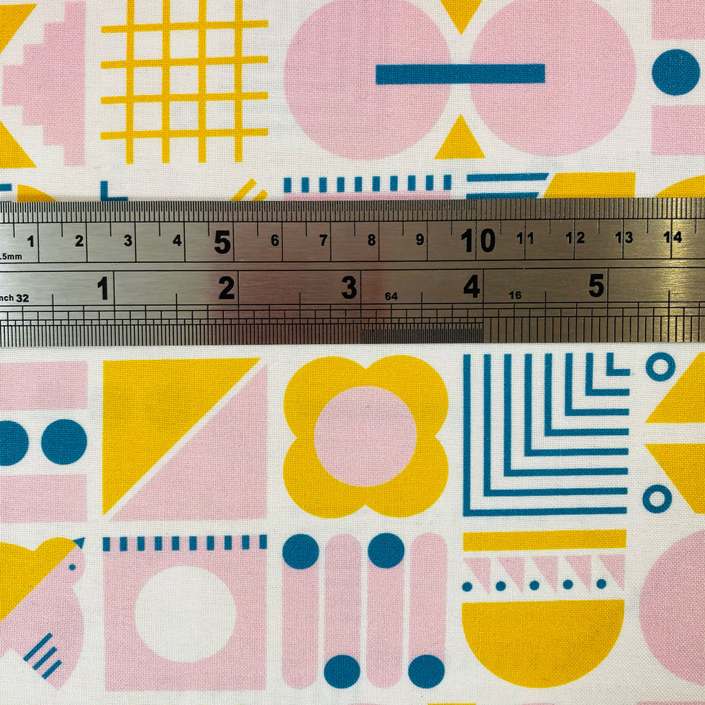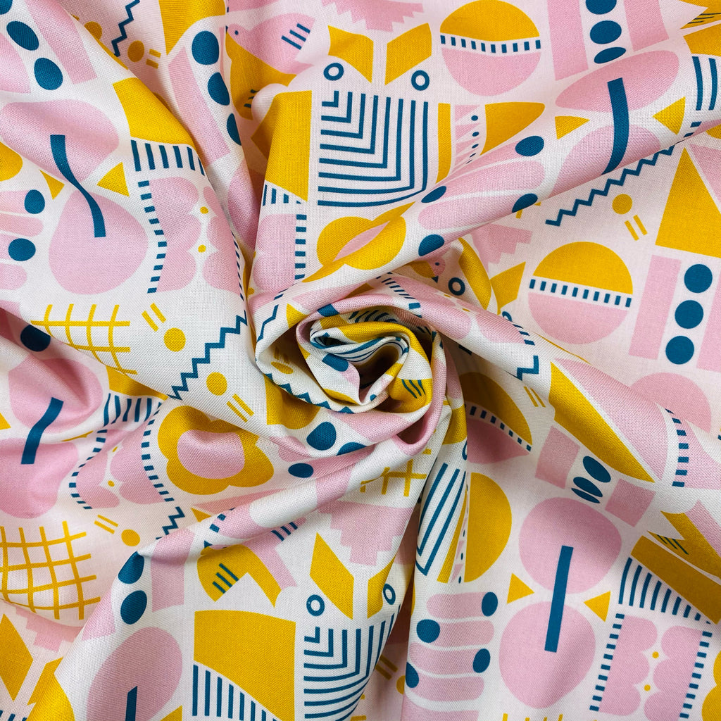 Retro inspired grid pattern in white, pink, dark teal and mustard yellow, featuring flowers, birds and geometric shapes. This beautiful silky quilting cotton had a nice structure, and is soft to the touch. Perfect for craft and garment projects! Find it’s coordinating sister print here!
