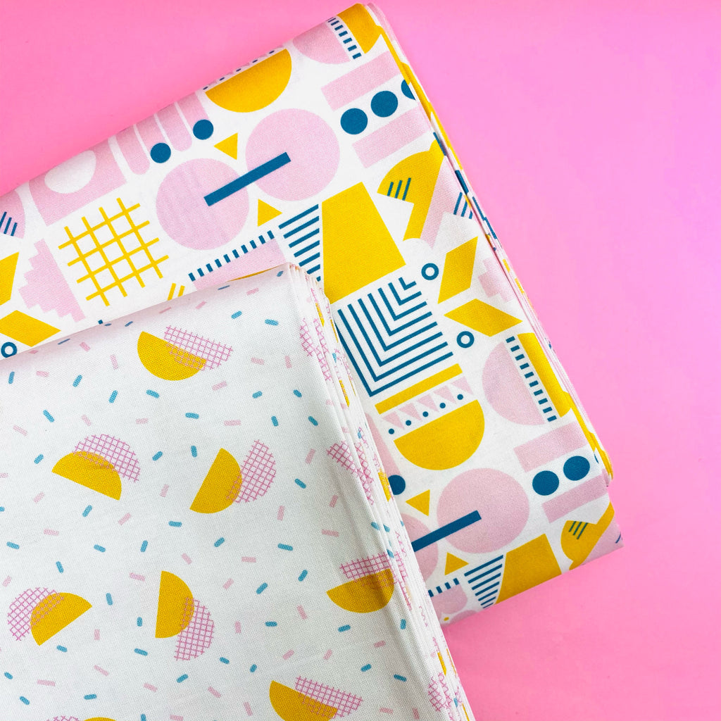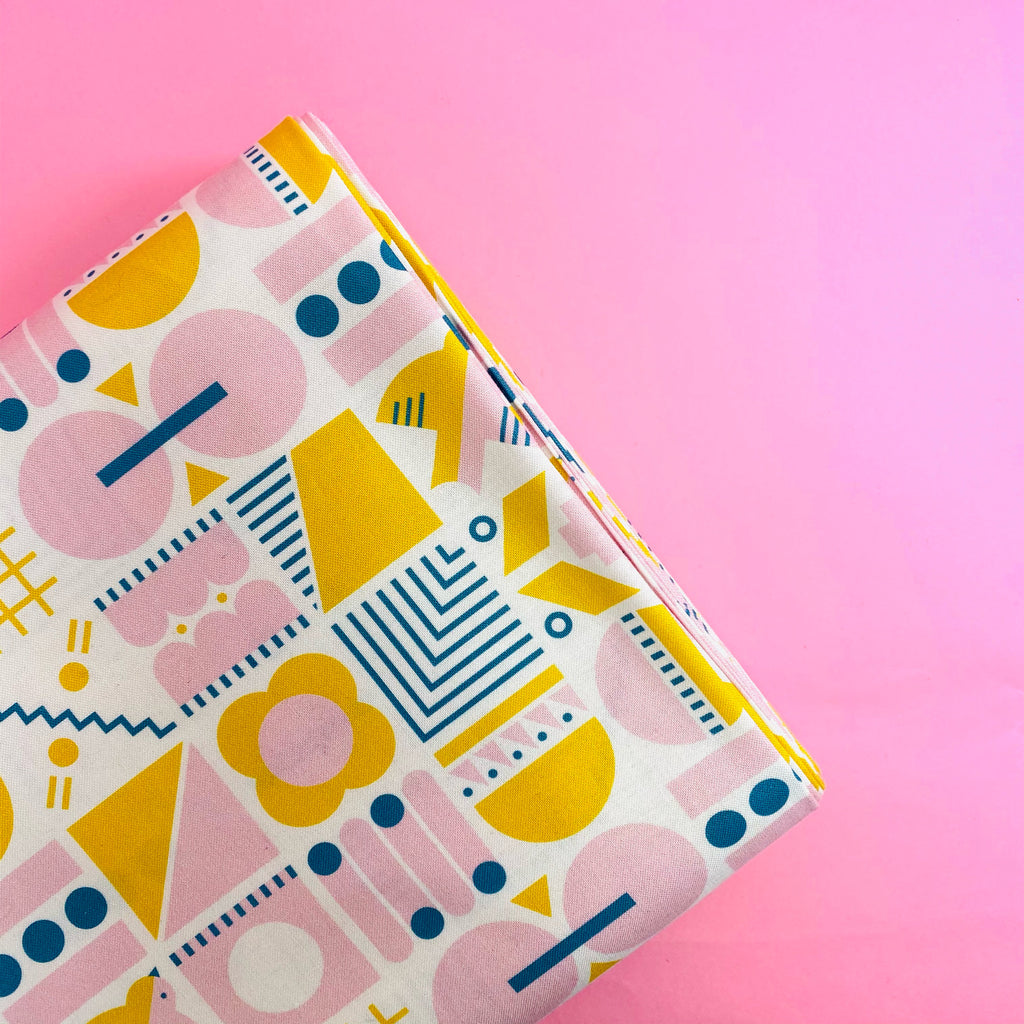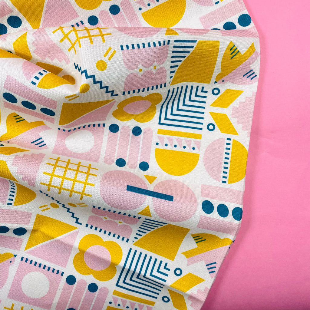 Retro inspired grid pattern in white, pink, dark teal and mustard yellow, featuring flowers, birds and geometric shapes. This beautiful silky quilting cotton had a nice structure, and is soft to the touch. Perfect for craft and garment projects! Find it’s coordinating sister print here!