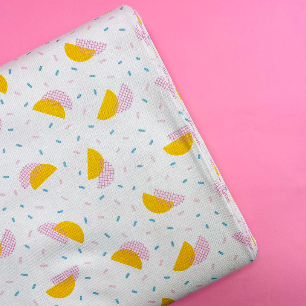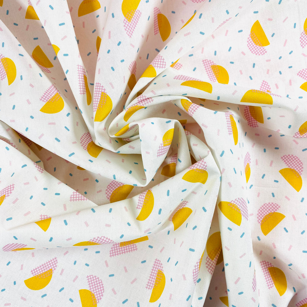 Retro inspired grid pattern in white, pink, and mustard yellow, featuring grid and solid semi circles and cute hundreds and thousands. This beautiful silky quilting cotton had a nice structure, and is soft to the touch. Perfect for craft and garment projects! Find it’s coordinating sister print here
