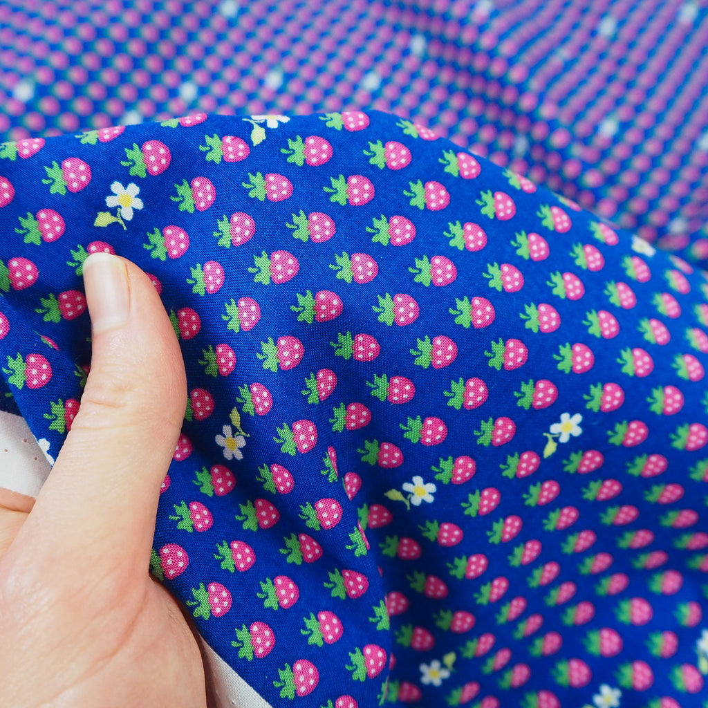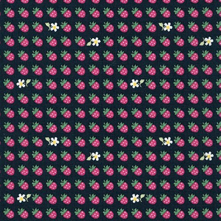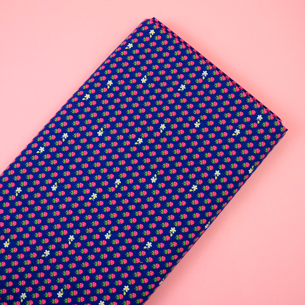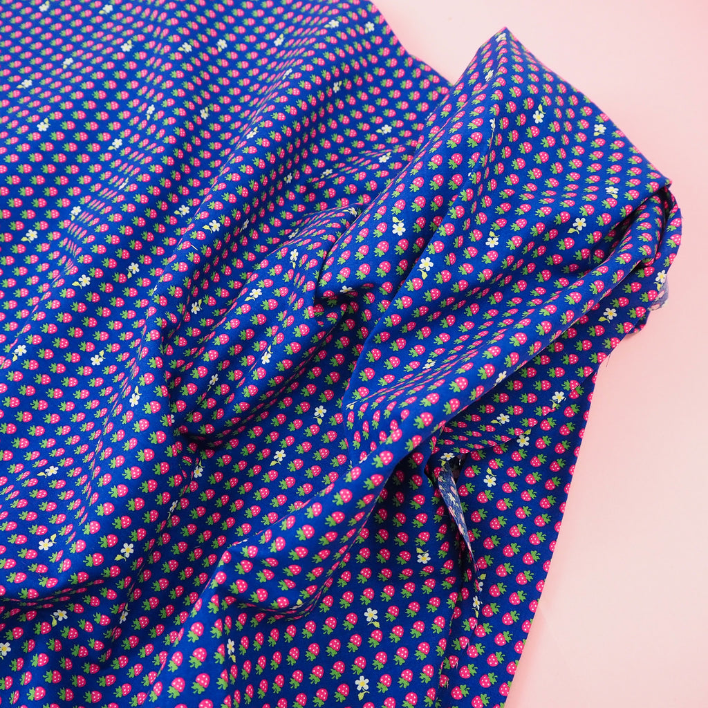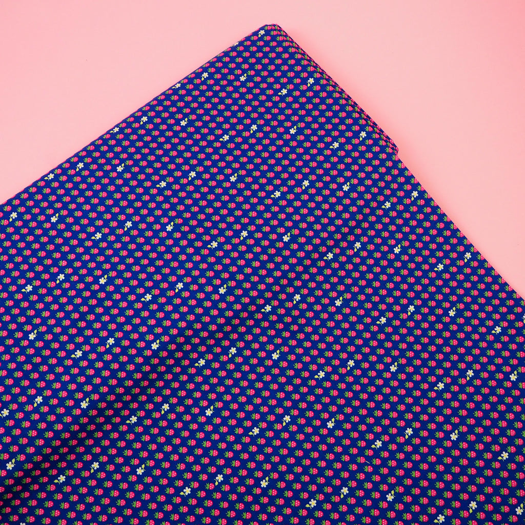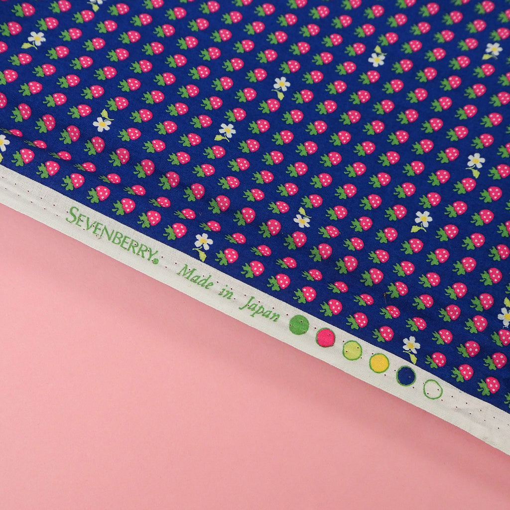 Smooth navy cotton with tiny pink strawberries and flowers from Japanese brand Sevenberry. This would make the cutest dress!