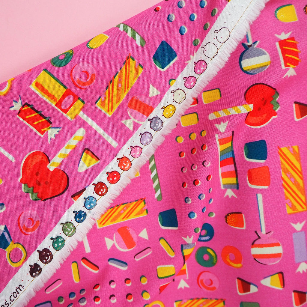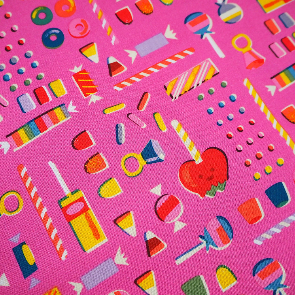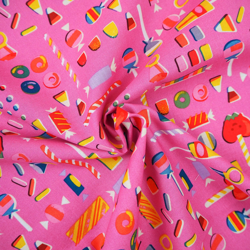 Retro candy in rainbow colours on a pink backdrop, featuring suckers, ring pops, gum drops, candy corns, life savers, and more. This quilting-weight cotton designed by Jill Howarth for Riley Blake is great for all your nostalgic clothing, Halloween projects and beyond!