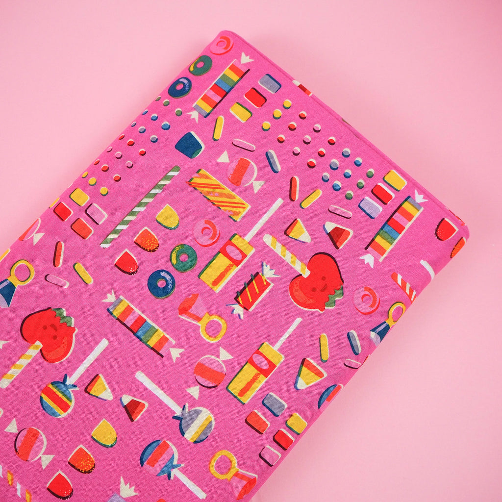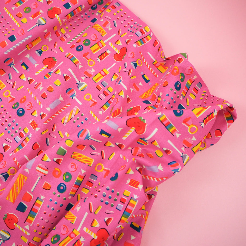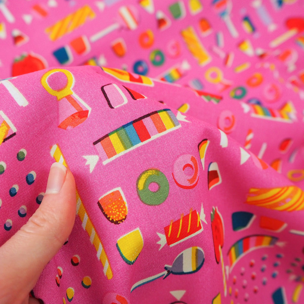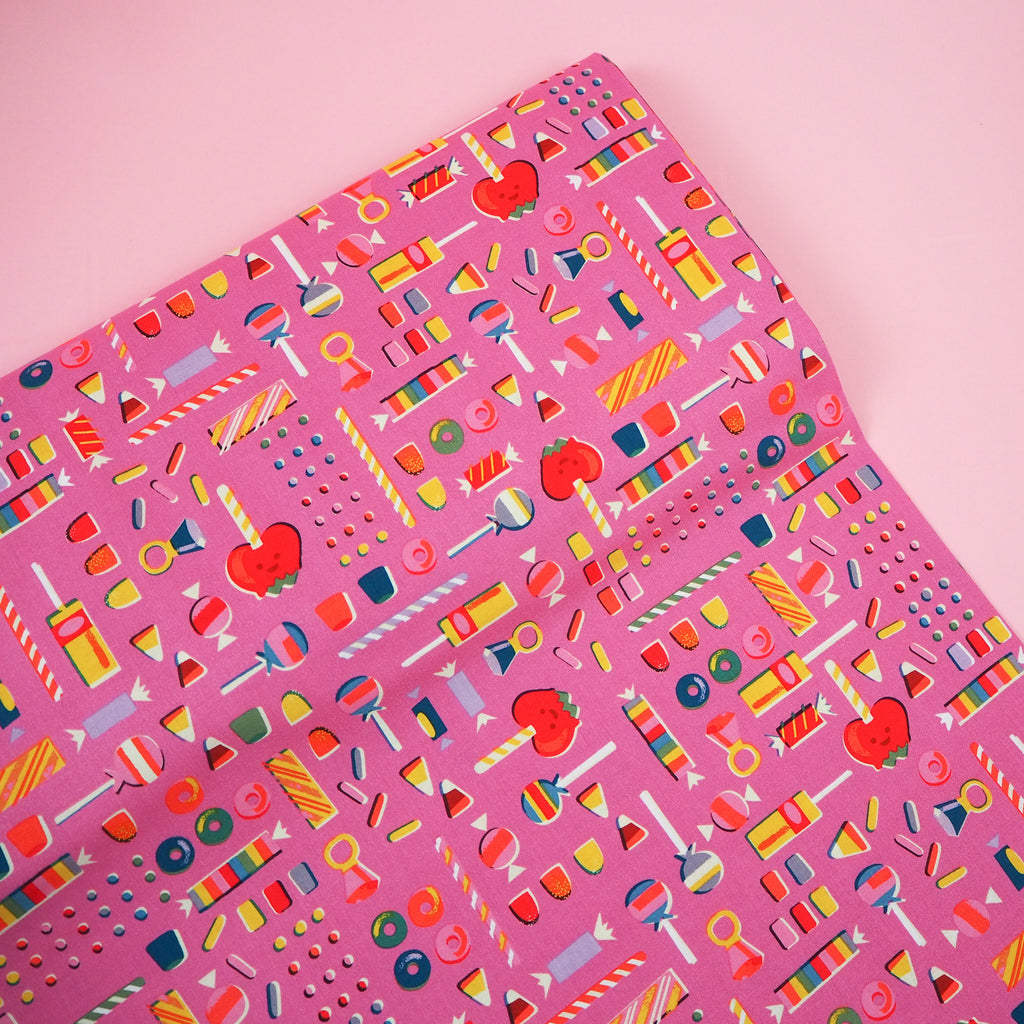 Retro candy in rainbow colours on a pink backdrop, featuring suckers, ring pops, gum drops, candy corns, life savers, and more. This quilting-weight cotton designed by Jill Howarth for Riley Blake is great for all your nostalgic clothing, Halloween projects and beyond!