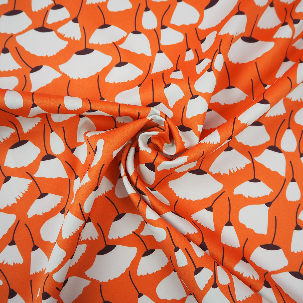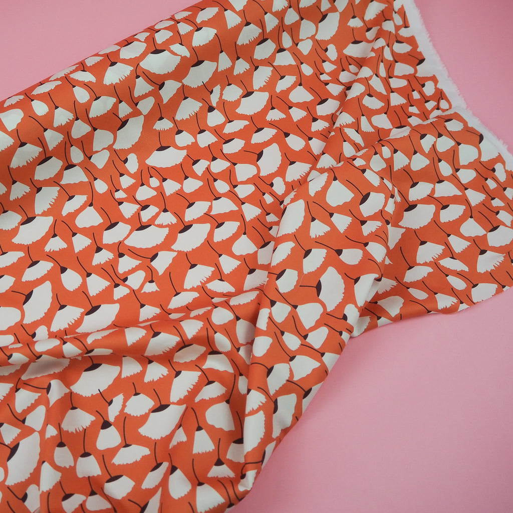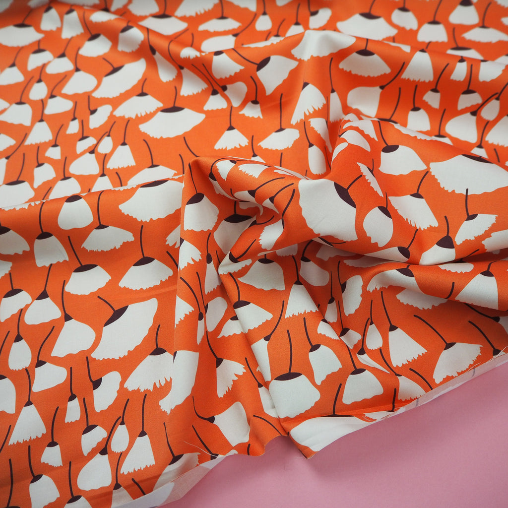 Beautiful burnt orange background with a pretty white floral pattern. This fabric has a mid-sized print on a rust-coloured base. Autumnal colours with a spring time blooms print.