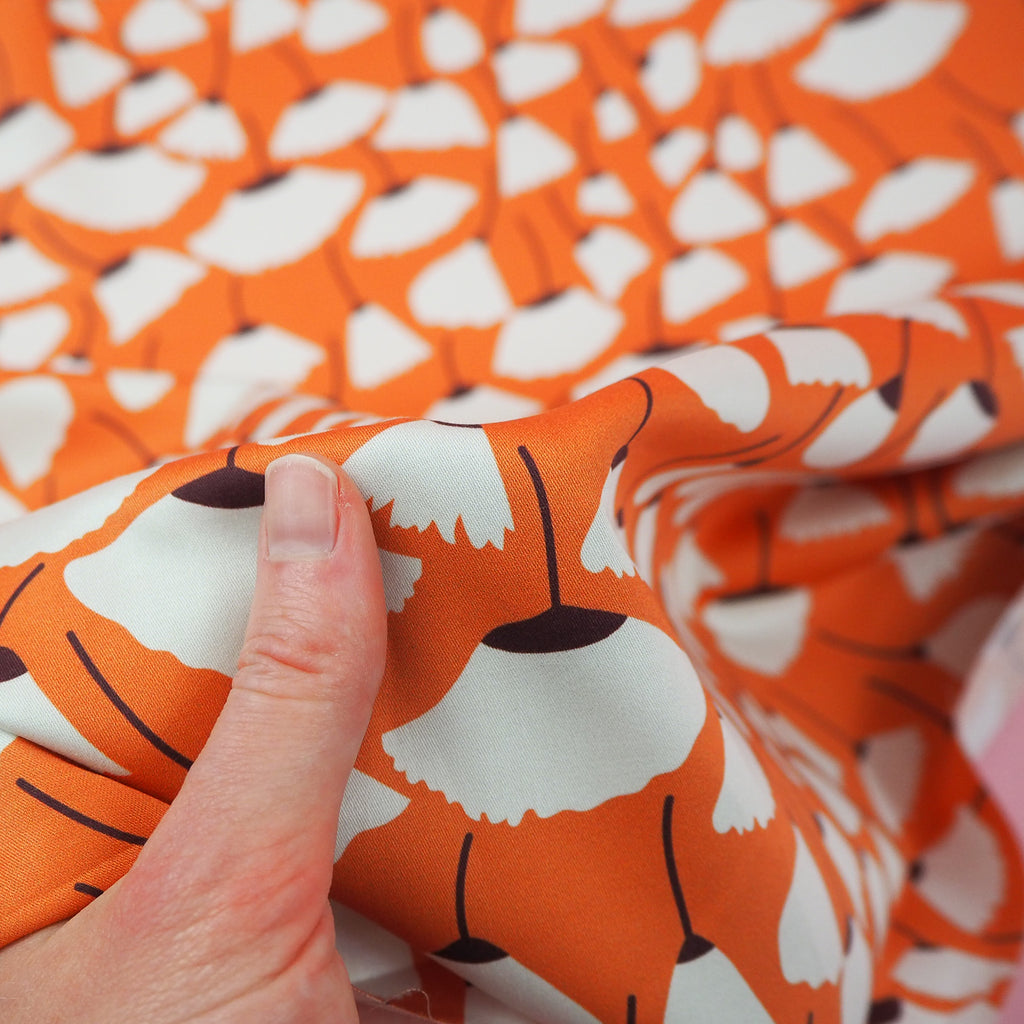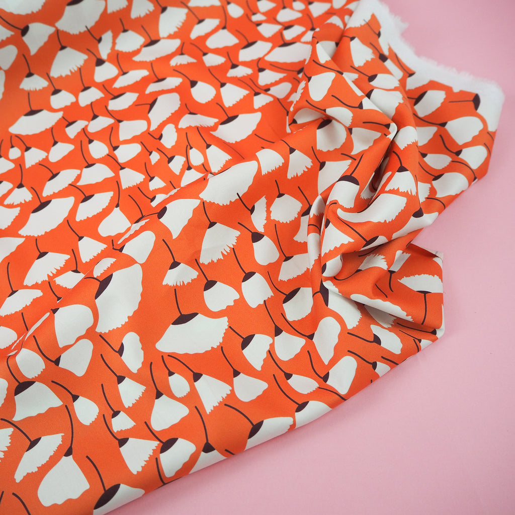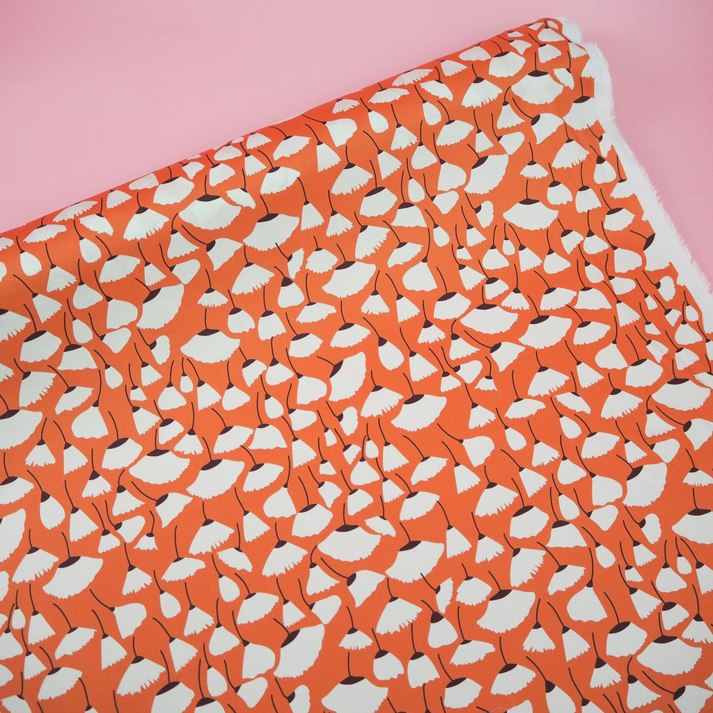 Beautiful burnt orange background with a pretty white floral pattern. This fabric has a mid-sized print on a rust-coloured base. Autumnal colours with a spring time blooms print.