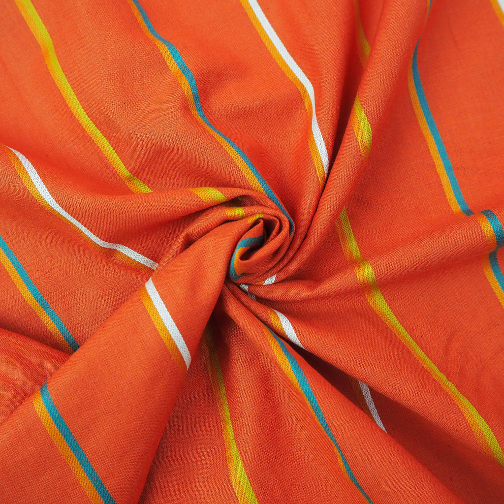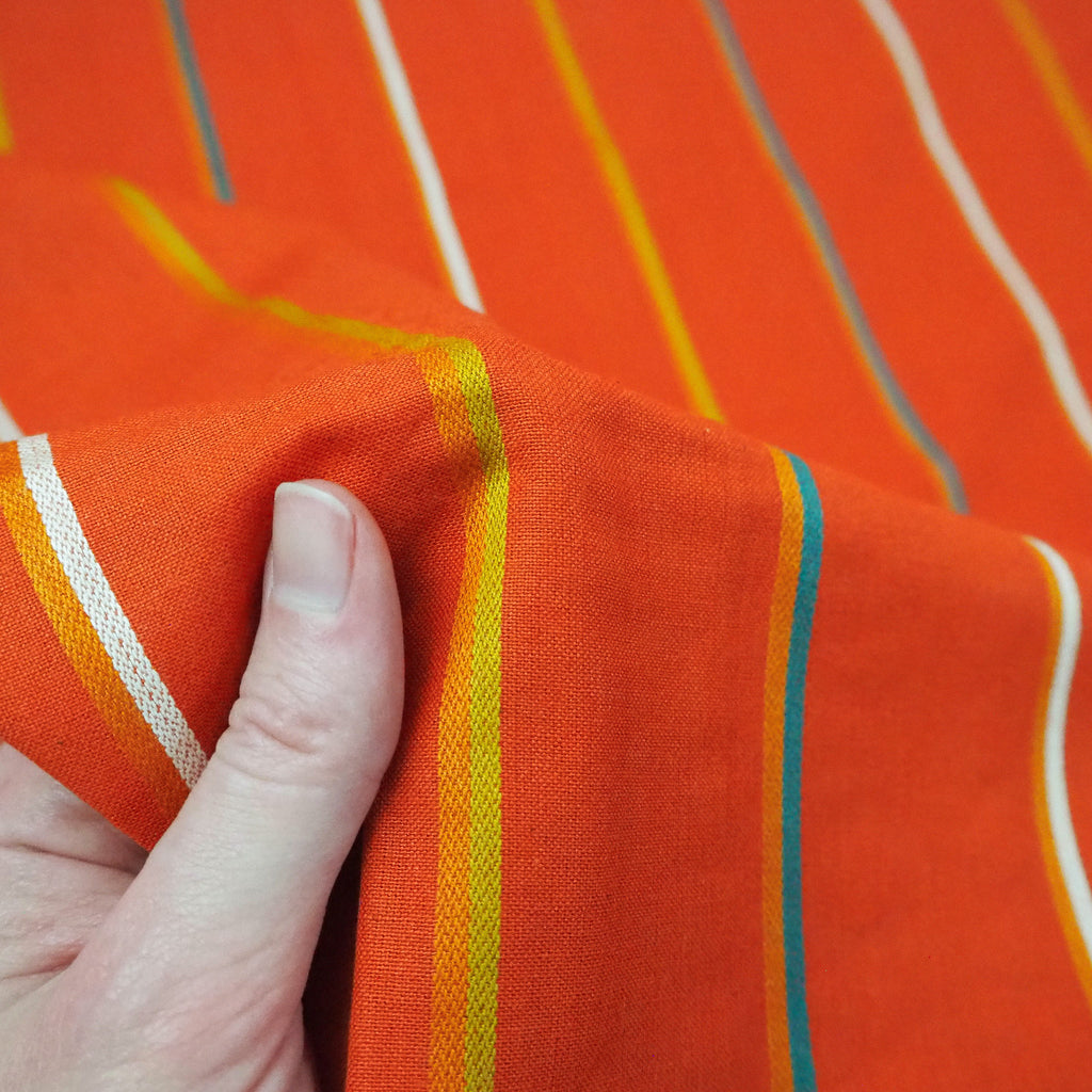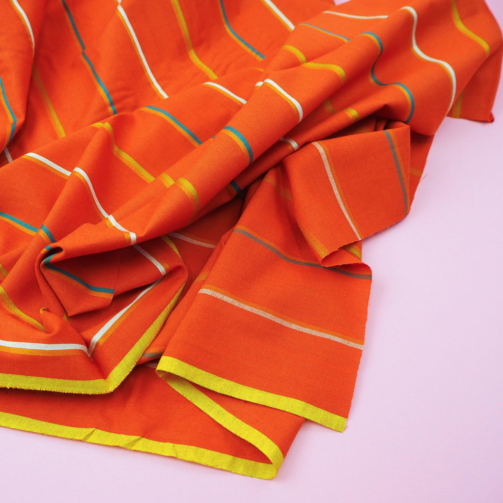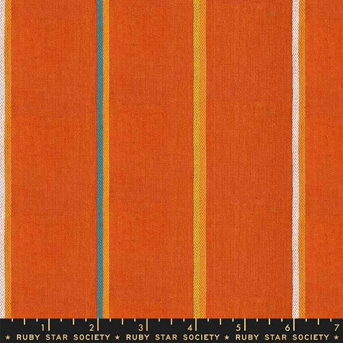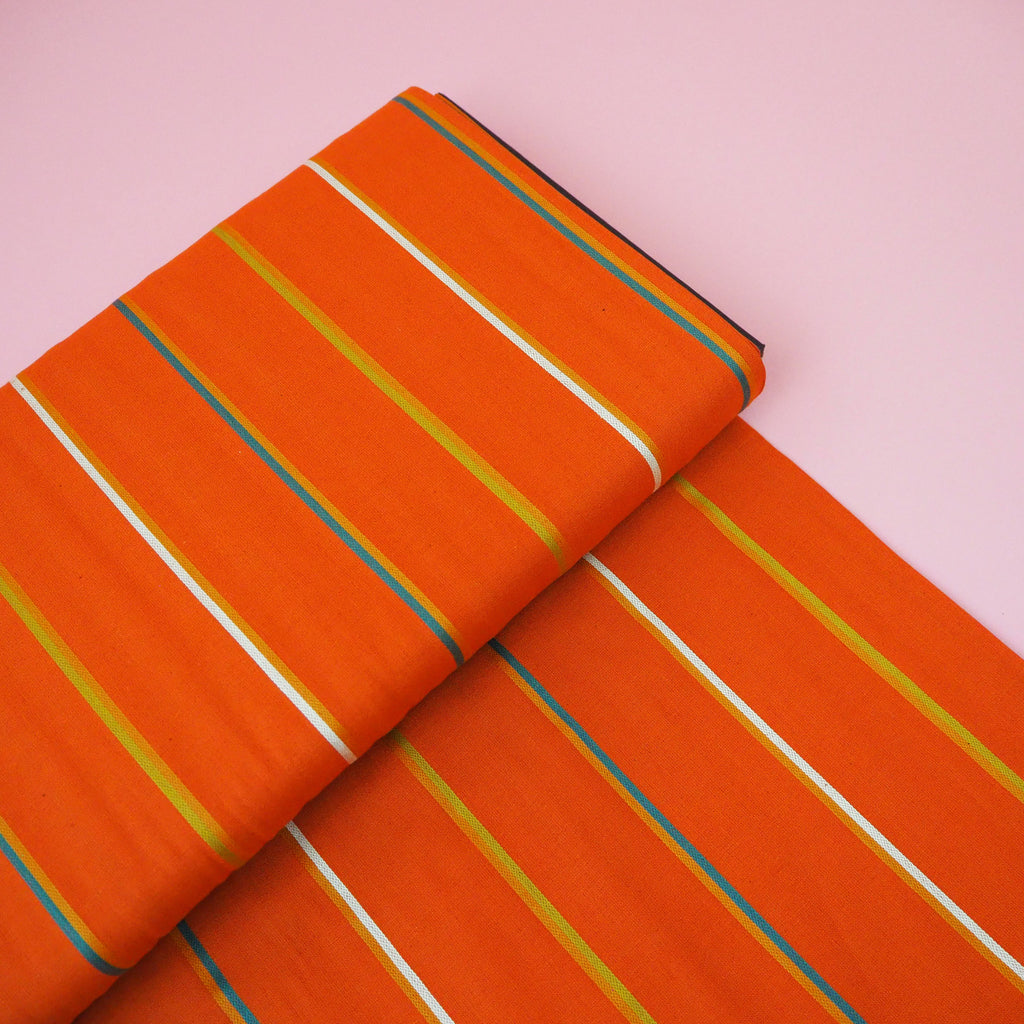 Pecan coloured cotton fabric with understated colourful stripes designed by Alexia Marcelle Abegg for Ruby Star Society.