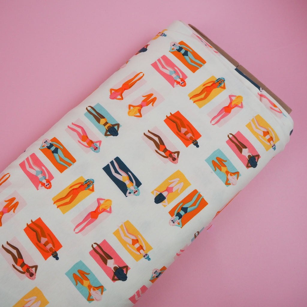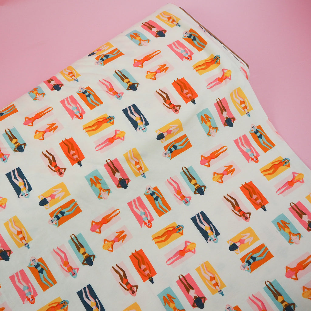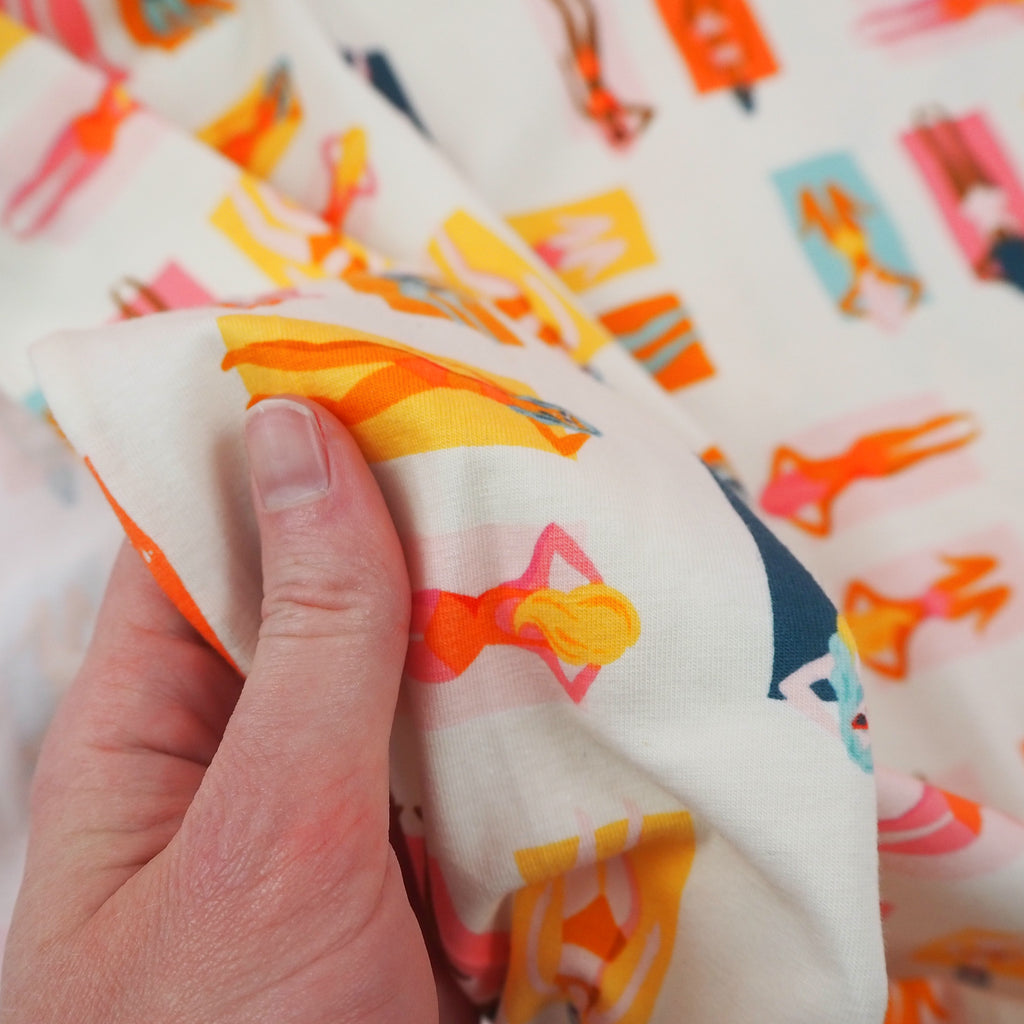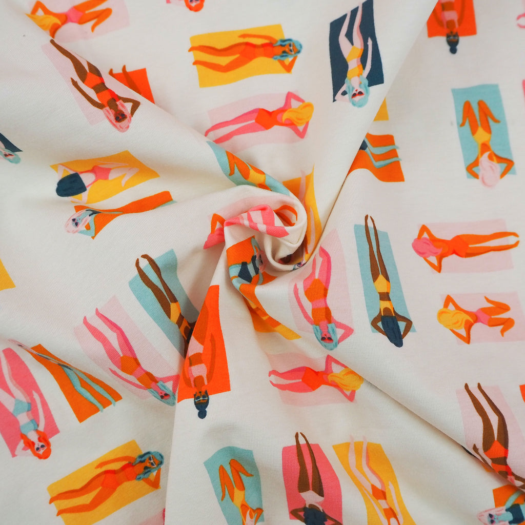 Beautiful opaque knit jersey fabric with amazing weight and drape. This fantastic fabric features sunbathers in warm tones with pops of orange, mustard and forest green. This is part of the Sunburst Fun in the Sun range for Art Gallery Fabrics which will transport you to the sunshine of Palm Springs.