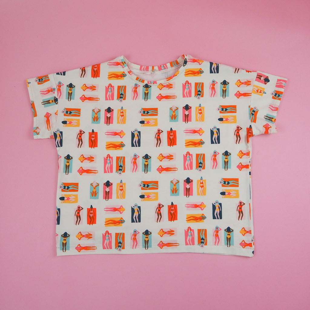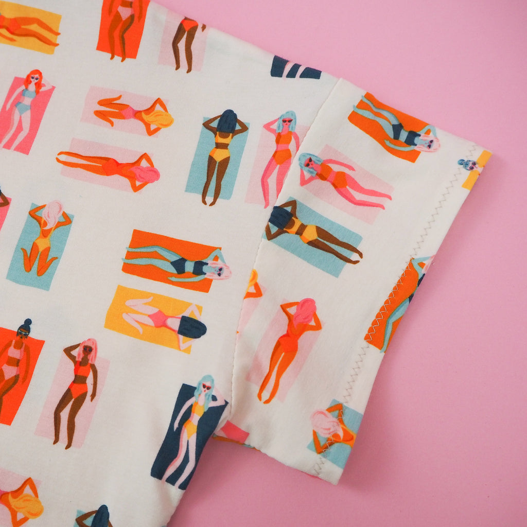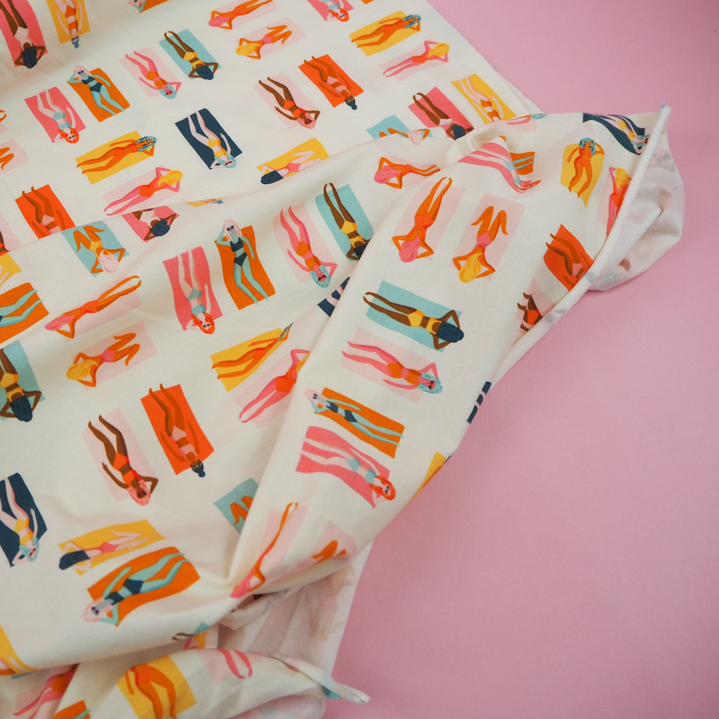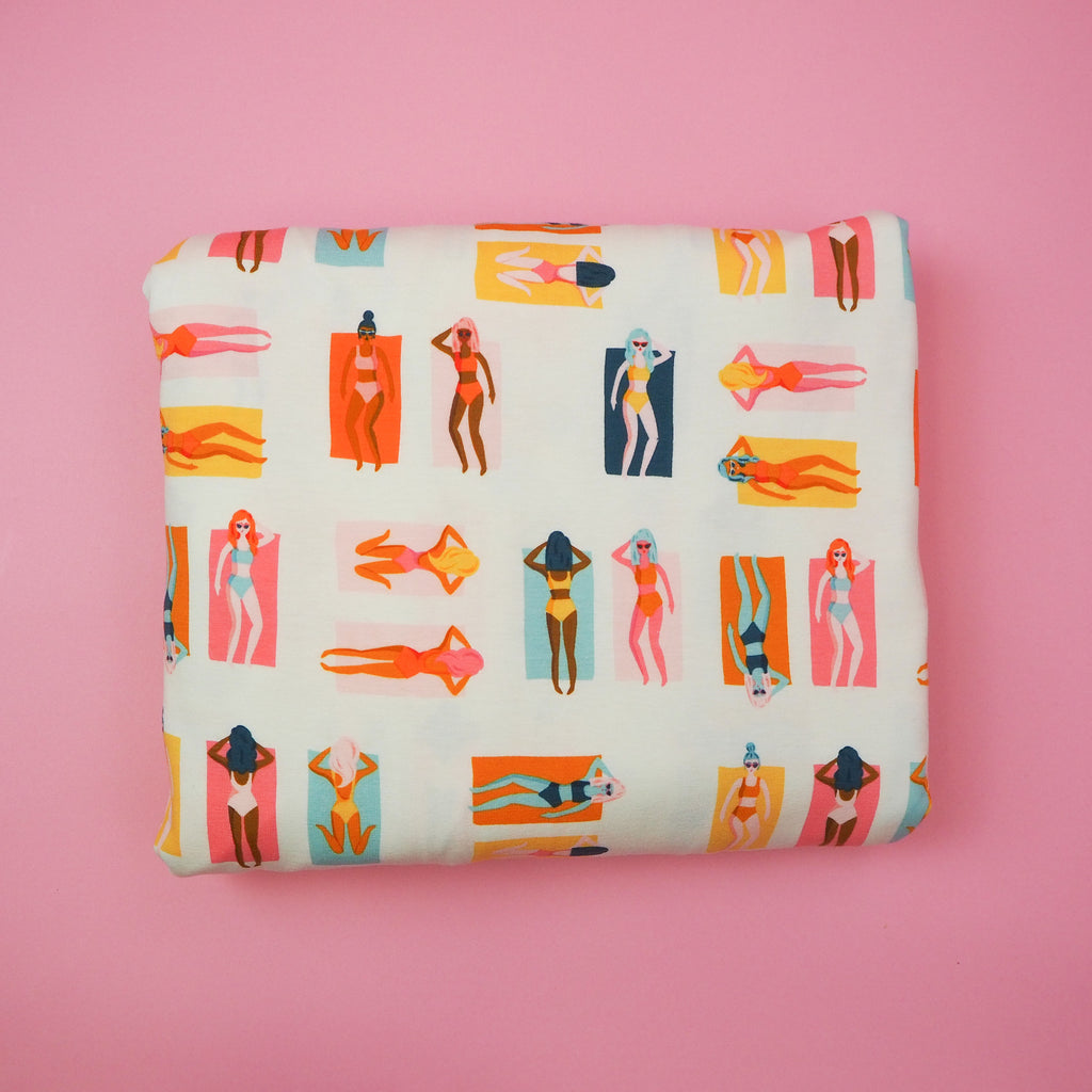 Beautiful opaque knit jersey fabric with amazing weight and drape. This fantastic fabric features sunbathers in warm tones with pops of orange, mustard and forest green. This is part of the Sunburst Fun in the Sun range for Art Gallery Fabrics which will transport you to the sunshine of Palm Springs.