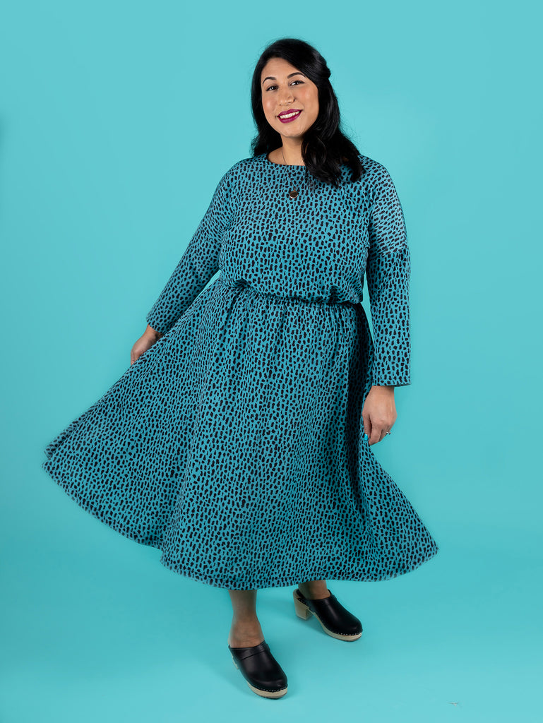 Choose between knee-length or midi-length skirt, with grown-on short sleeves or bracelet-length drop shoulder sleeves, with optional deep patch pockets. To make it even more versatile, you can make this dress in either woven fabric or stretchy jersey.