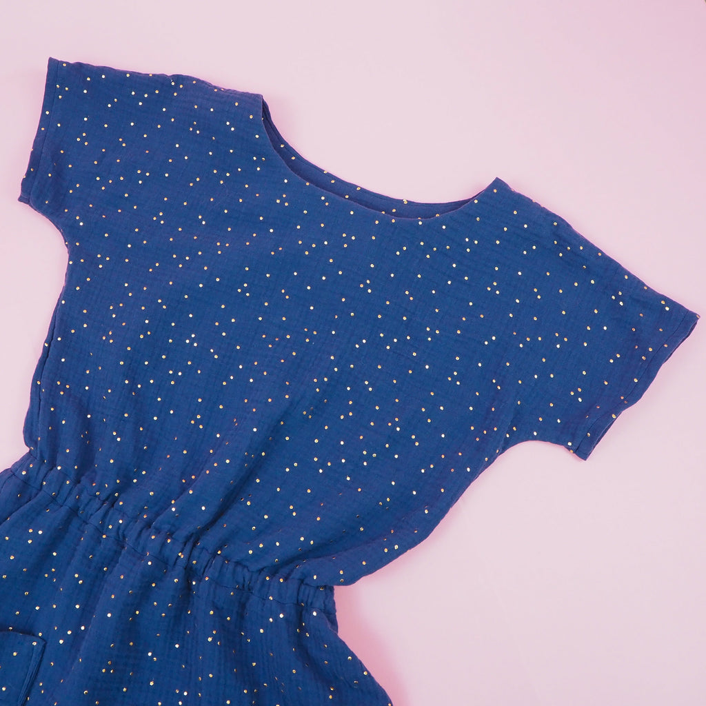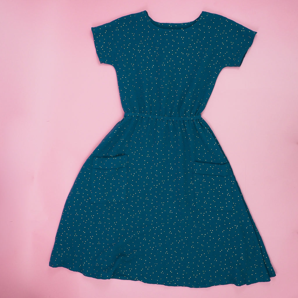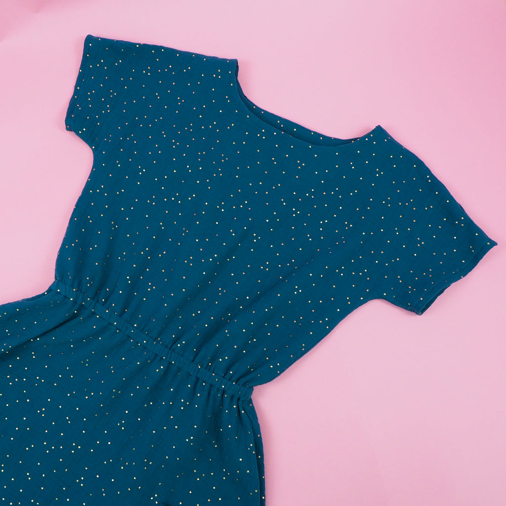 The two dresses we made in the pictures are made from Gold Dot Double Gauze in Rich Peacock and Navy.