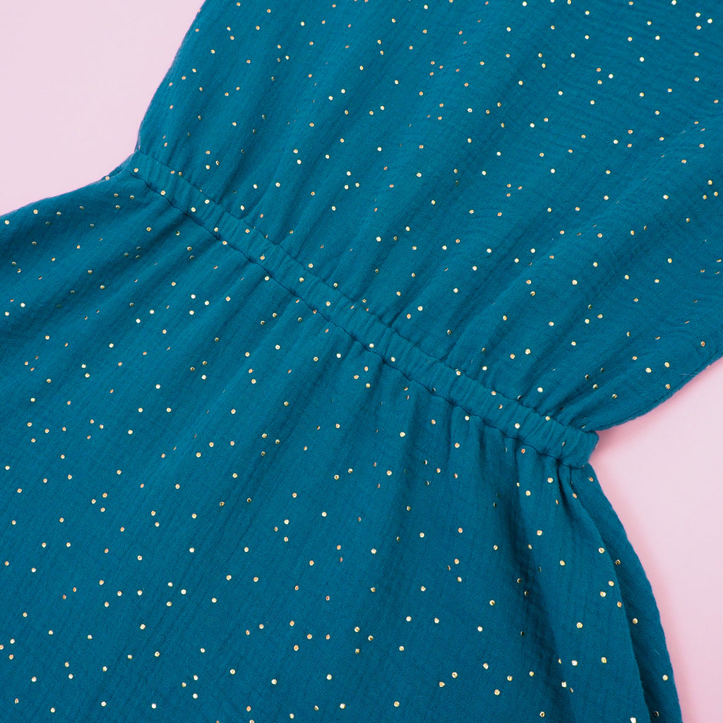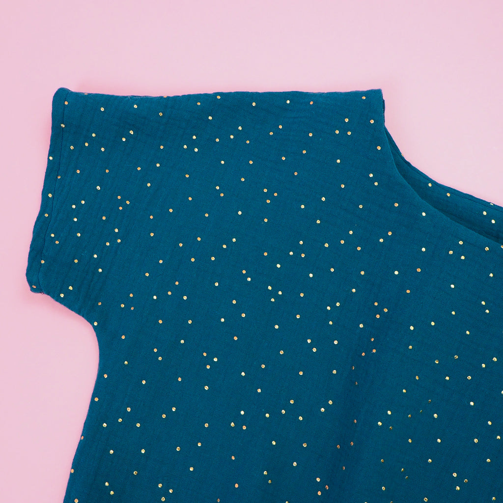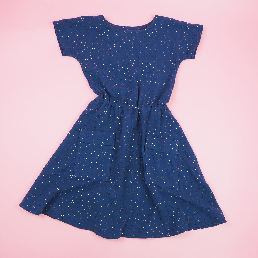 The two dresses we made in the pictures are made from Gold Dot Double Gauze in Rich Peacock and Navy.