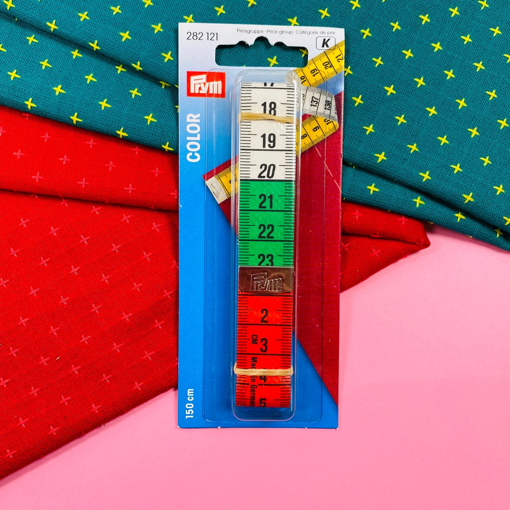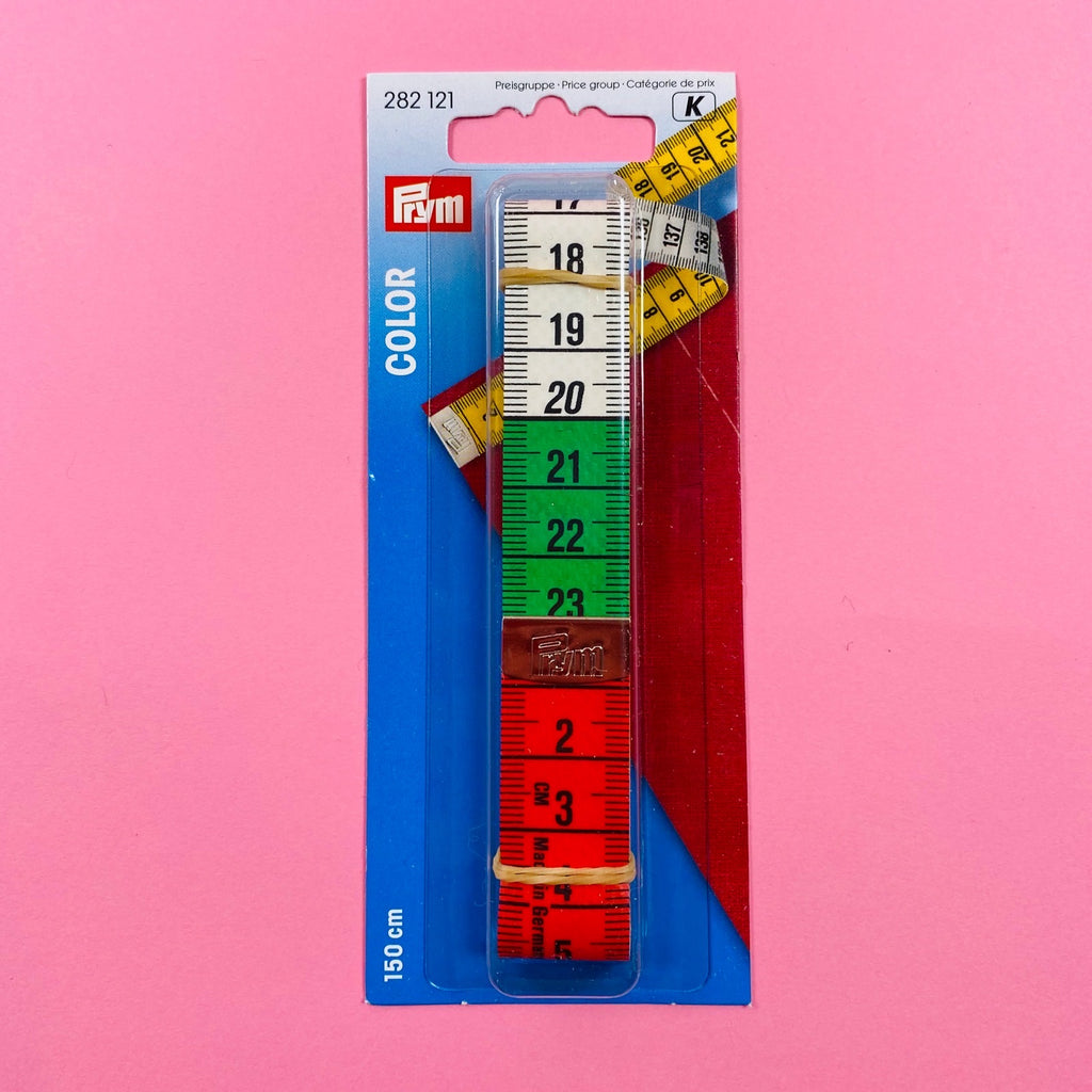 Classic, good-quality tailors measuring tape with a colourful twist. Back is plain yellow, the front has stripes of different colours.
