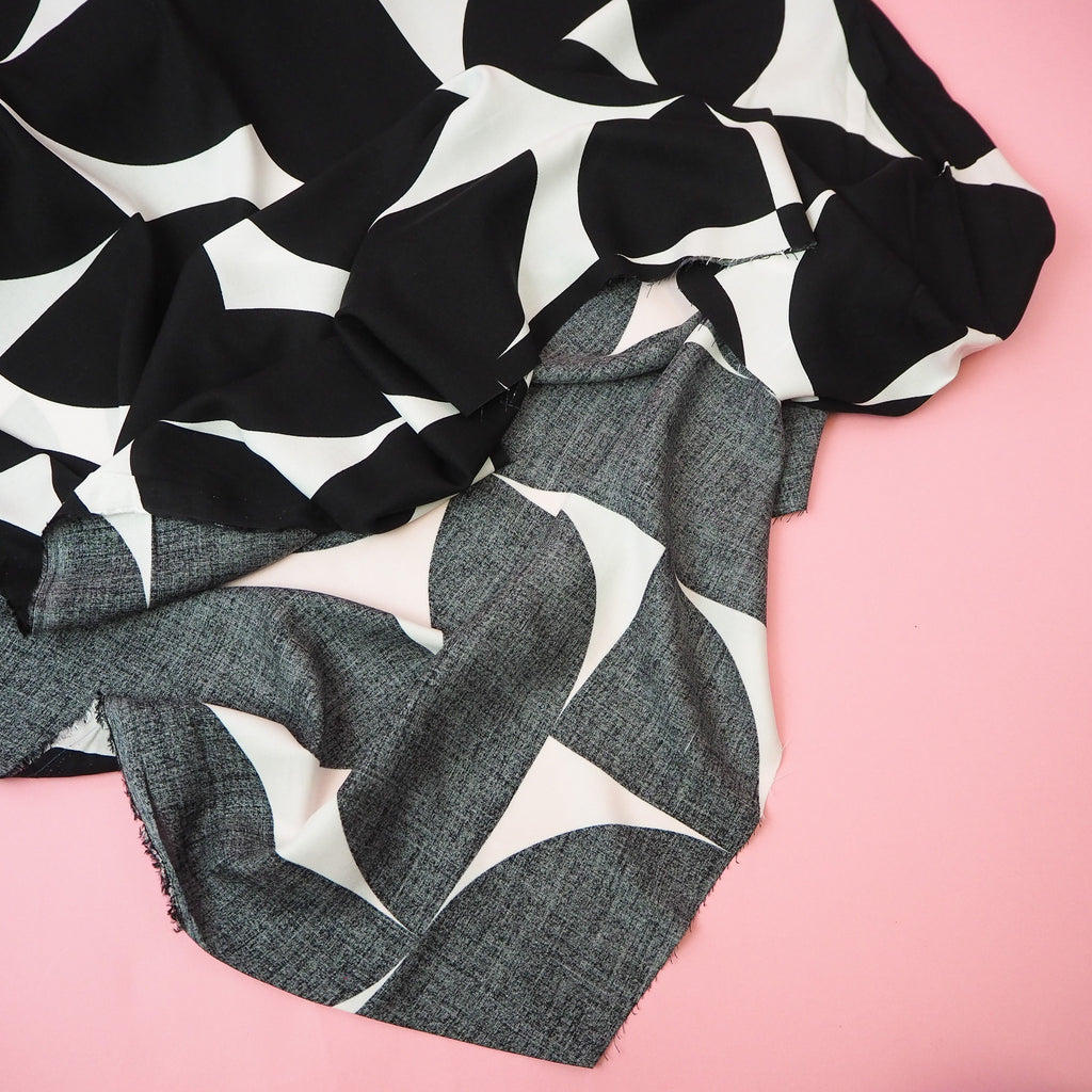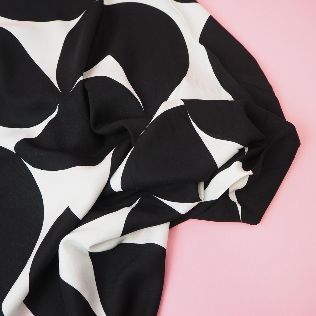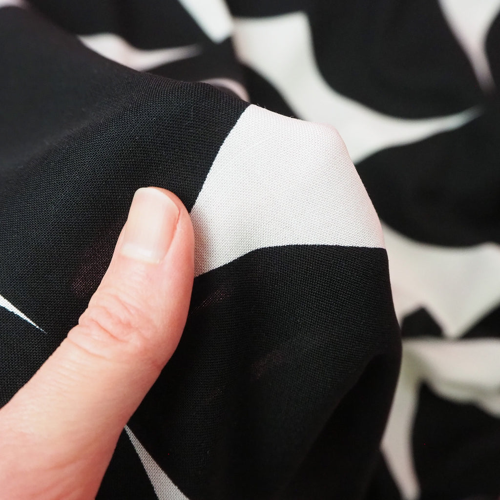 This lovely black and white viscose fabric is floaty and light with beautiful drape.