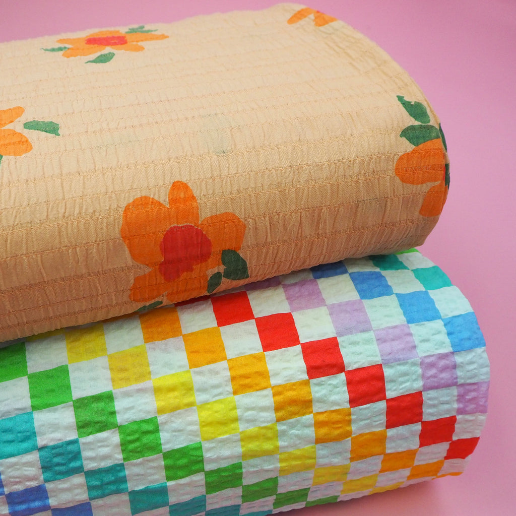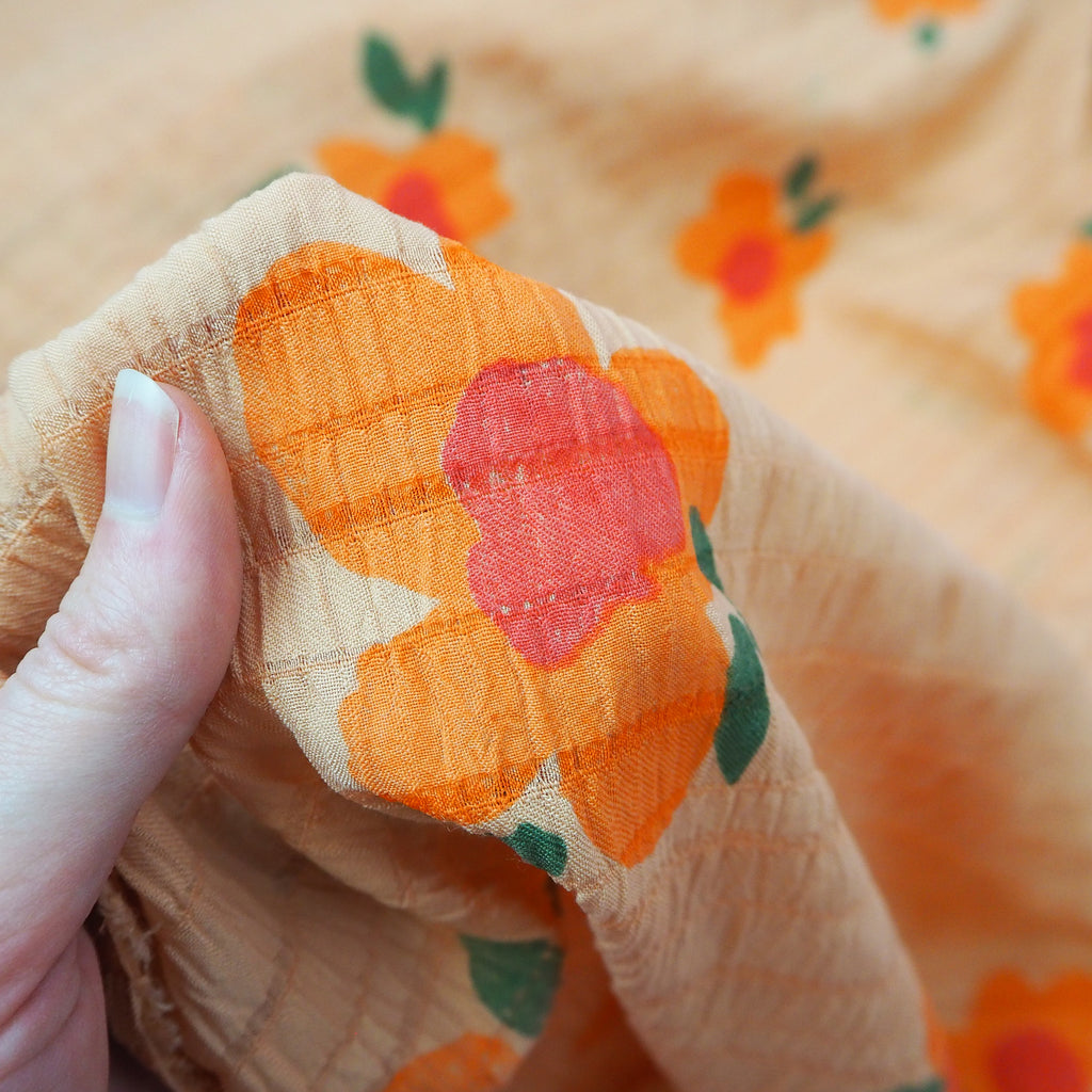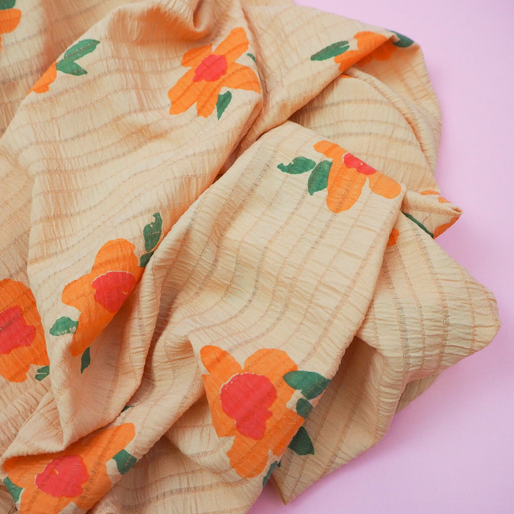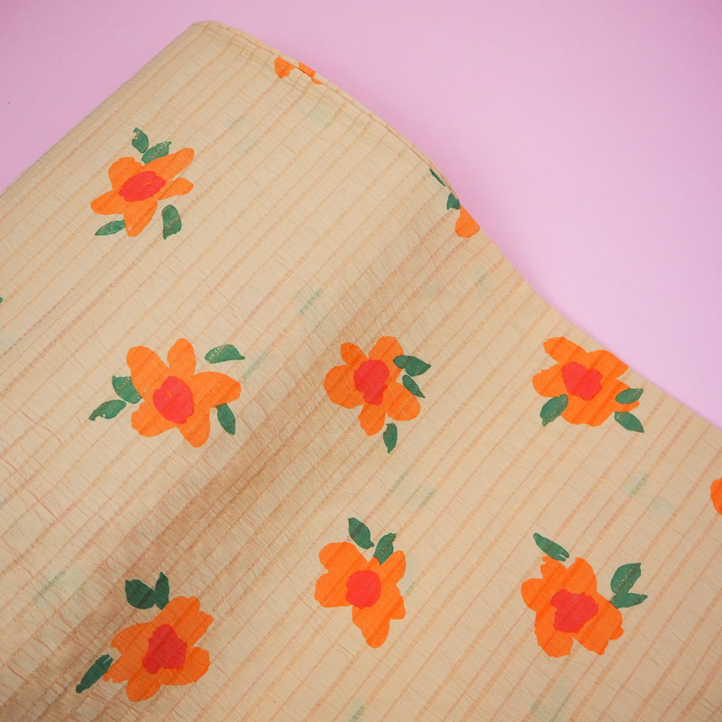 Hand block printed orange and red flowers on an orange background. Lightweight with a fabulous bold print and linear texture, this viscose seersucker fabric would make a beautiful dress.