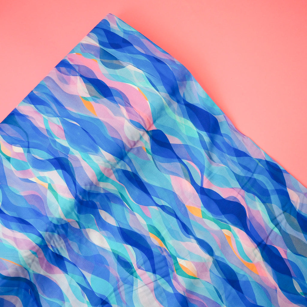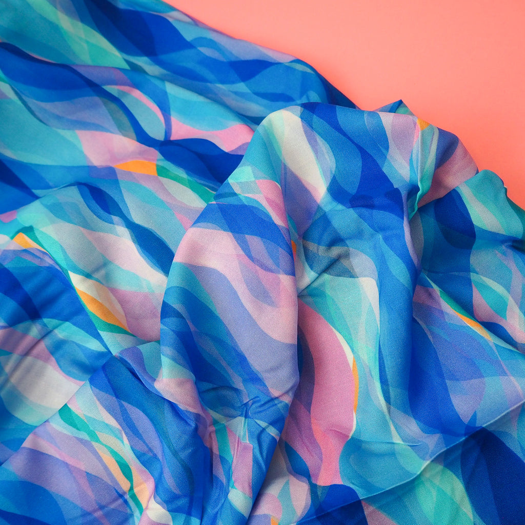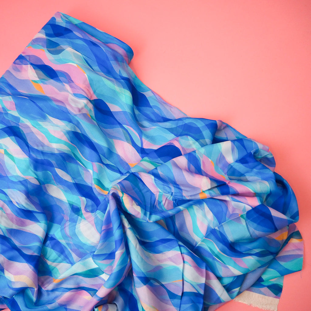 A soft and floaty rayon fabric with a beautiful blue waves from Rachel Parker's Chroma collection.