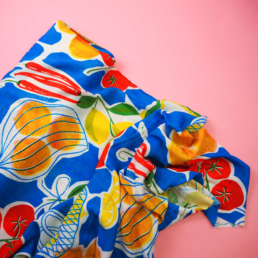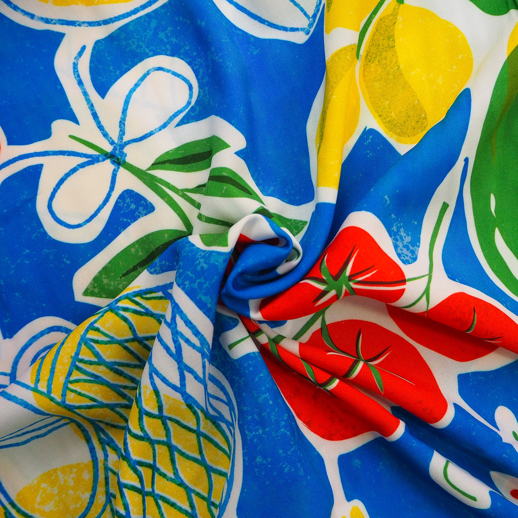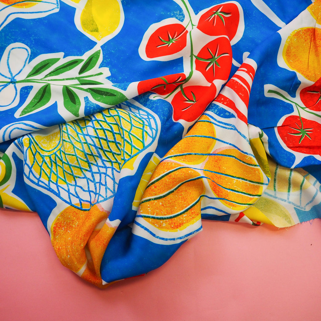 This joyful viscose fabric is a tribute to vibrant summer markets! Tomatoes, oranges, lemons, and chili peppers are scattered across the surface, bringing a fresh Mediterranean vibe. The fruity print radiates joy and color – ideal for sunny creations with a cheerful touch. This fabric has a soft drape, great for garment sewing.