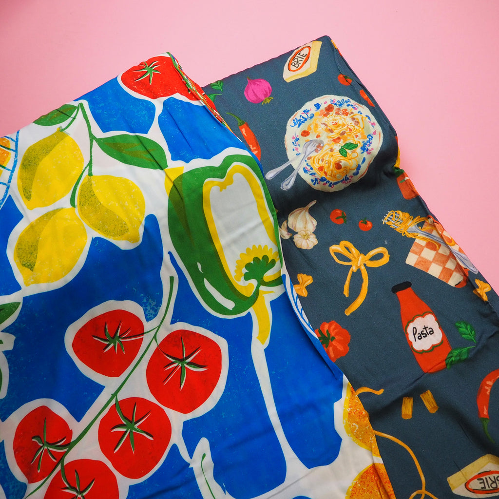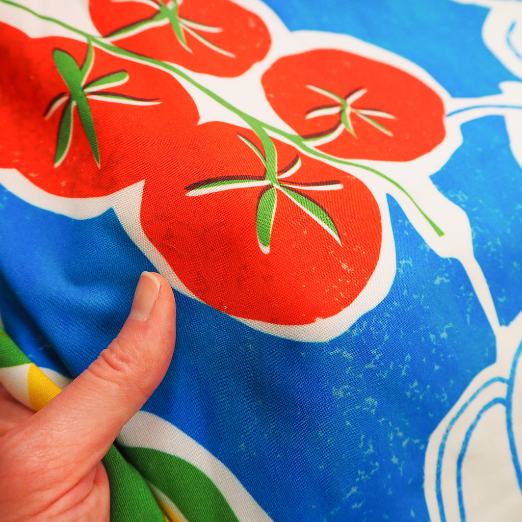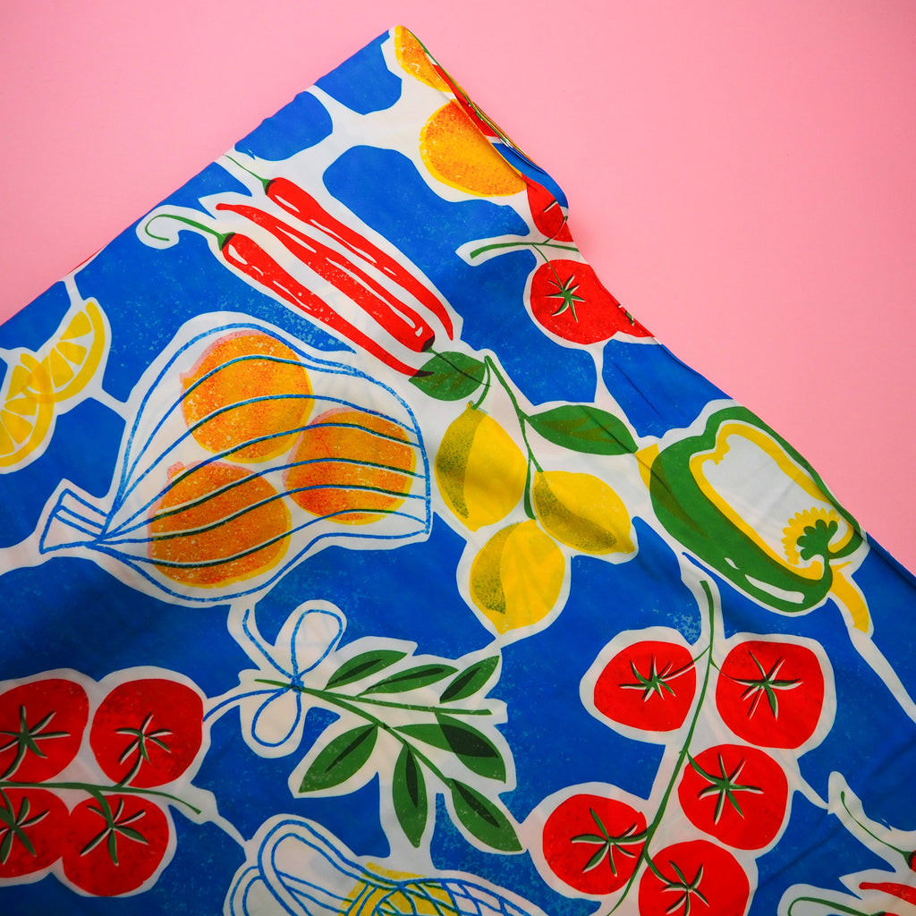 This joyful viscose fabric is a tribute to vibrant summer markets! Tomatoes, oranges, lemons, and chili peppers are scattered across the surface, bringing a fresh Mediterranean vibe. The fruity print radiates joy and color – ideal for sunny creations with a cheerful touch. This fabric has a soft drape, great for garment sewing.
