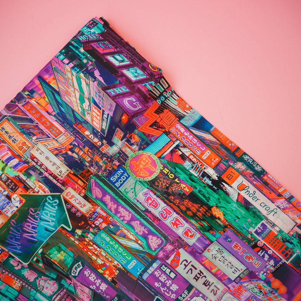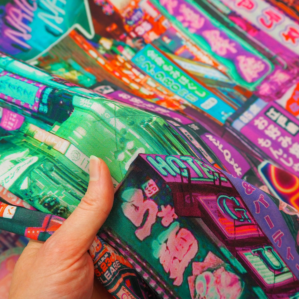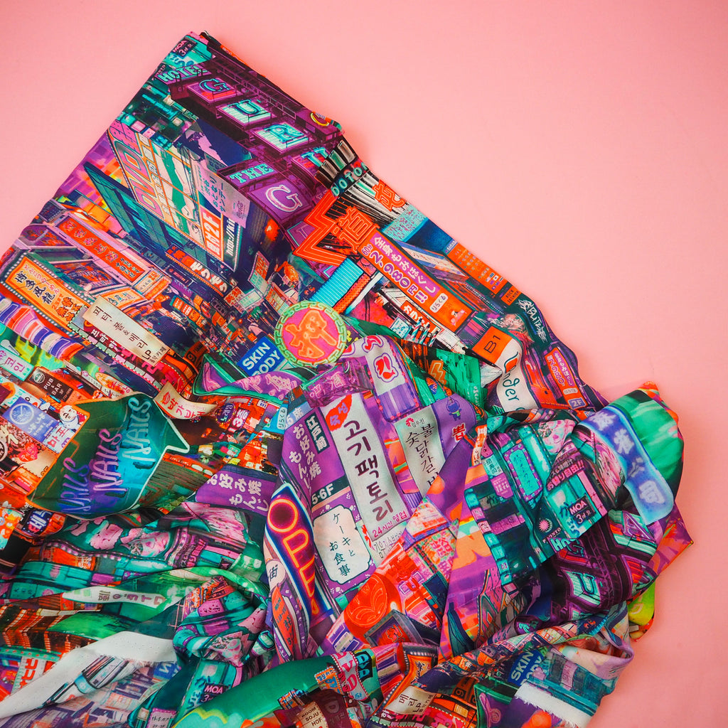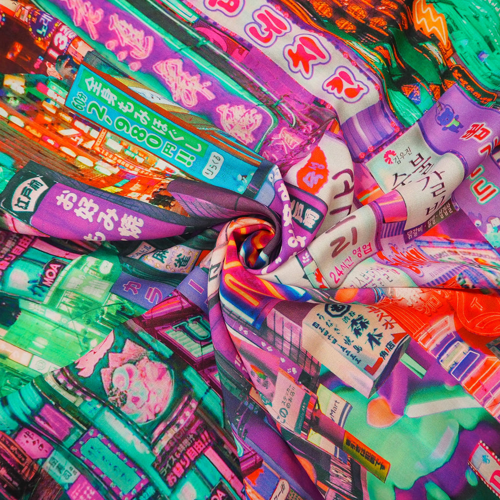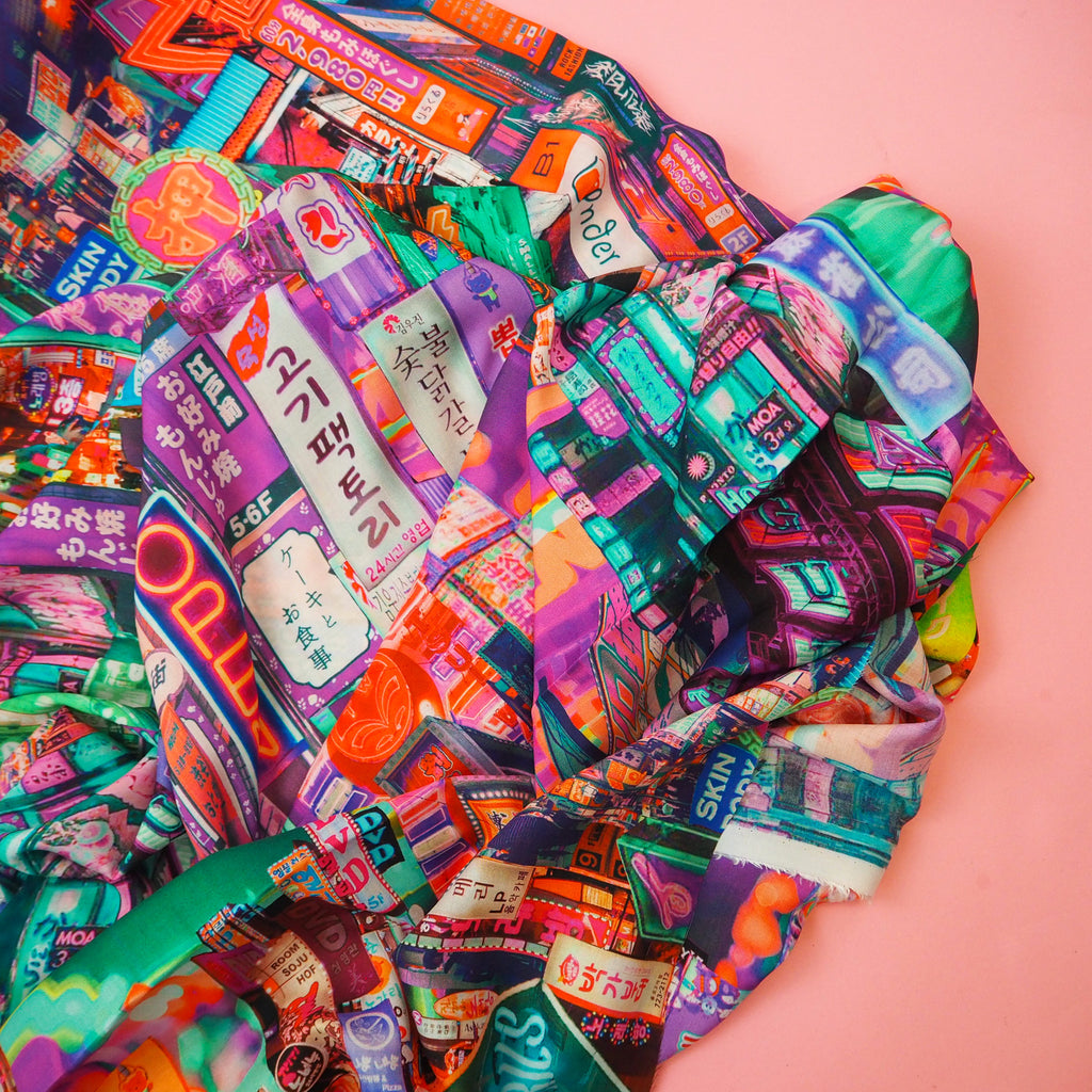 This amazing viscose features a bright, busy print full of neon signs. This would make an incredible statement dress!