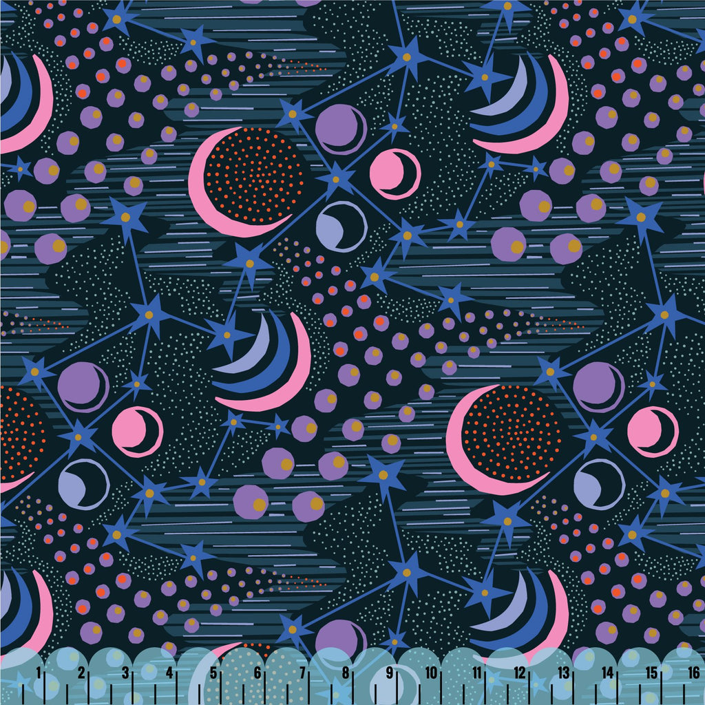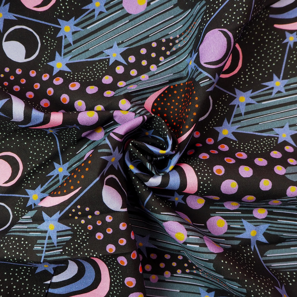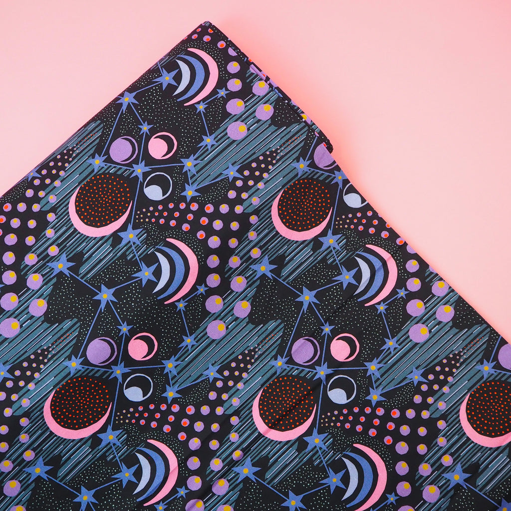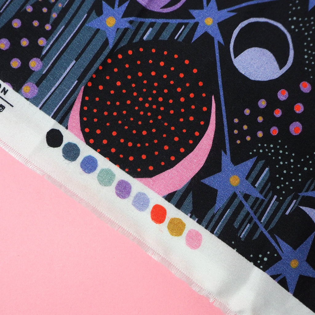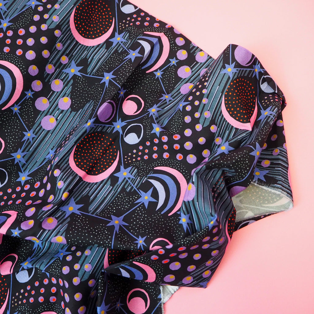 A soft cotton/rayon fabric with a gorgeous moon and stars pattern in pinks and purples.