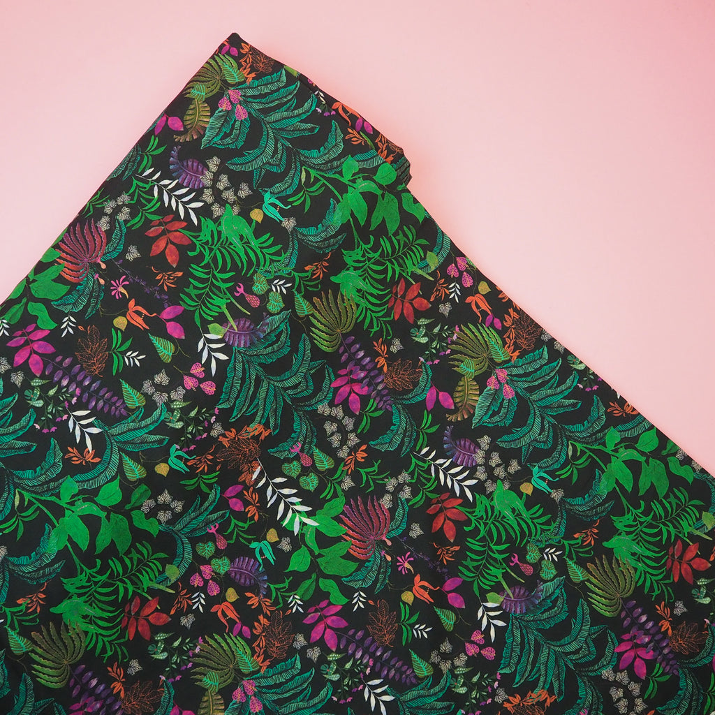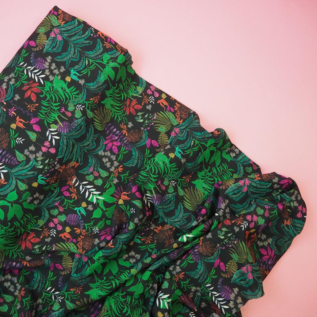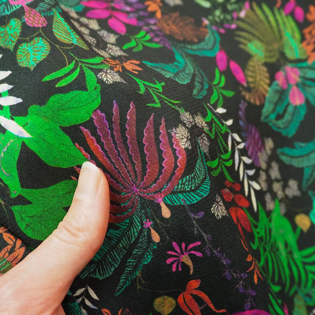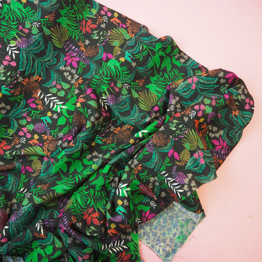 This soft Morracain style viscose crepe has tones of neon green, fuchsia, moss, rust red and black.