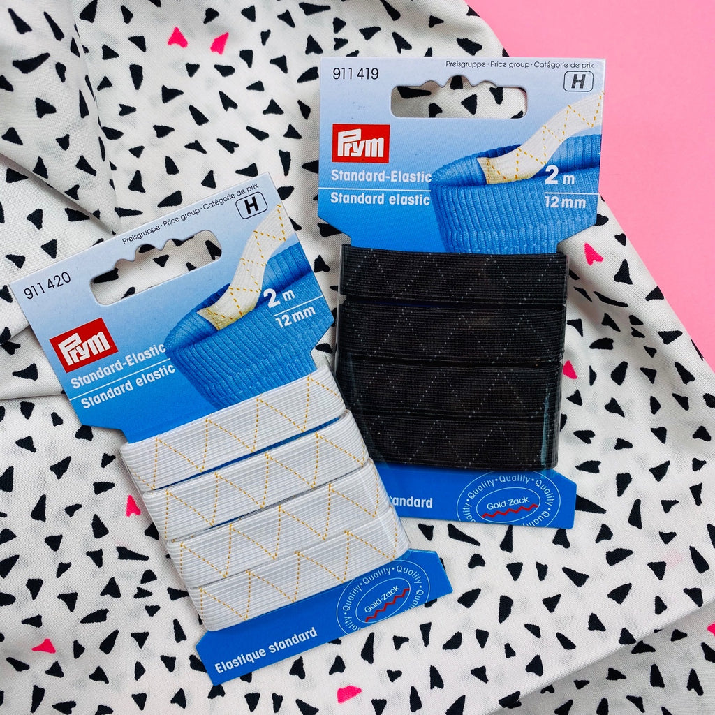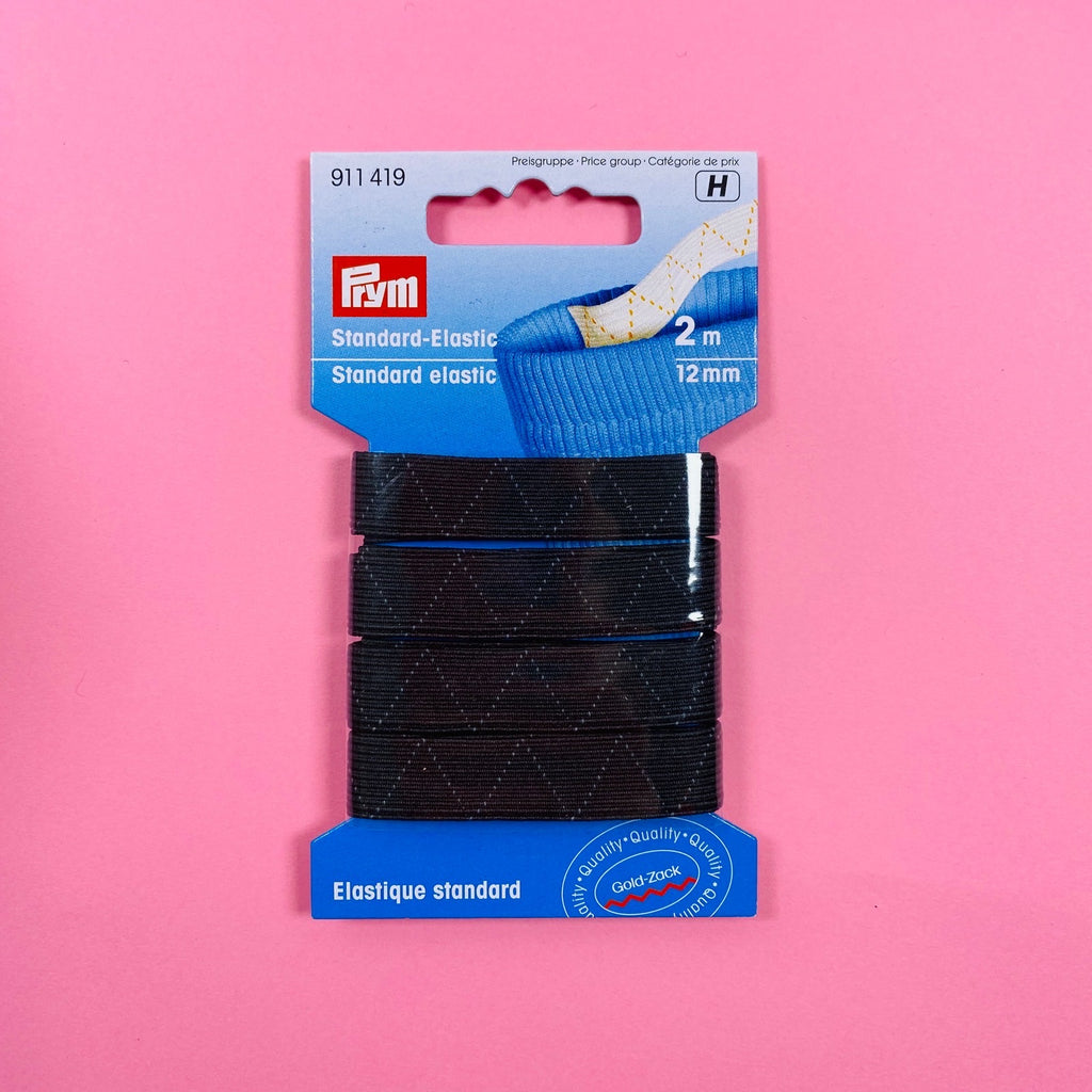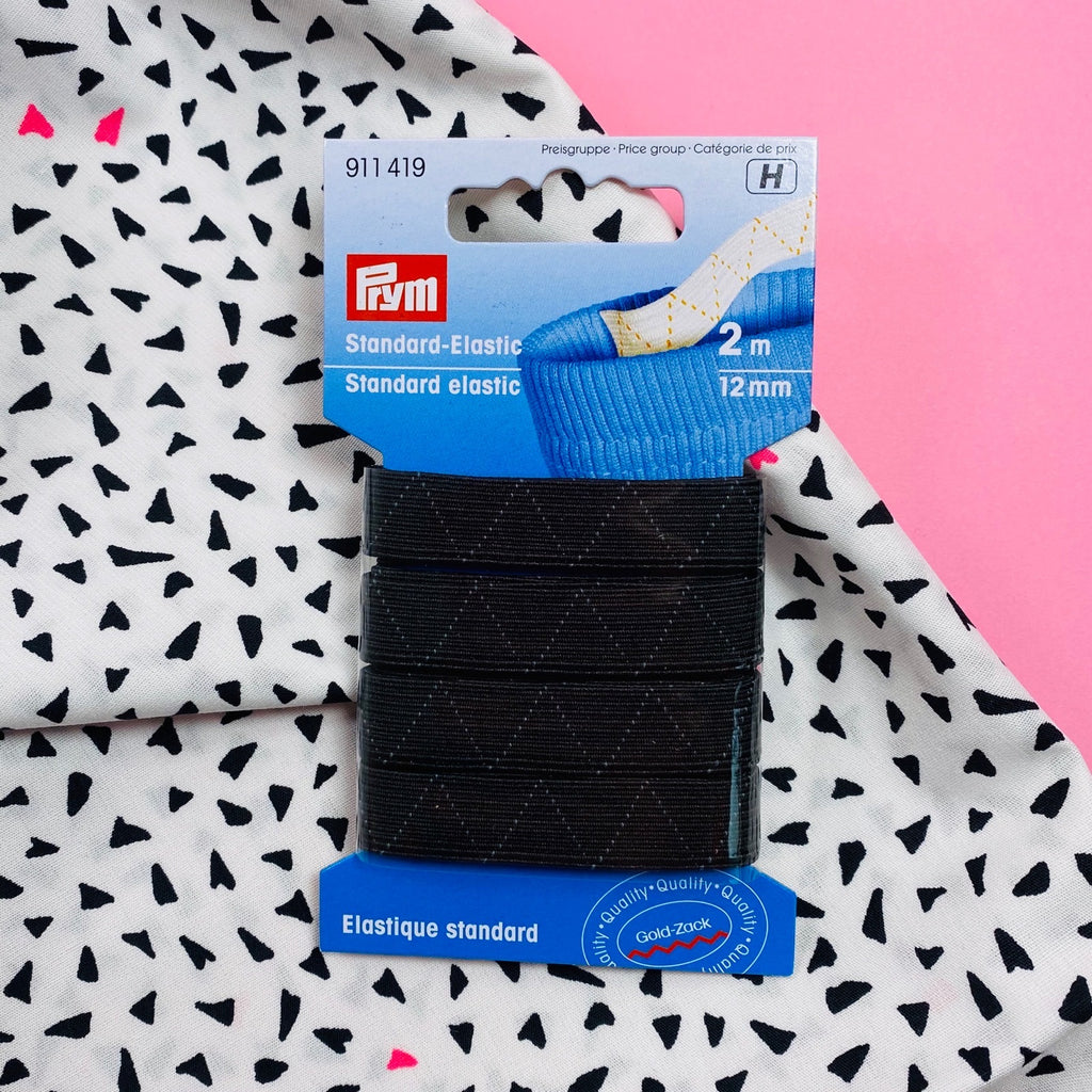 This card contains 2 metres of 12 mm thick elastic. We would recommend using black elastic for darker coloured garments.