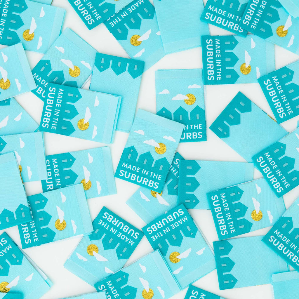 Are you creating amongst green lawns and shopping plazas? Use these adorable tags to label your handmade projects! Each label features the text "made in the suburbs" and a row of houses with a small metallic gold sun. They are super soft to the touch, fully washable and can handle the heat of the dryer.