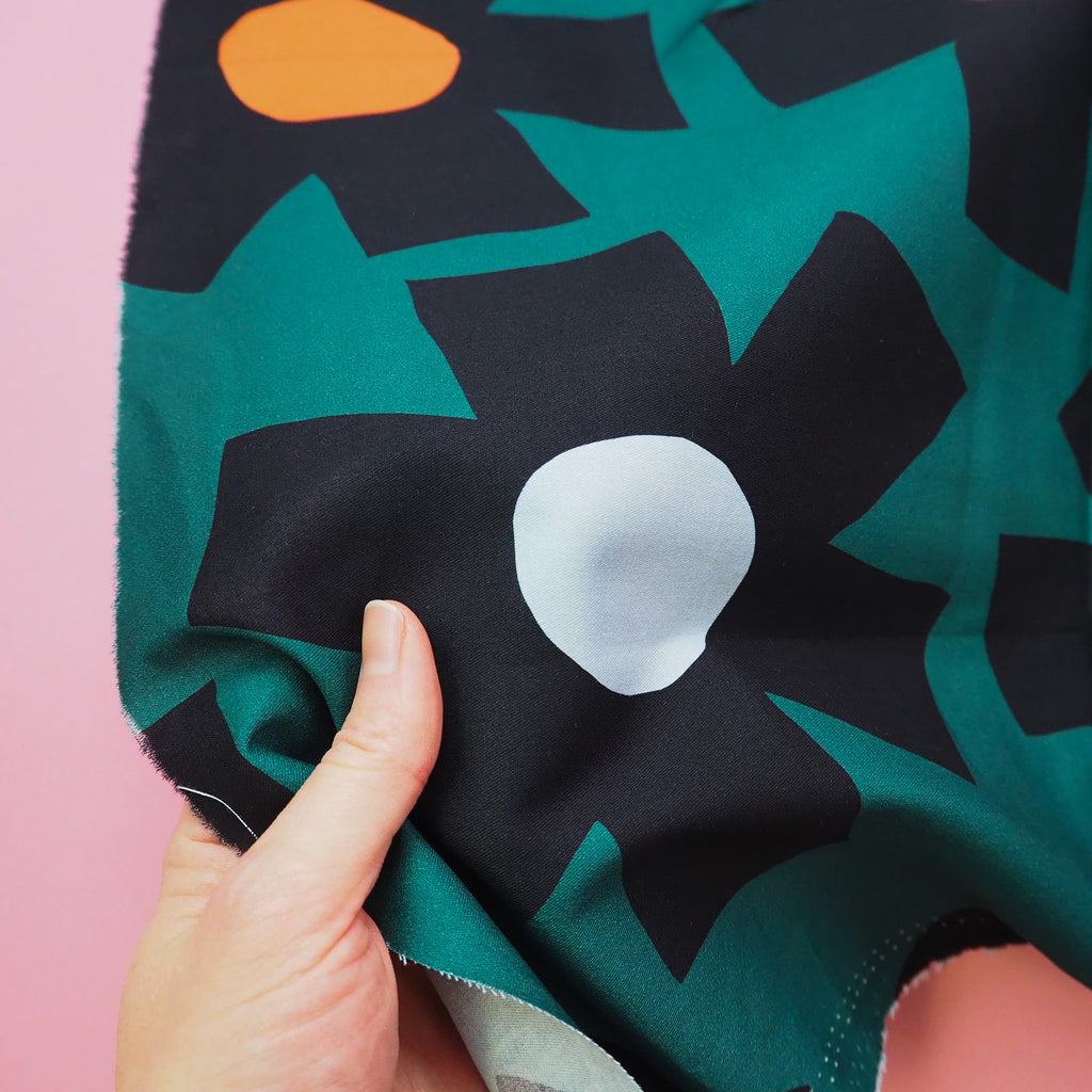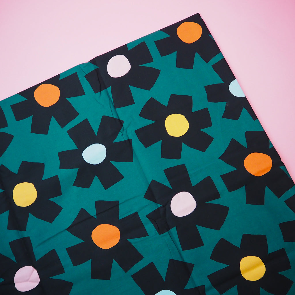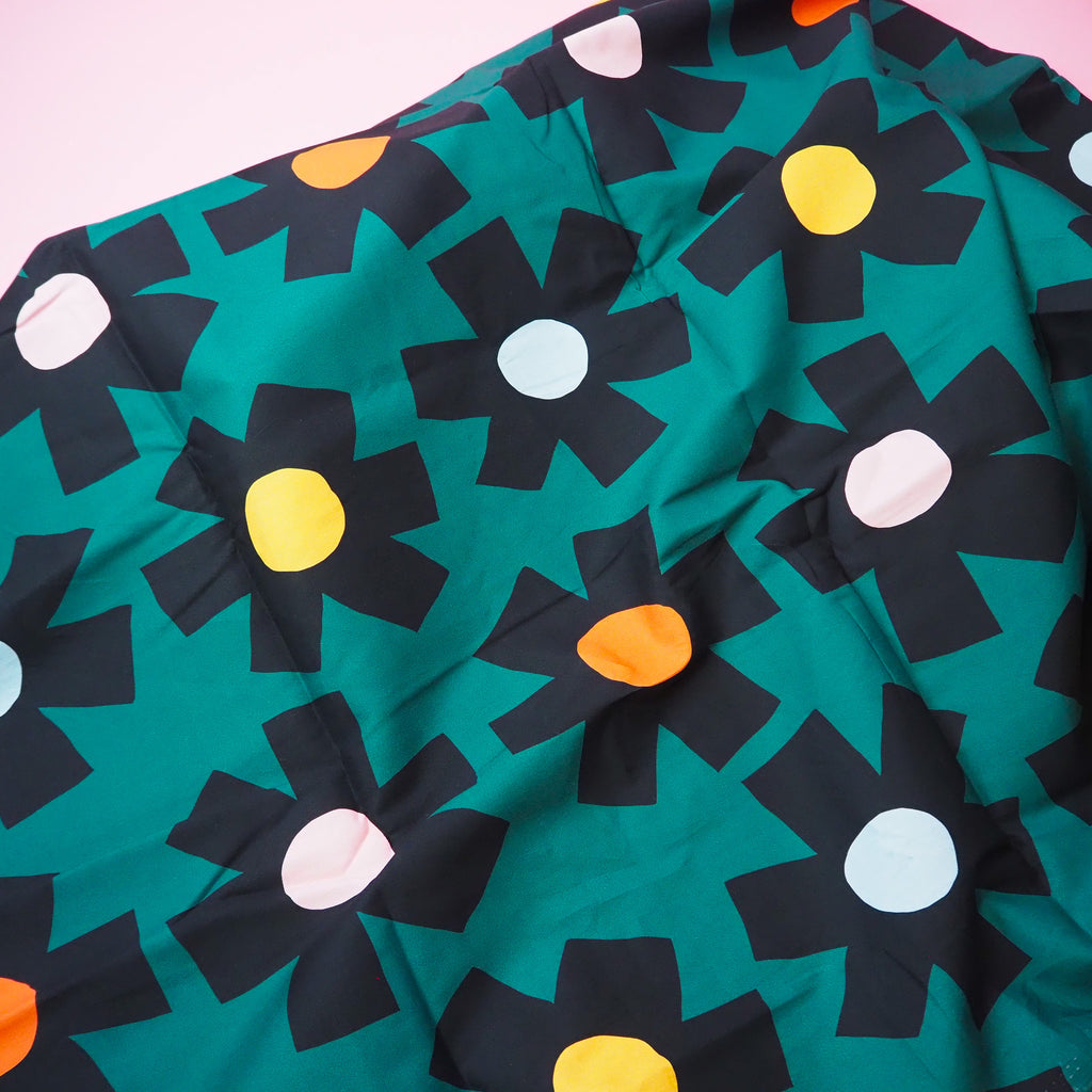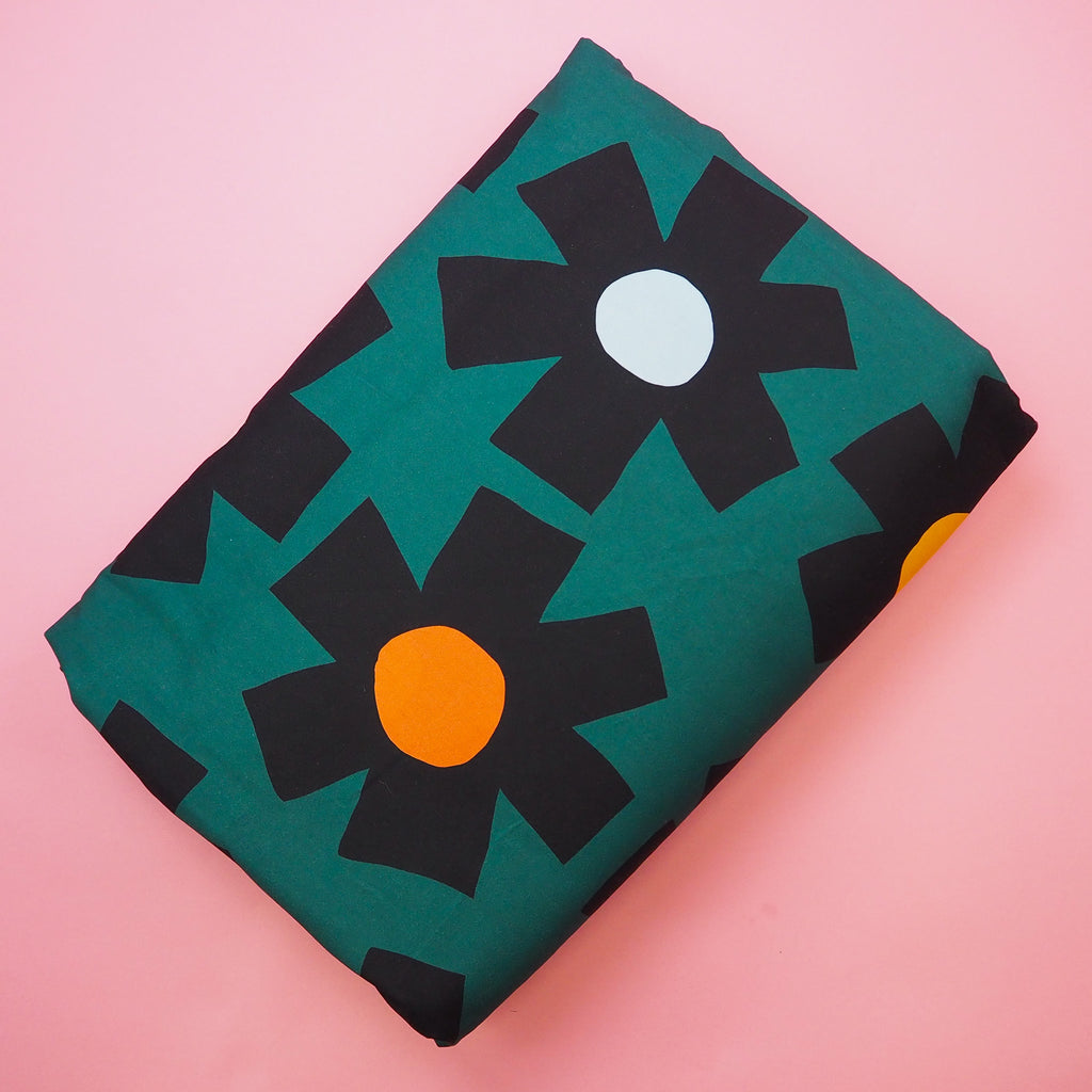 Beautiful large scale floral print on a dark green background from designer Jennifer Bouron. Imported from Nerida Hansen, based in Australia, this statement print is great for all sorts of projects.