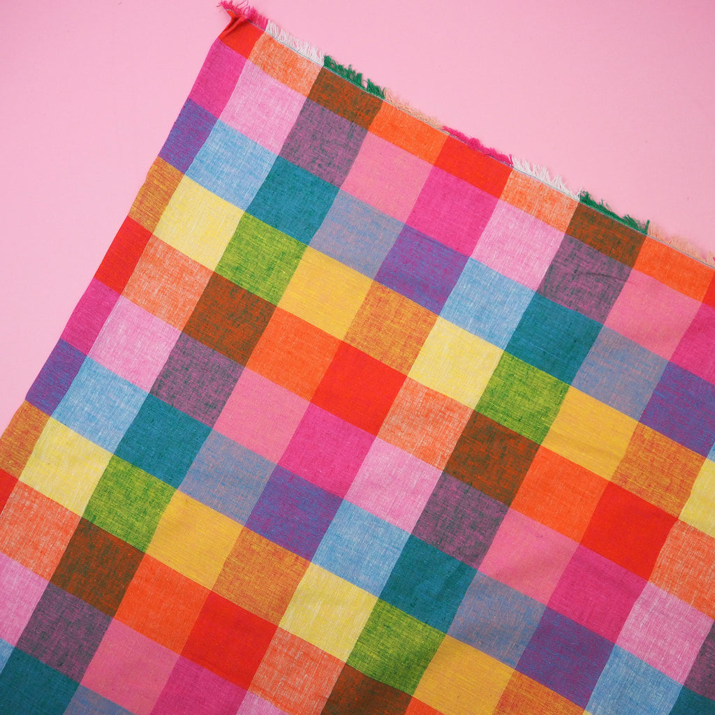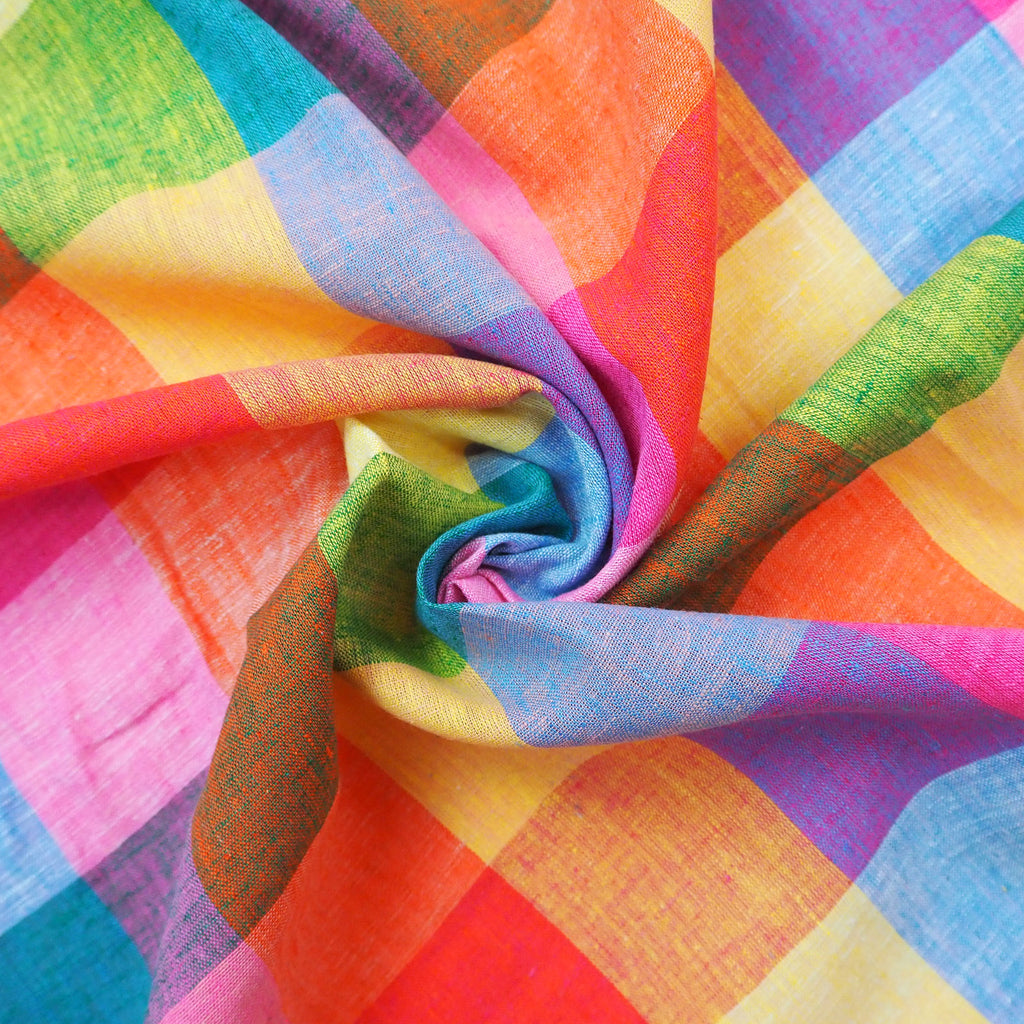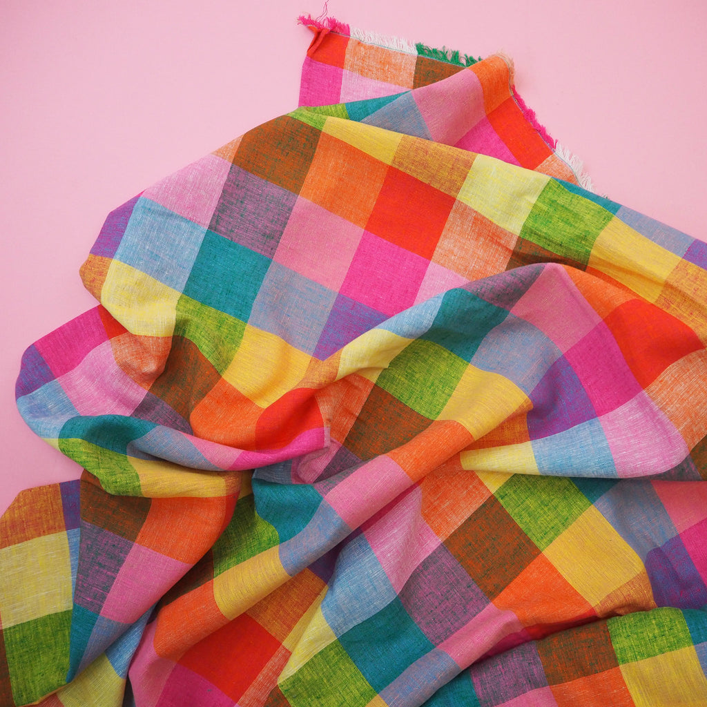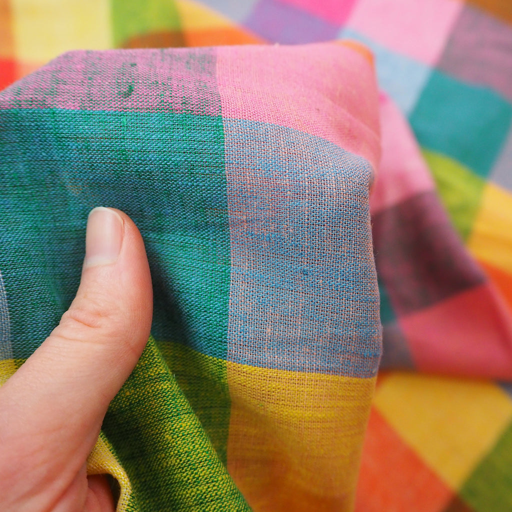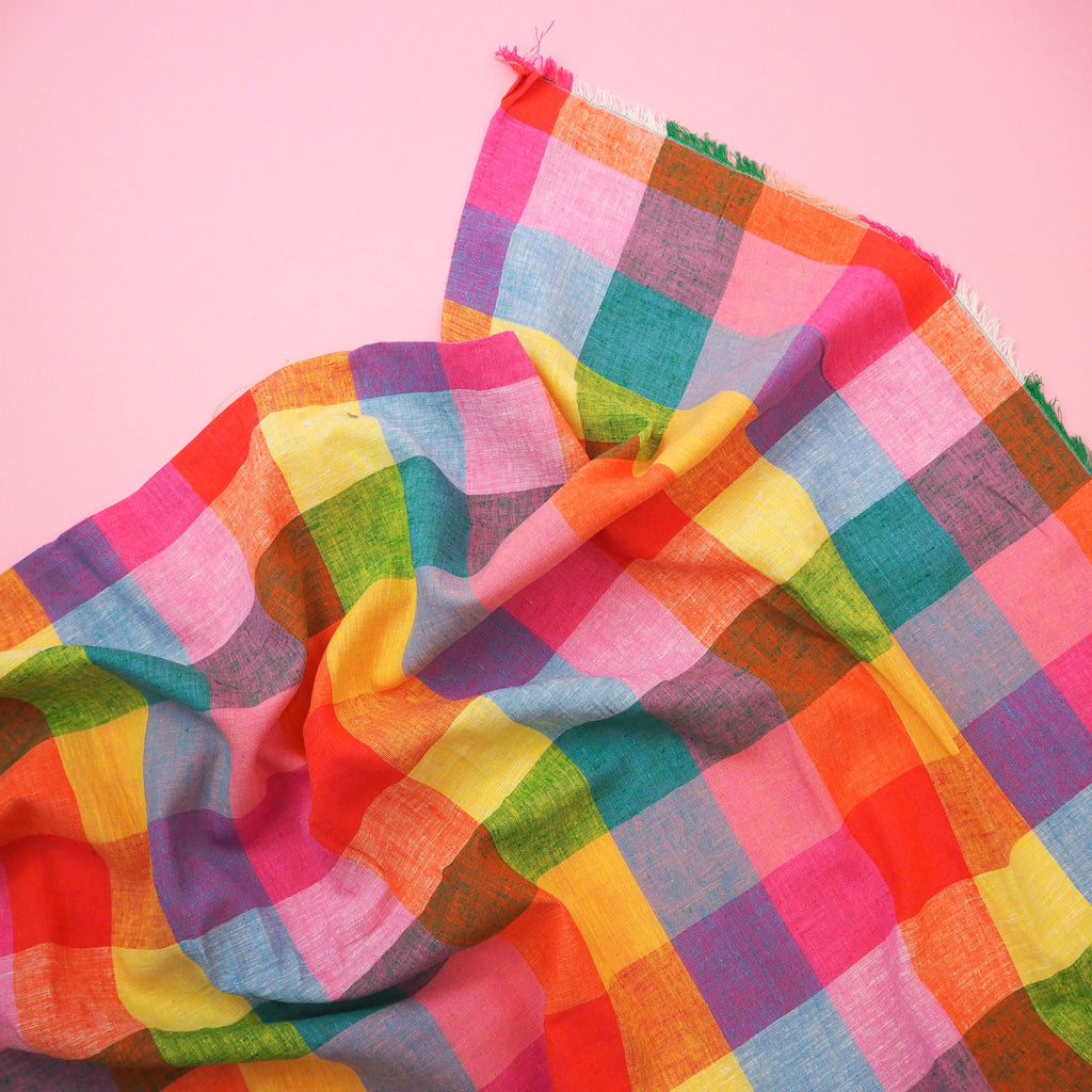 A beautiful linen cotton blend of yarn dyed gingham in tropical shades!