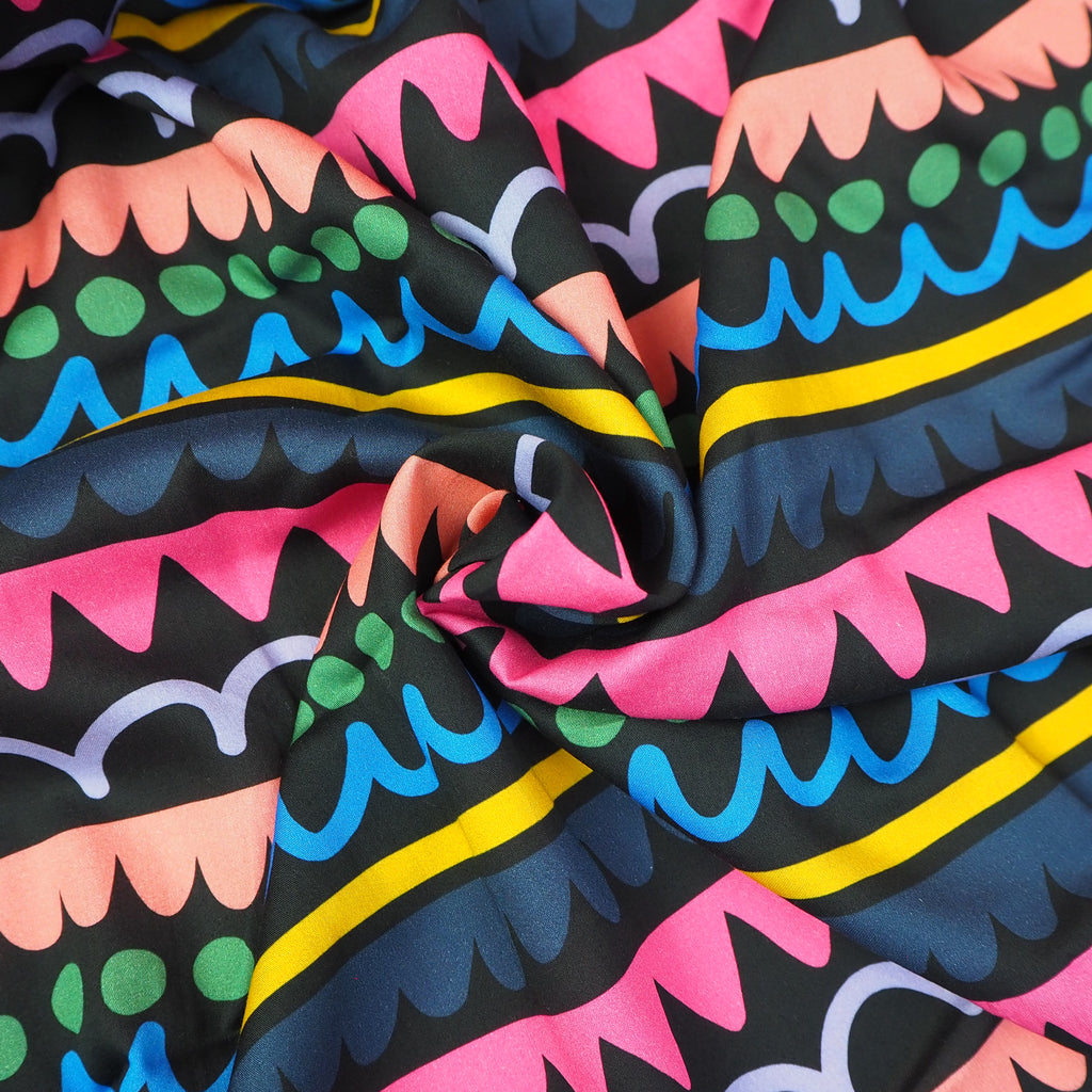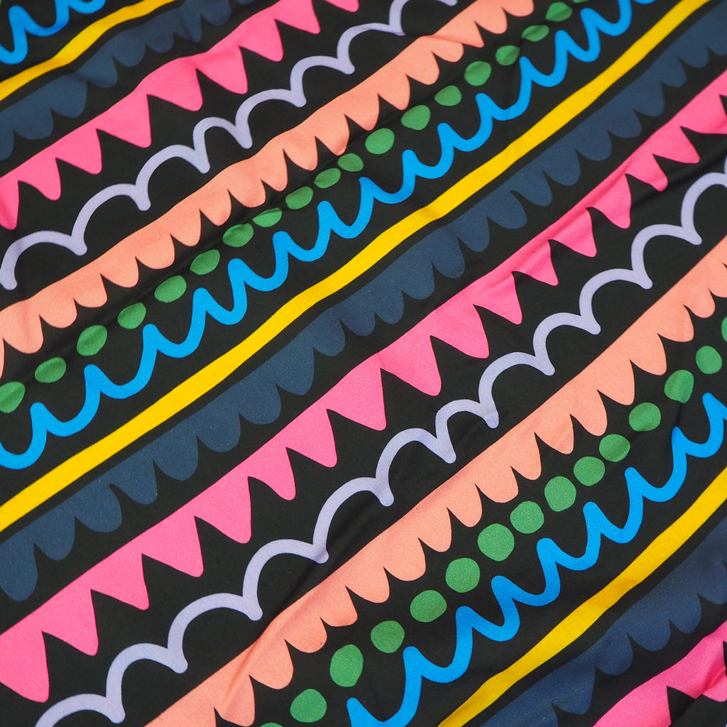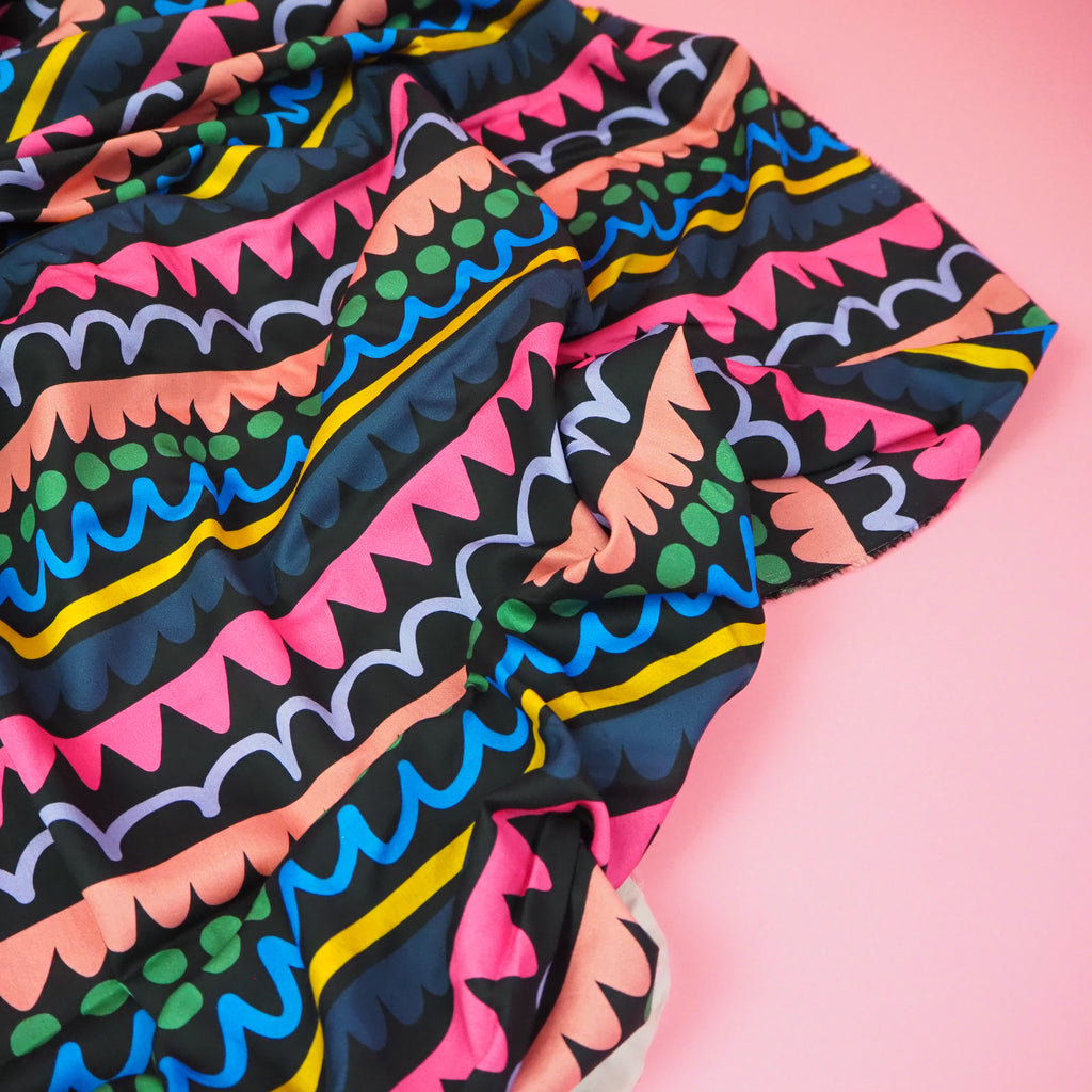 Colourful wiggles and squiggles on a black backdrop designed and printed by Jigger Jagger Studio.