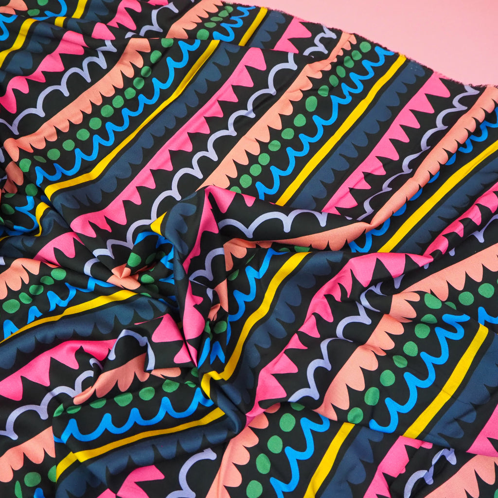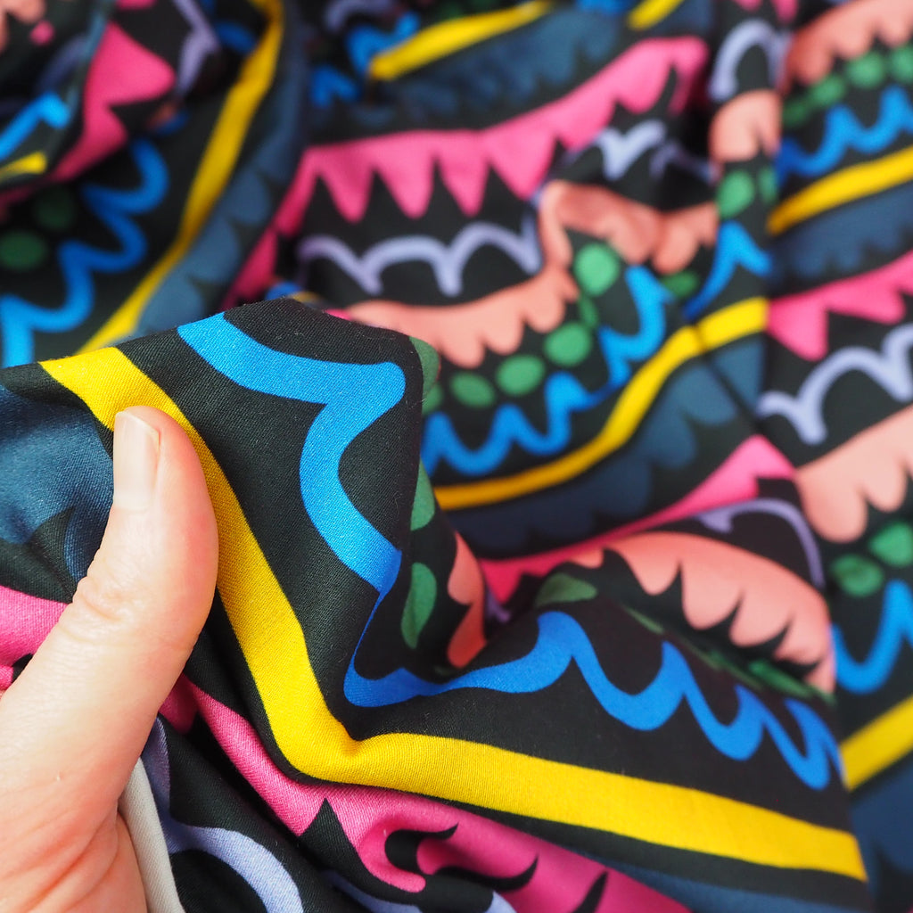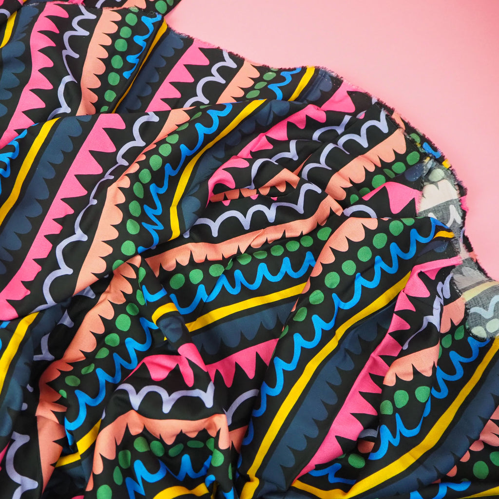 Colourful wiggles and squiggles on a black backdrop designed and printed by Jigger Jagger Studio.